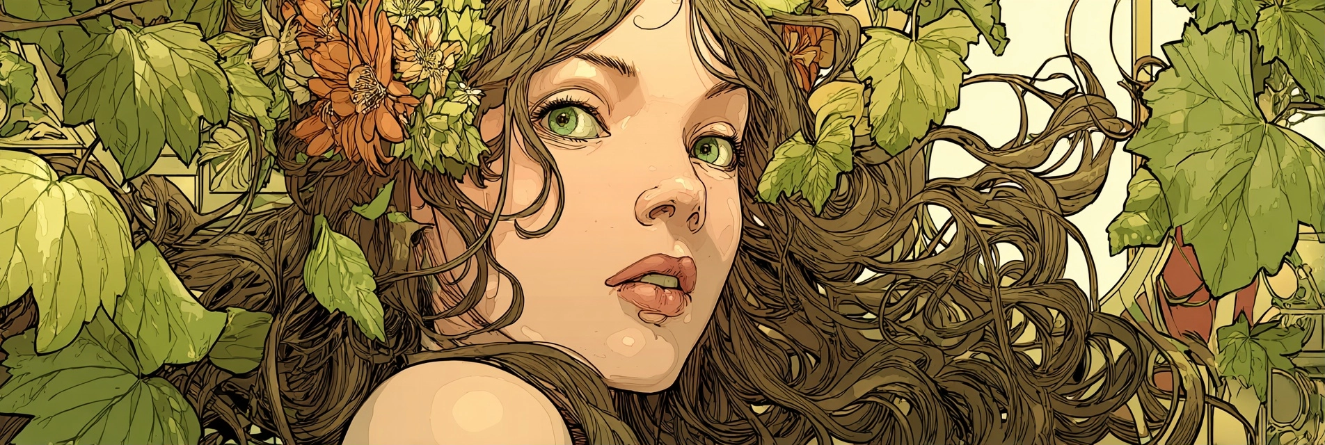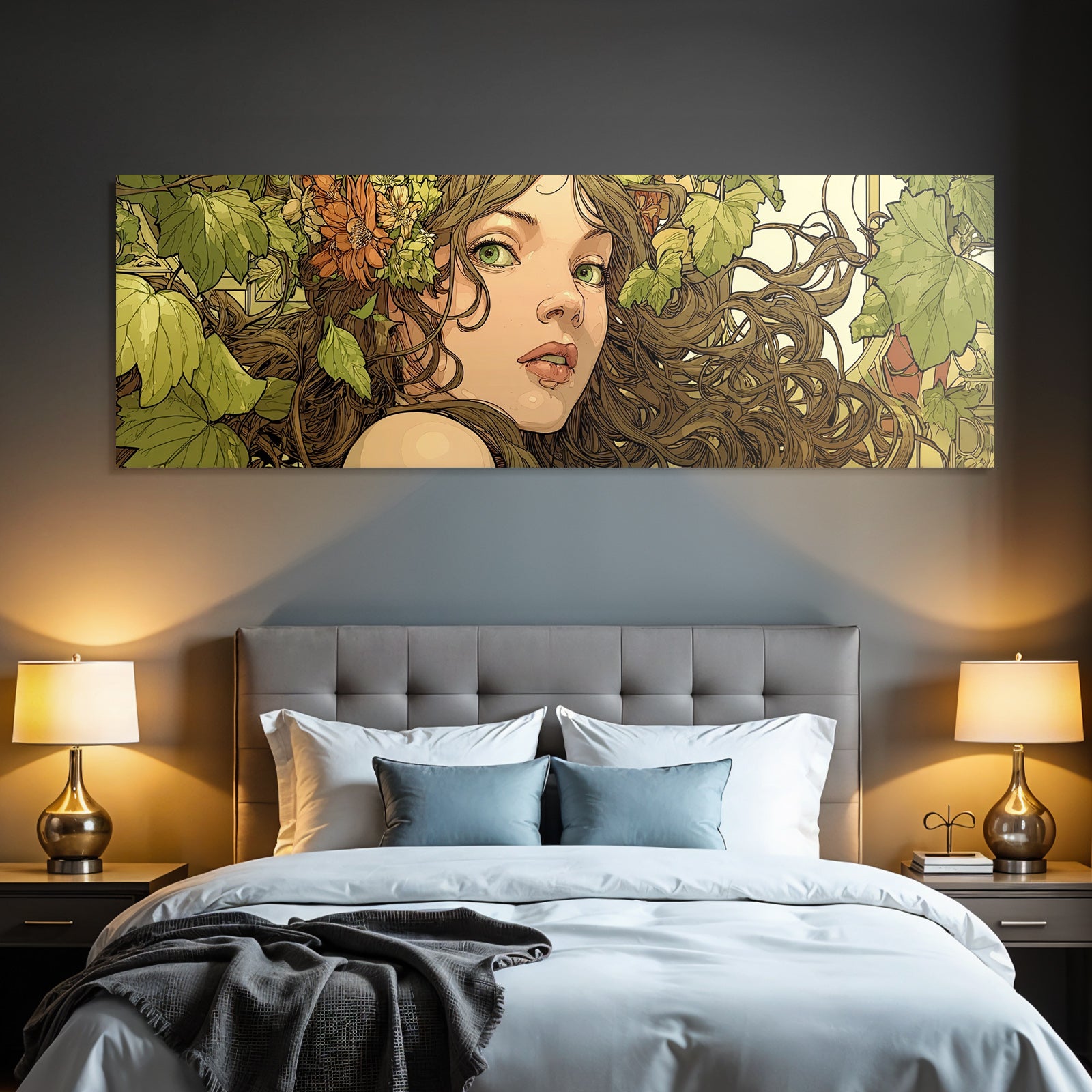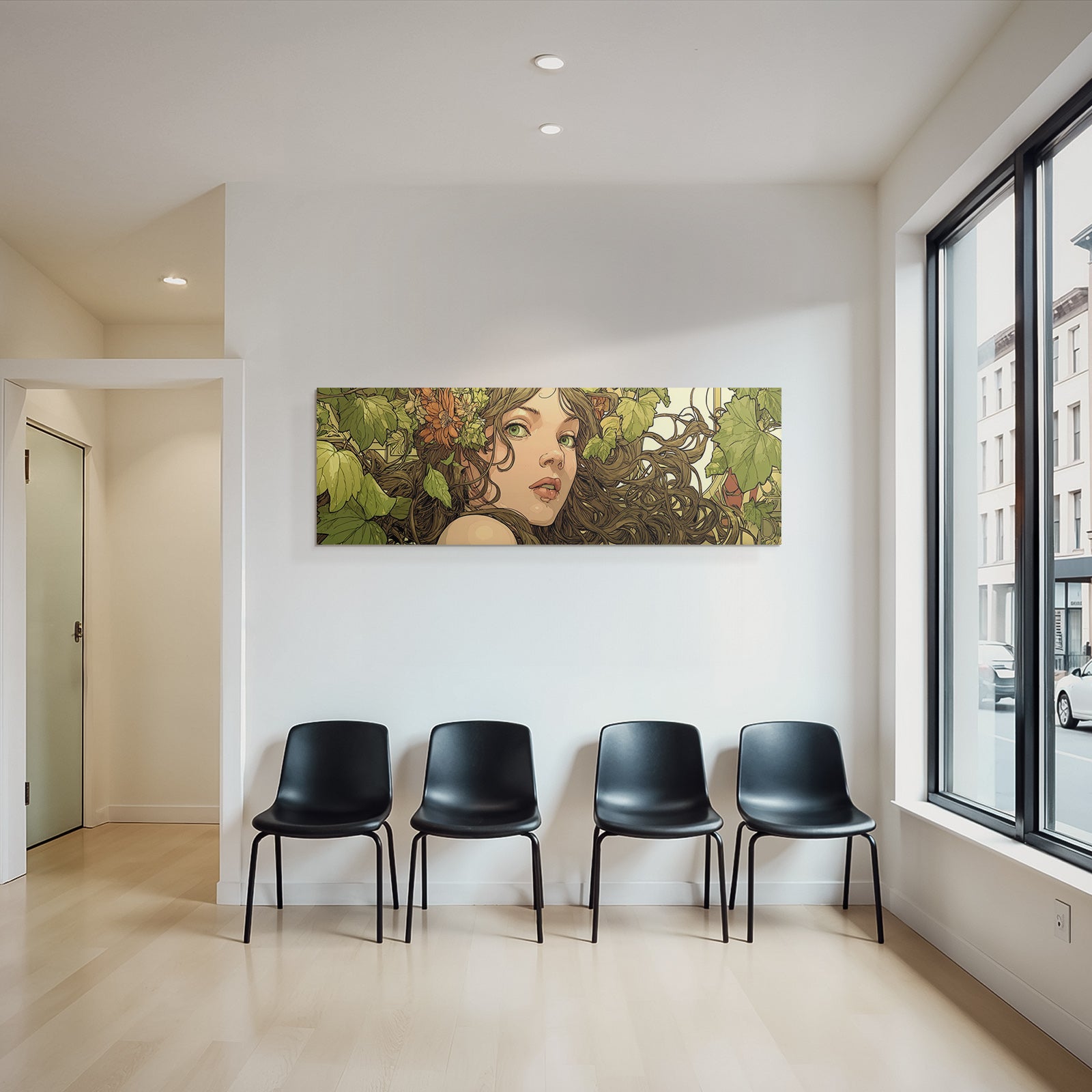 Ein einzigartiges Kunstwerk der Produktlinie FameFrame™ mit dem Titel „Frau Mit Blattwerk Und Blüten“, im Stil Jugendstil.