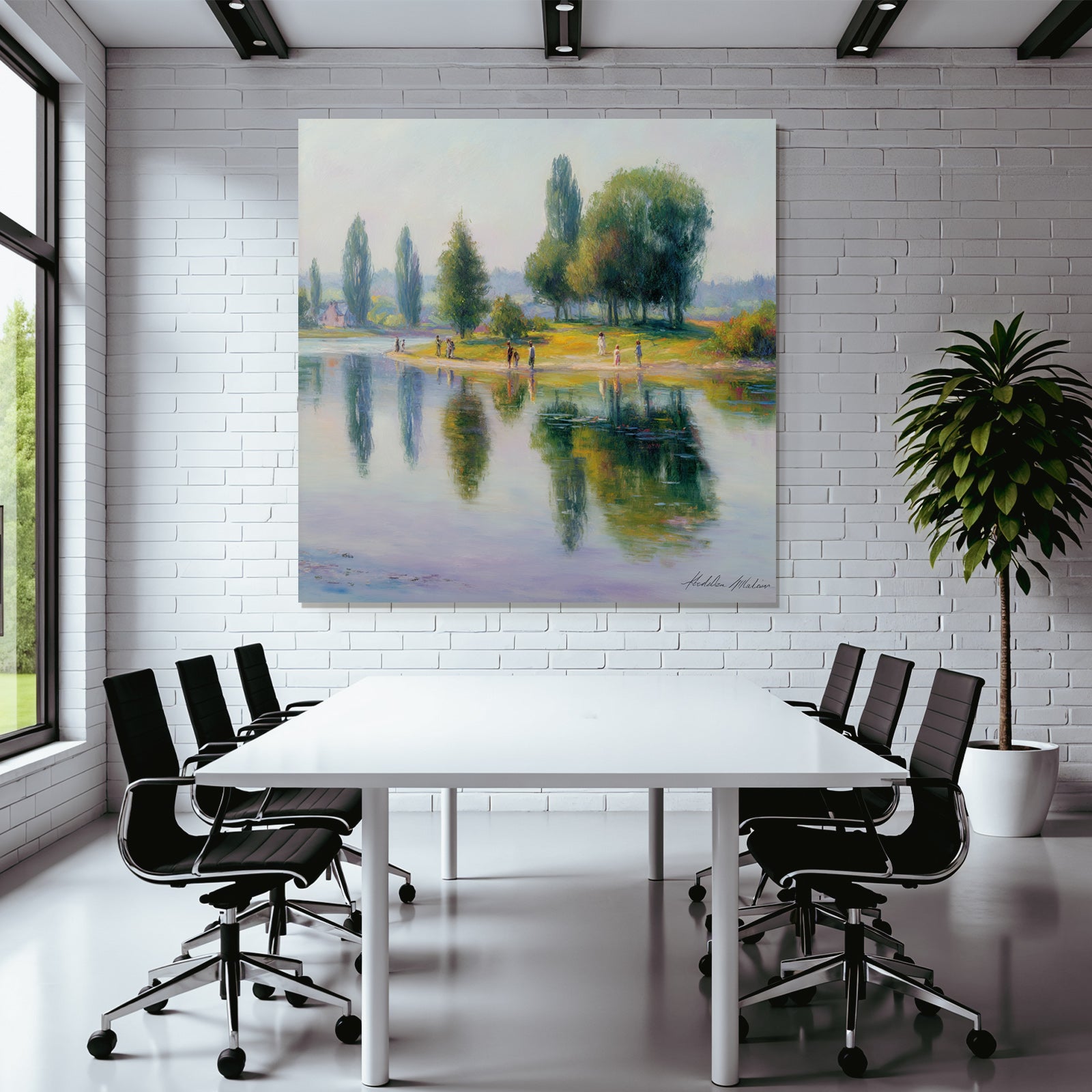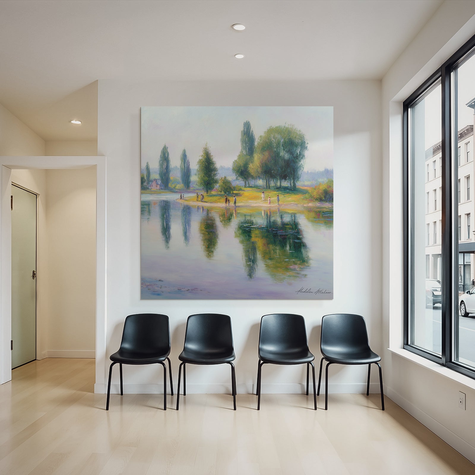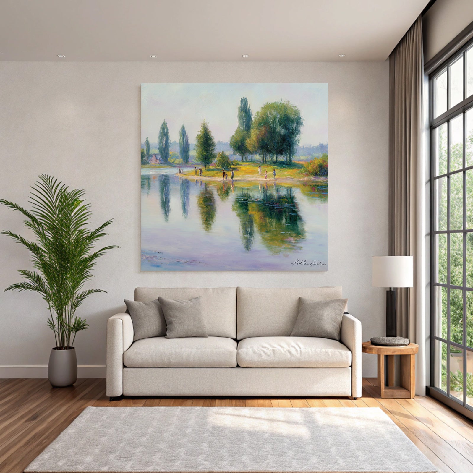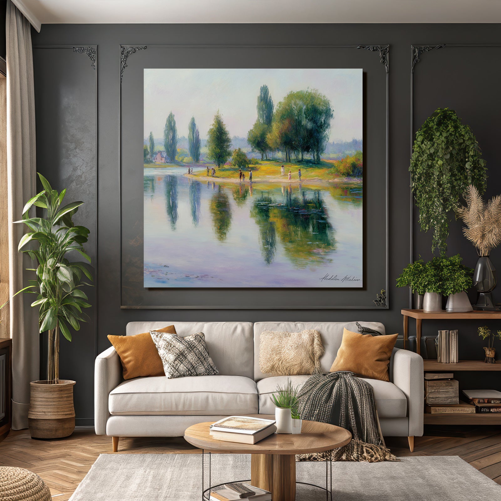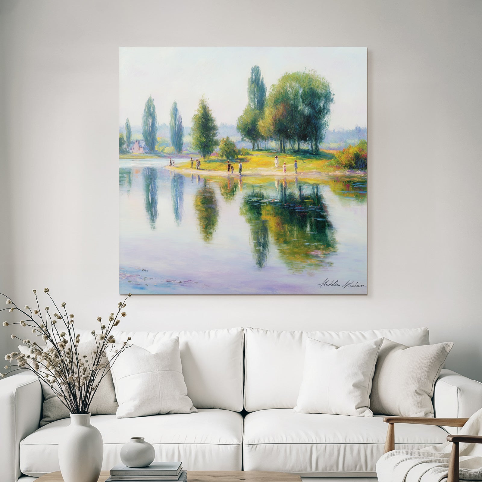 Mit dem Werk „Friedliche Landschaft Am Seeufer Mit Spaziergängern“ im Stil Jugendstil gestaltest Du Dein Wartezimmer oder Deine Hotel-Lobby eindrucksvoll und modern – auf Stoff im FameFrame™.