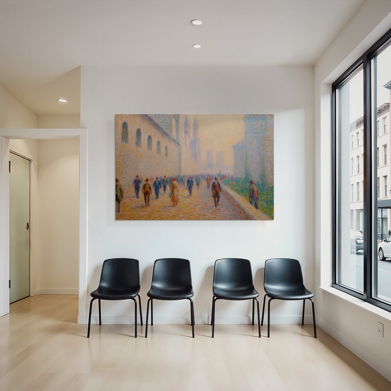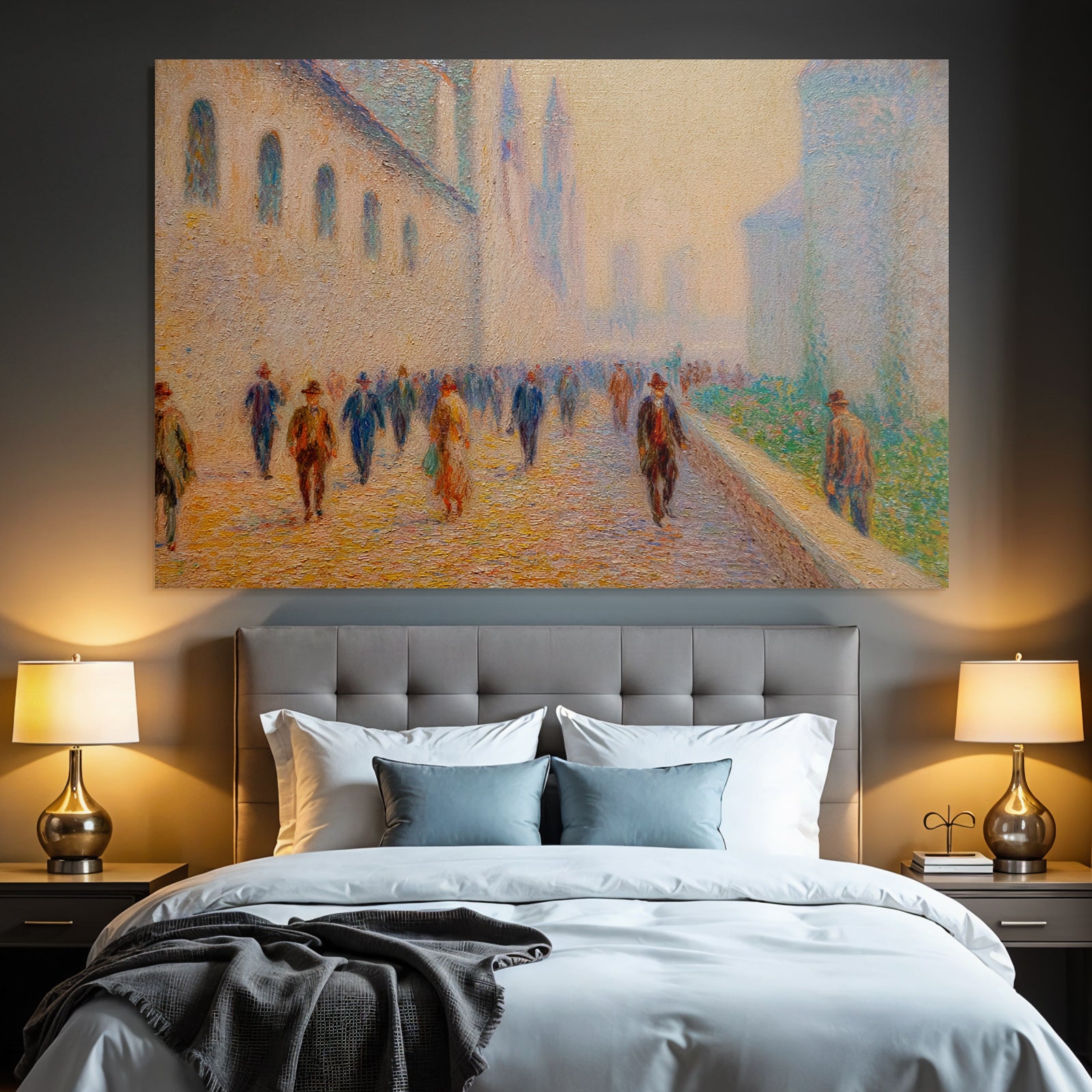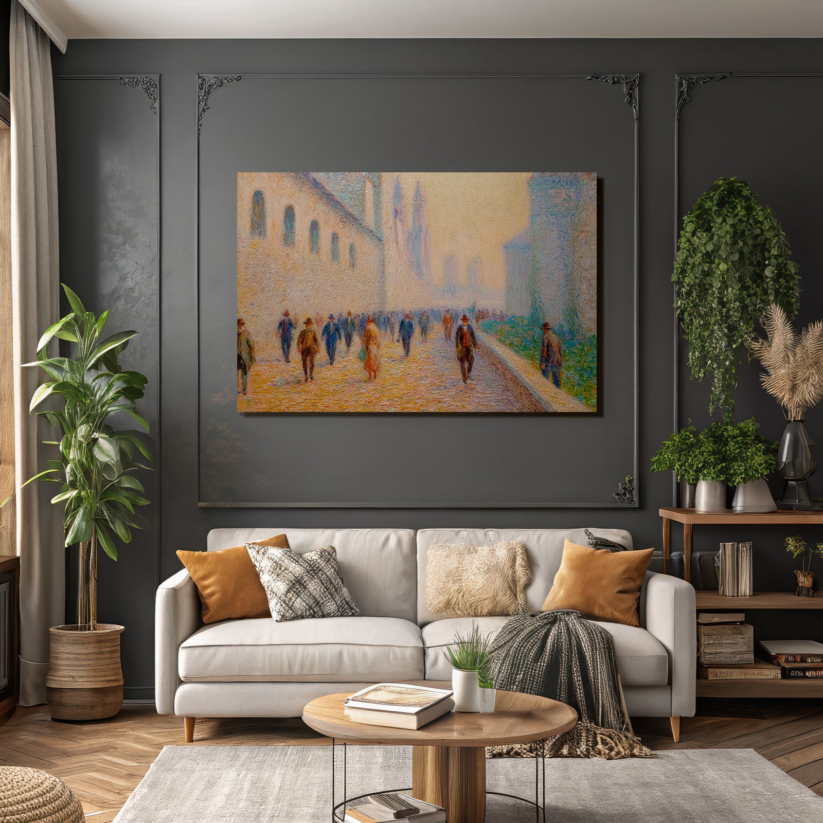 „Impressionistische Strassenszene Mit Spaziergängern“ im Stil Jugendstil sorgt für stilvolle Ruhe im Schlafzimmer oder inspirierende Energie im Büro – perfekt im FameFrame™ inszeniert.