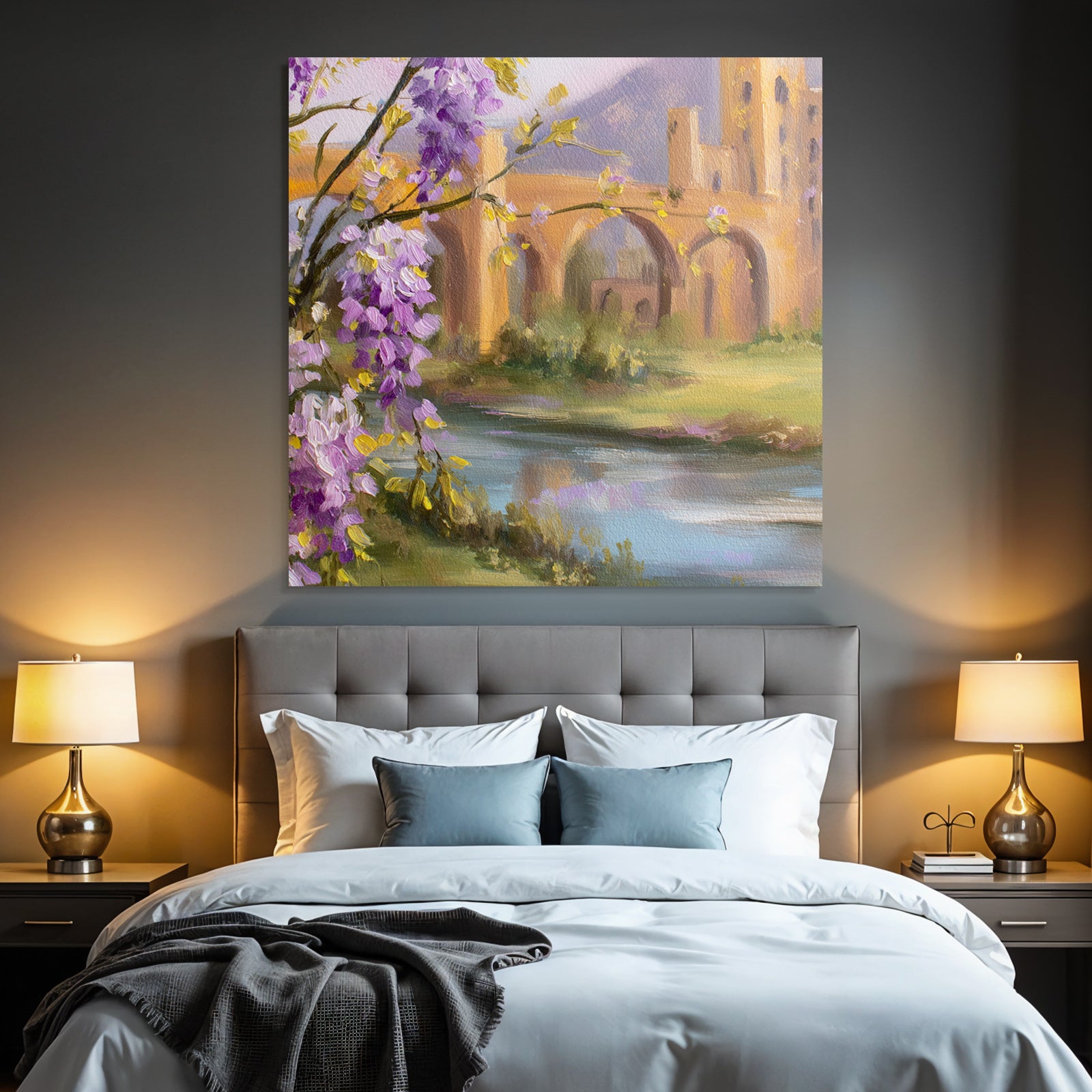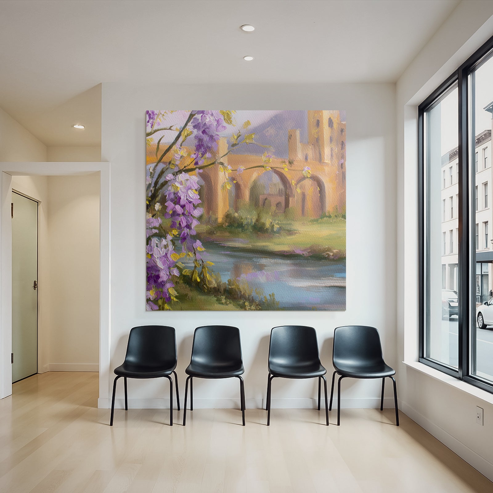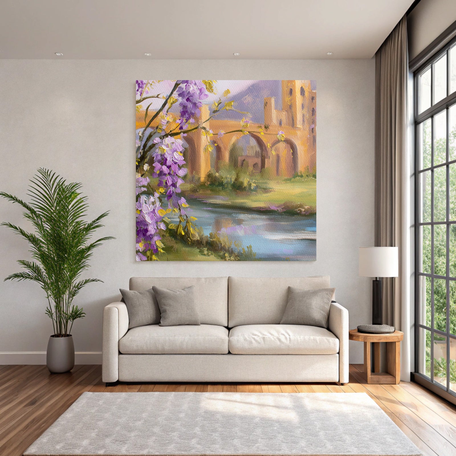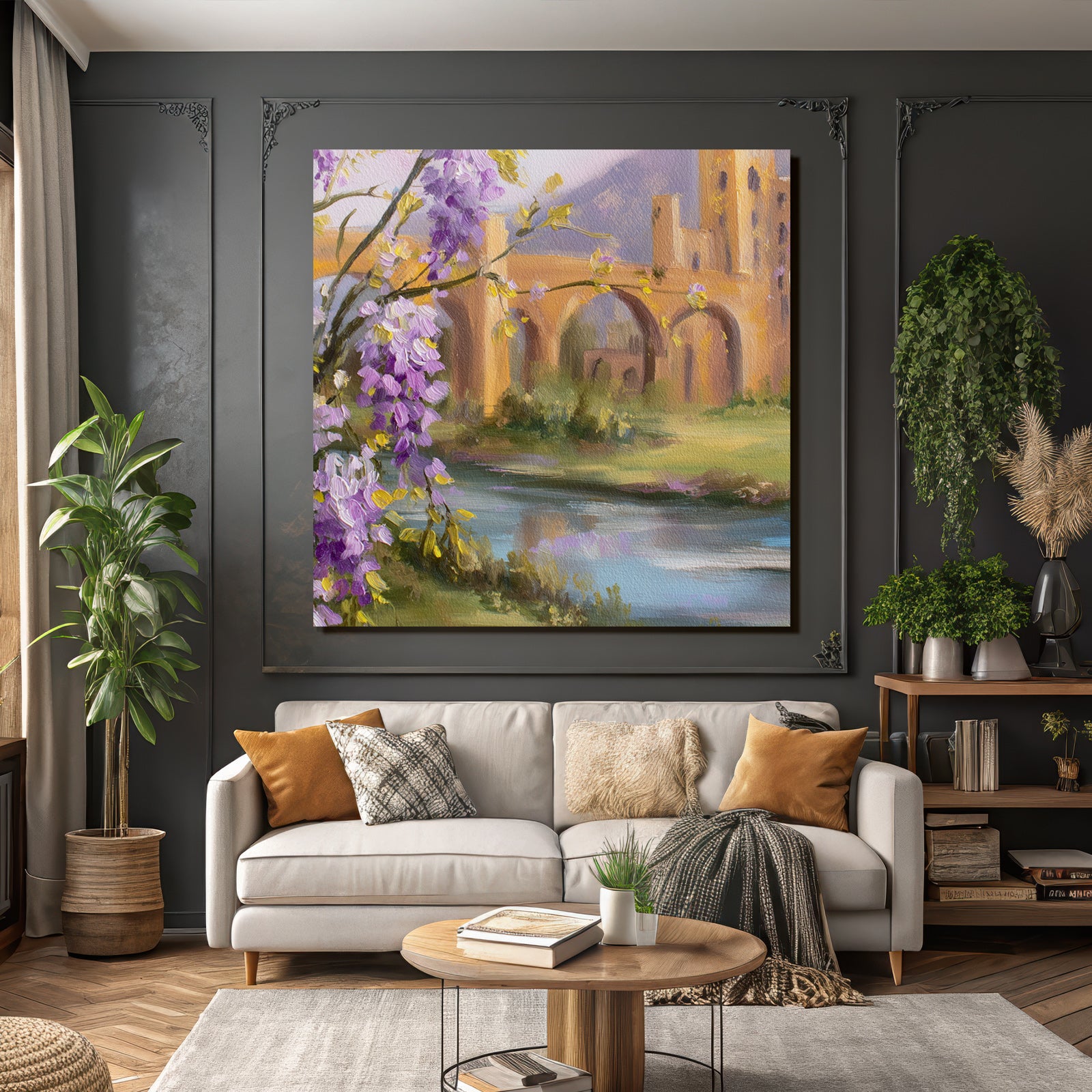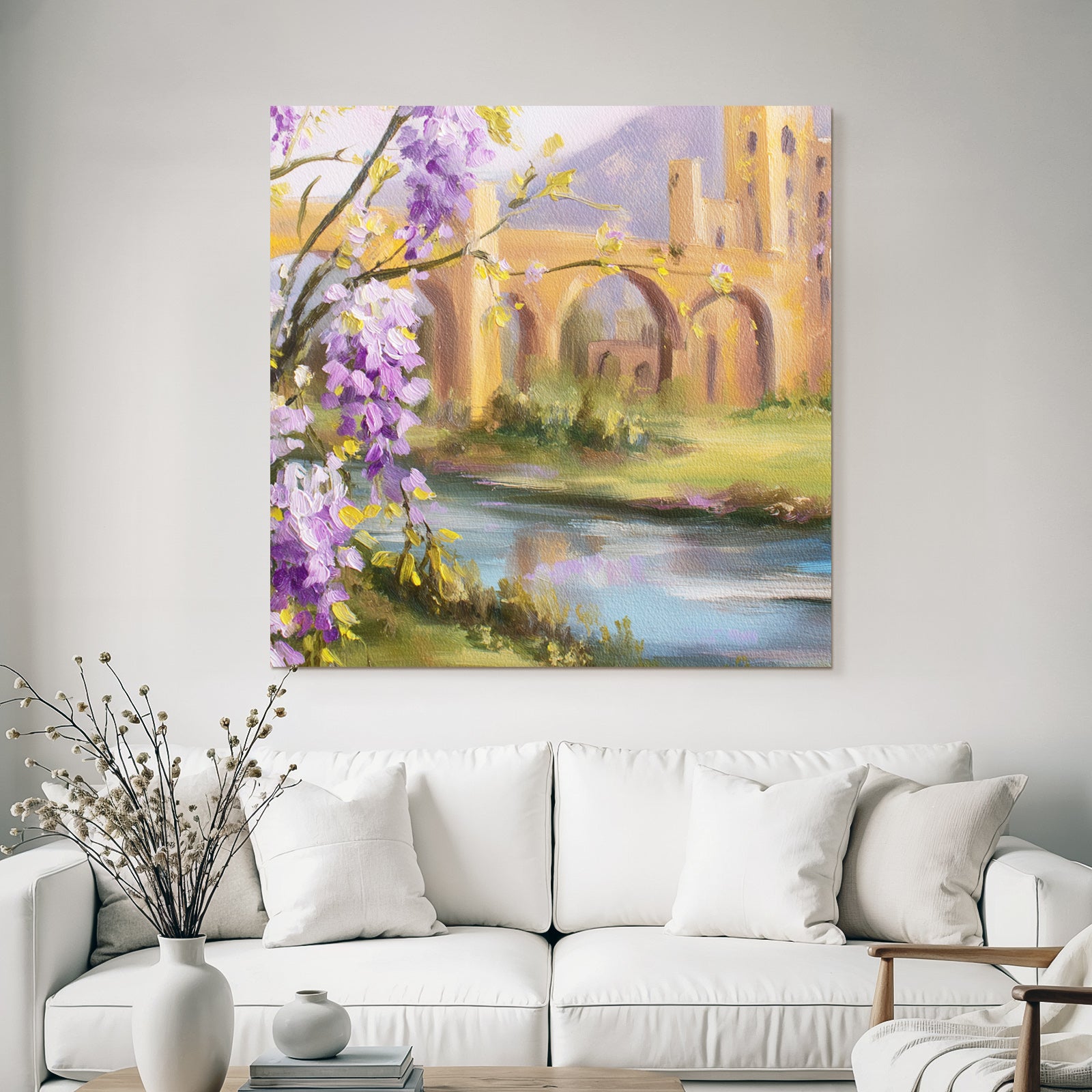 Ein Highlight für Wohnzimmer, Studio oder Empfangsbereich: „Landschaftsgemälde Mit Blumen Wasser Und Architektur“ bringt den Stil Jugendstil auf Stoff – gespannt im edlen FameFrame™.