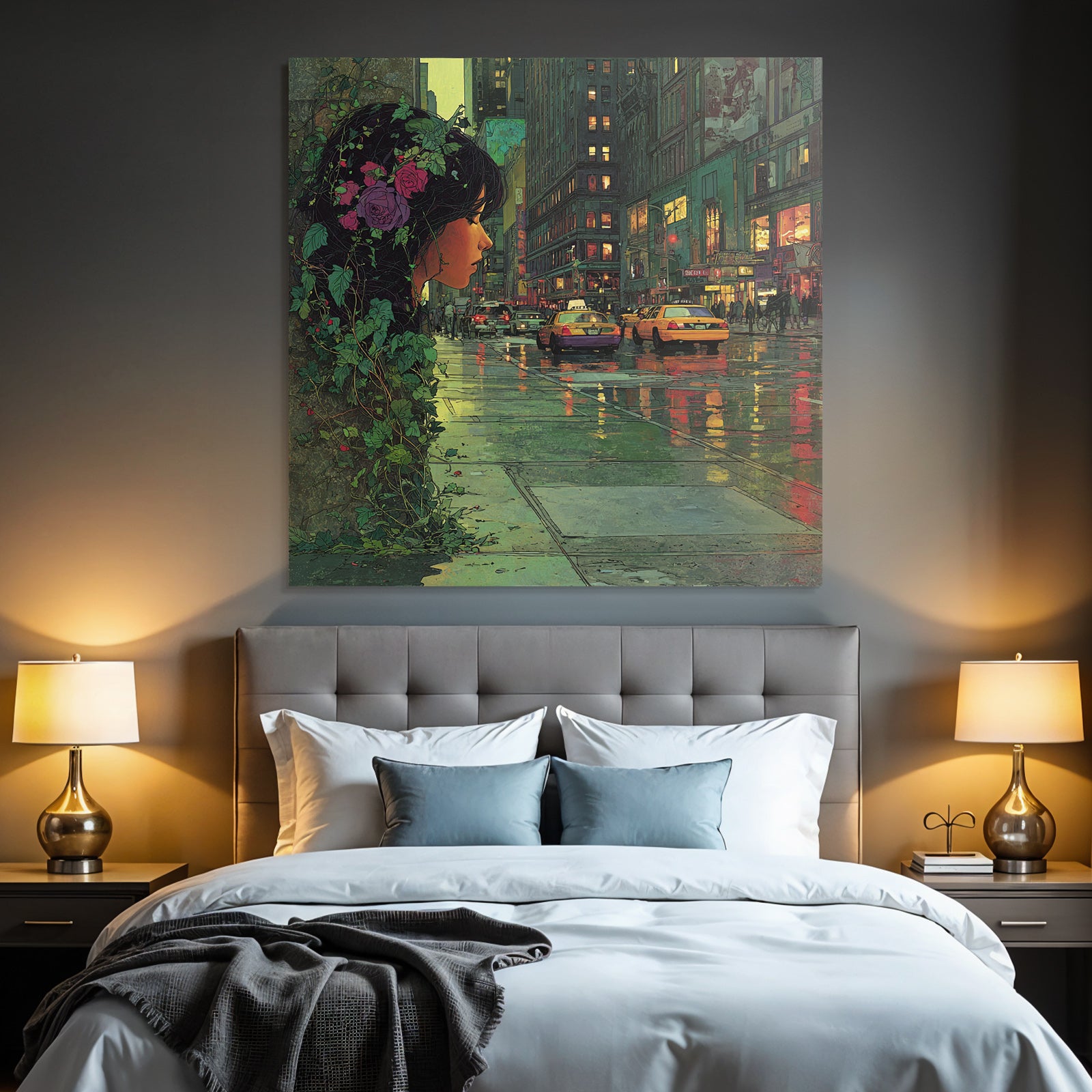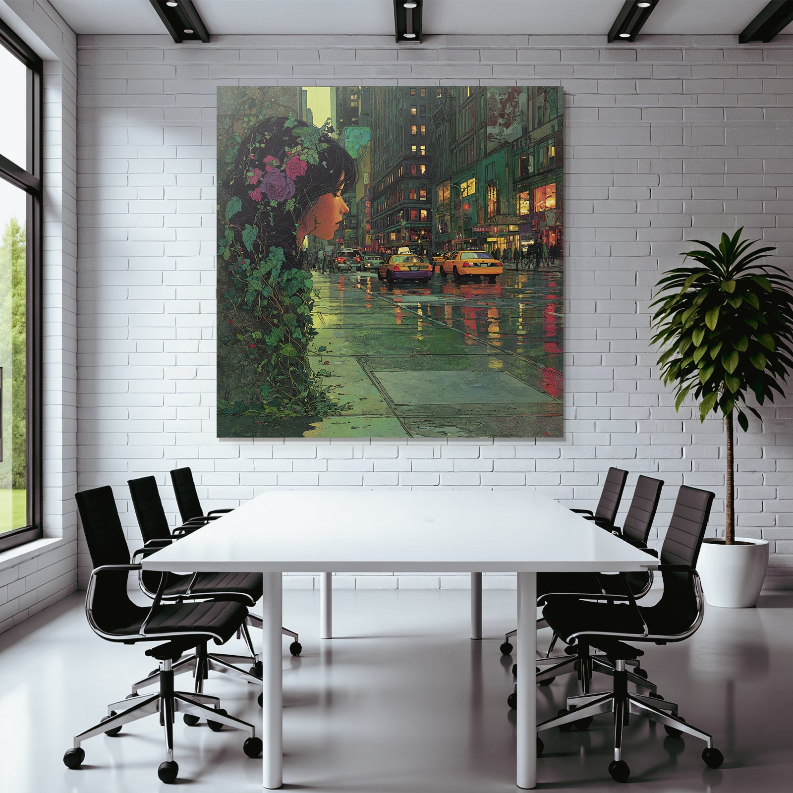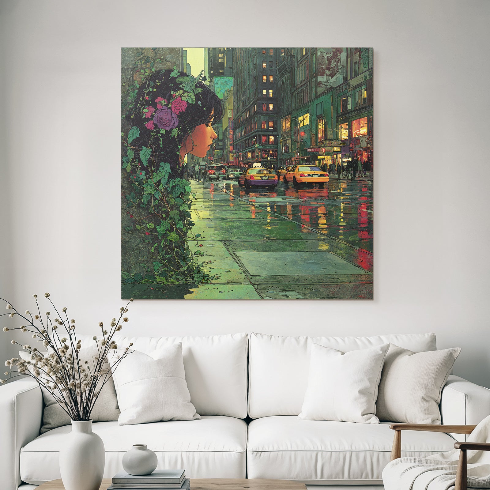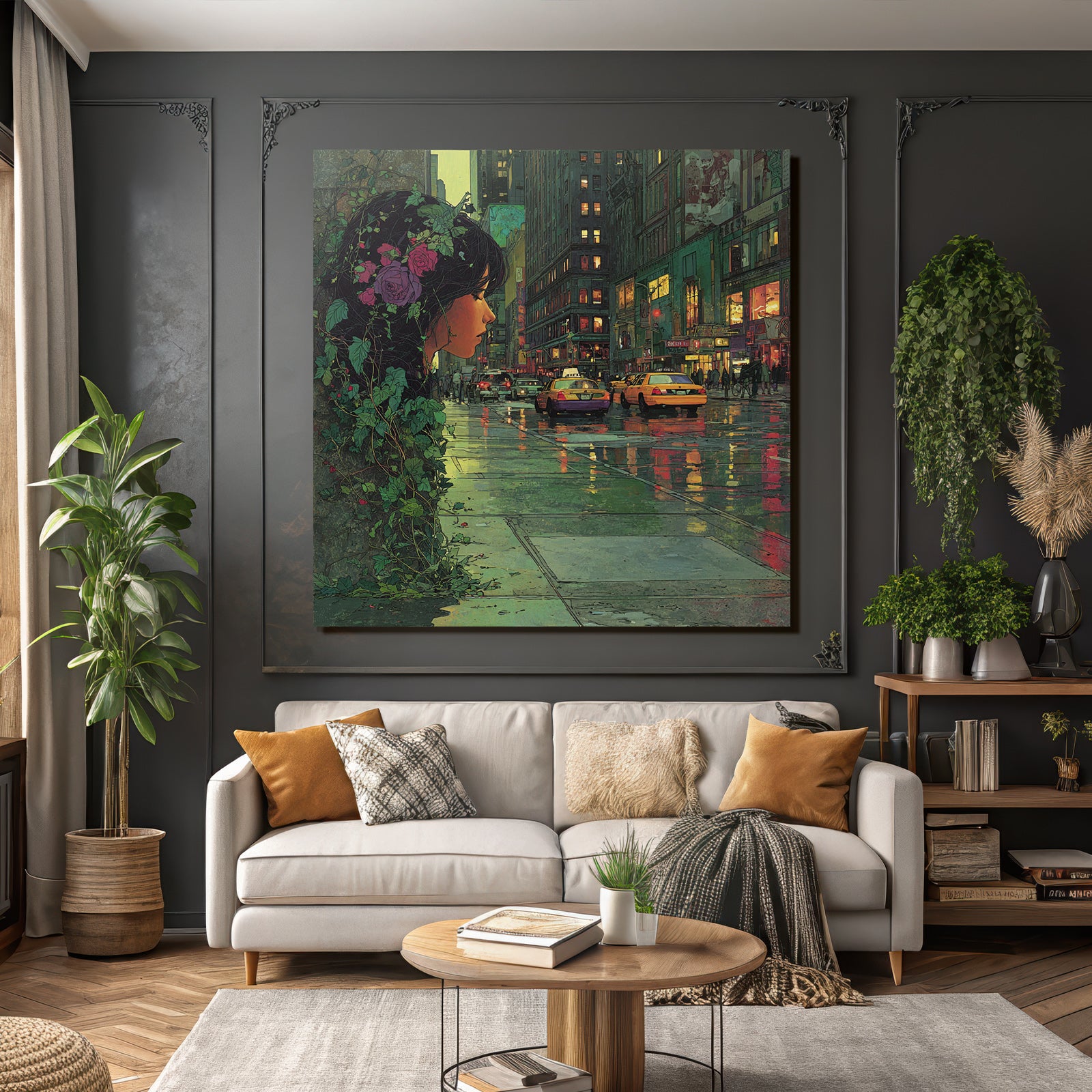 Ob für eine exklusive Boutique, ein modernes Restaurant oder Ihr Esszimmer – „Menschliche Silhoütte Mit Rankengewächsen In Regennasser Stadt“ im Jugendstil-Design schafft im FameFrame™ ein unvergessliches Ambiente.