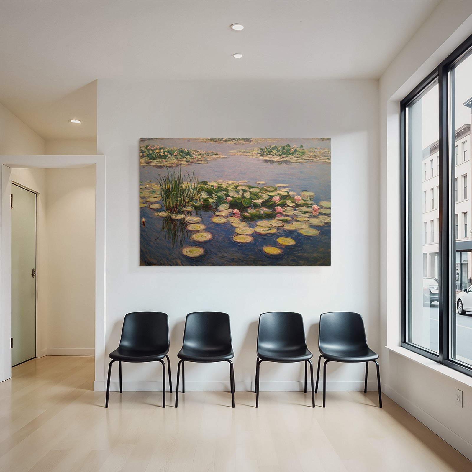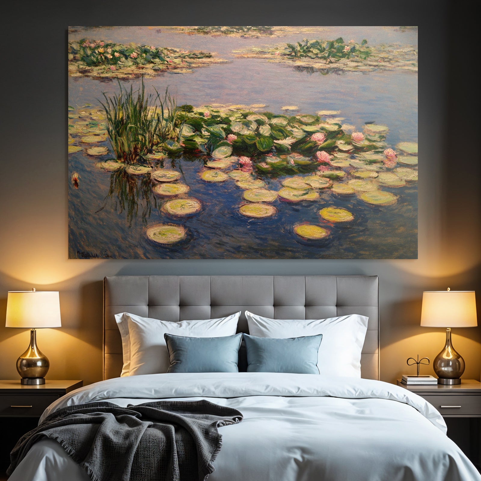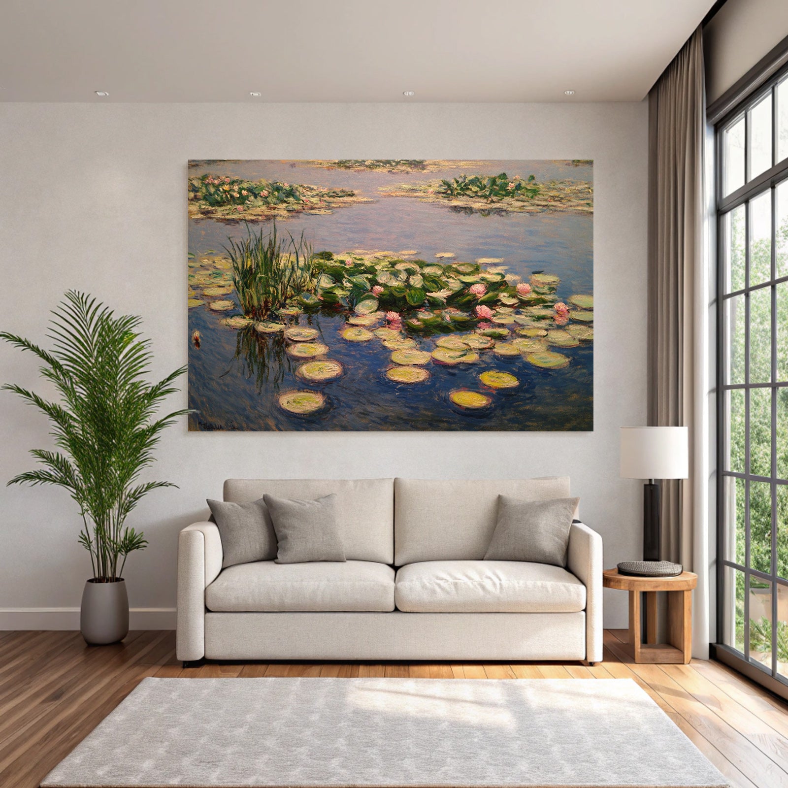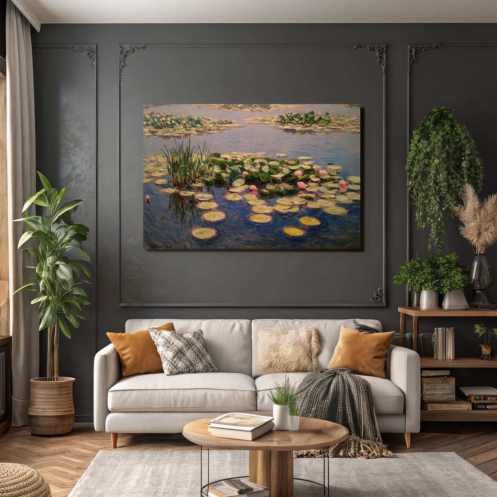 „Seerosen Im Impressionistischen Teich“ verleiht Ihrem Raum Charakter. Die Anlehnung an den Stil Jugendstil, kombiniert mit der schlichten Eleganz des FameFrame™, schafft eine einzigartige Atmosphäre.