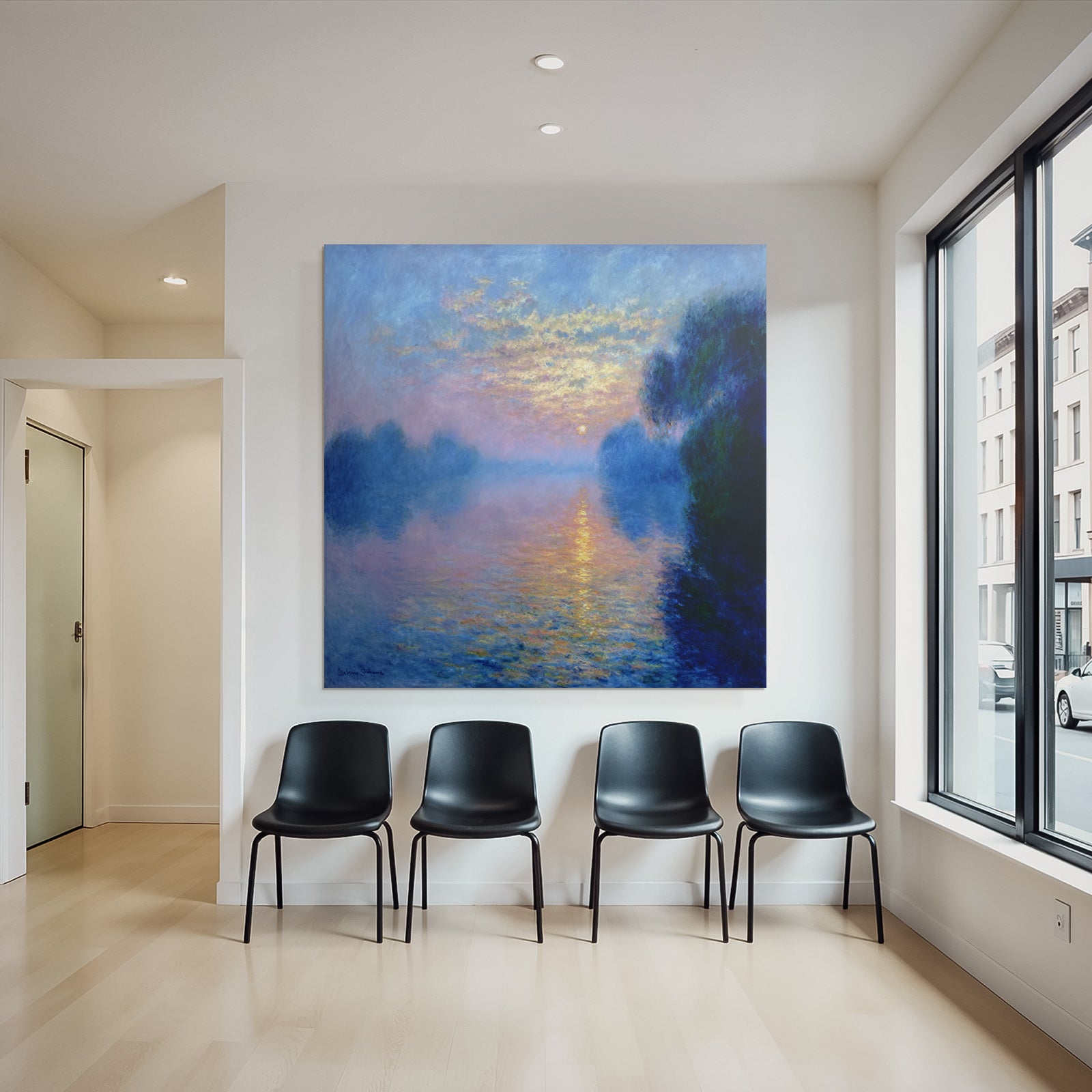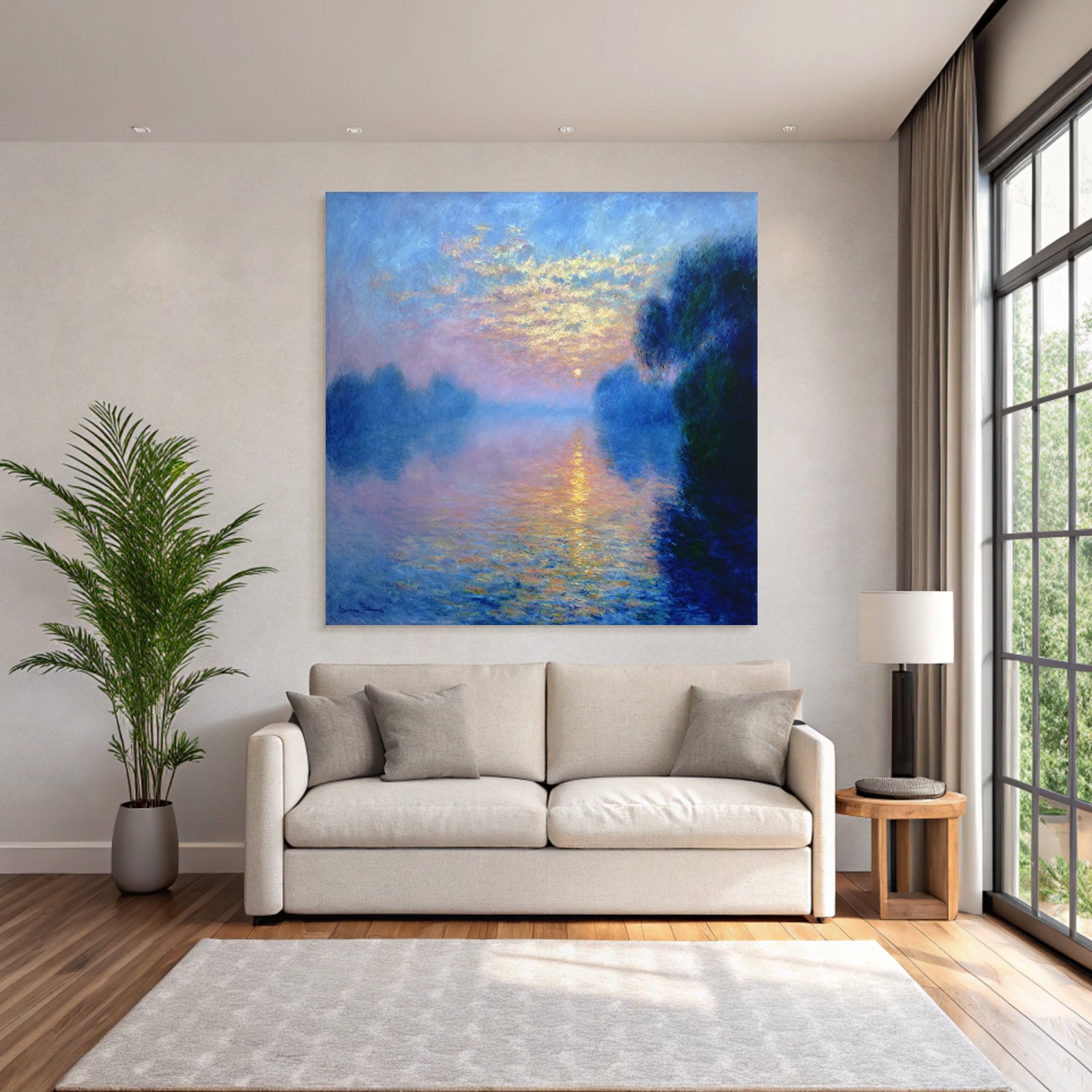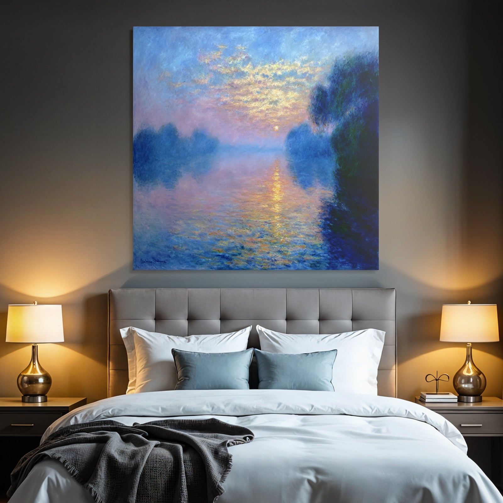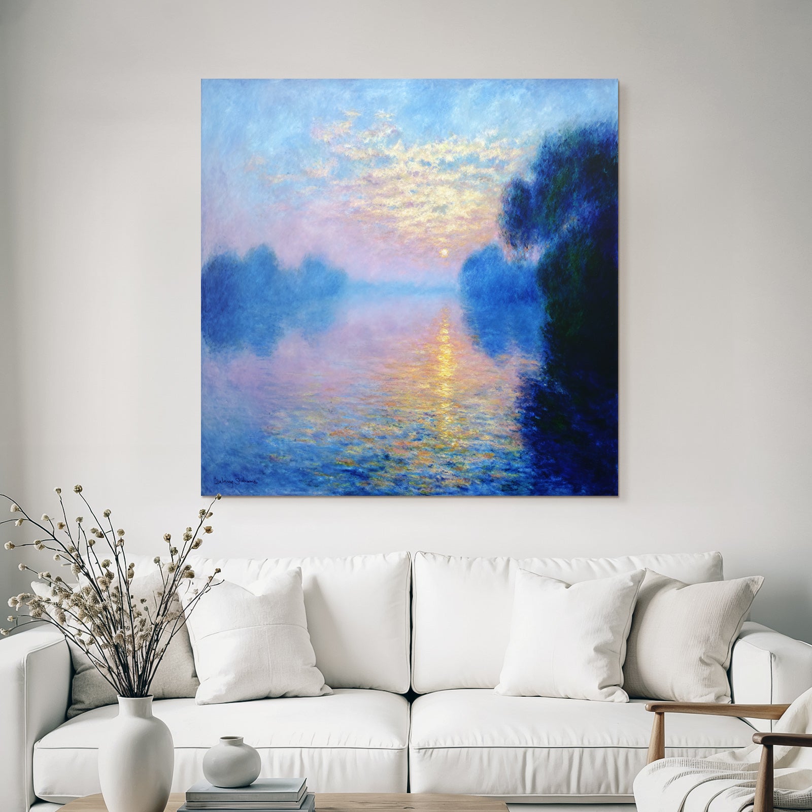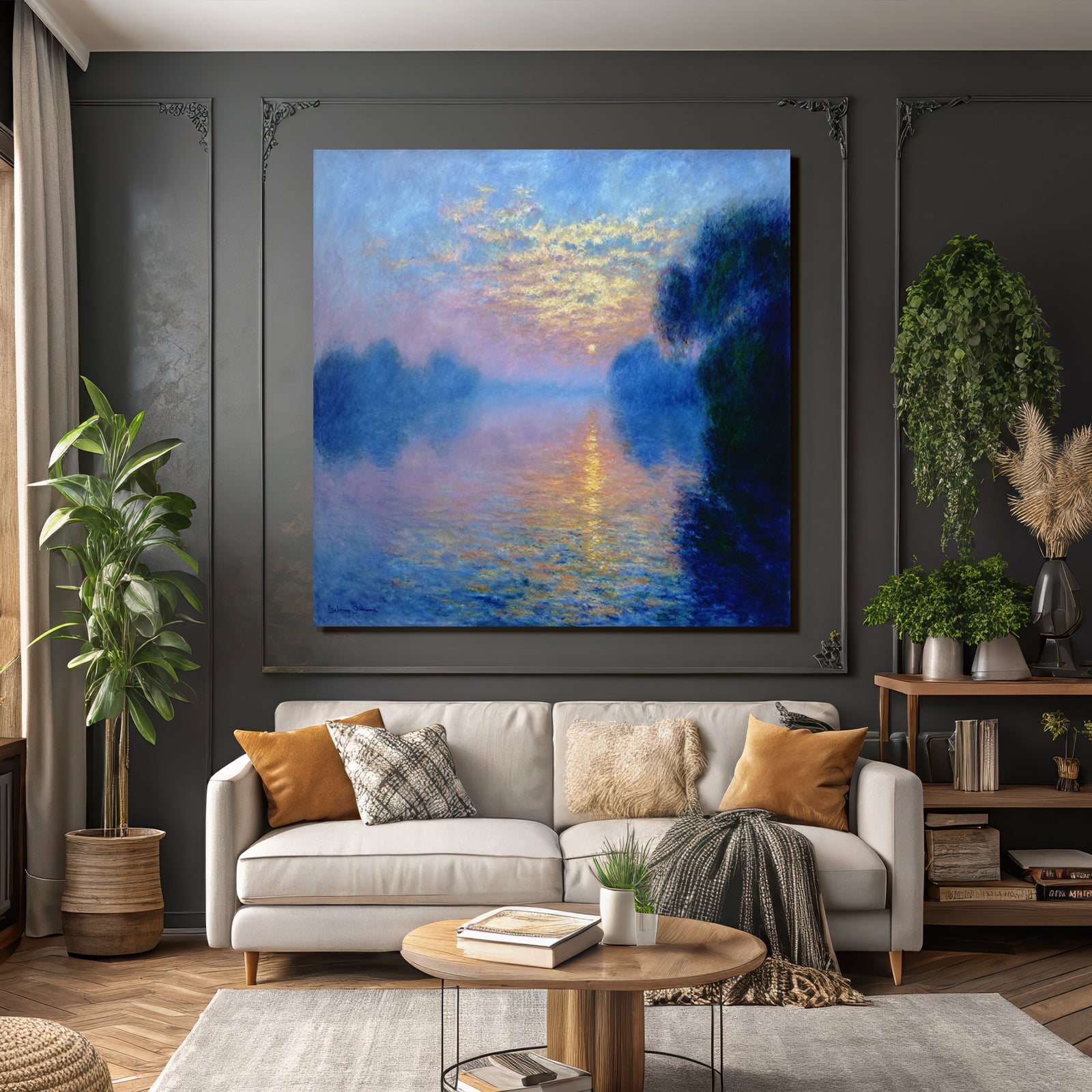 Setz ein Statement: „Sonnenuntergang Mit Nebligem Wasserspiegel“ im Stil Jugendstil wird im FameFrame™ zum echten Kunstobjekt an Deiner Wand.