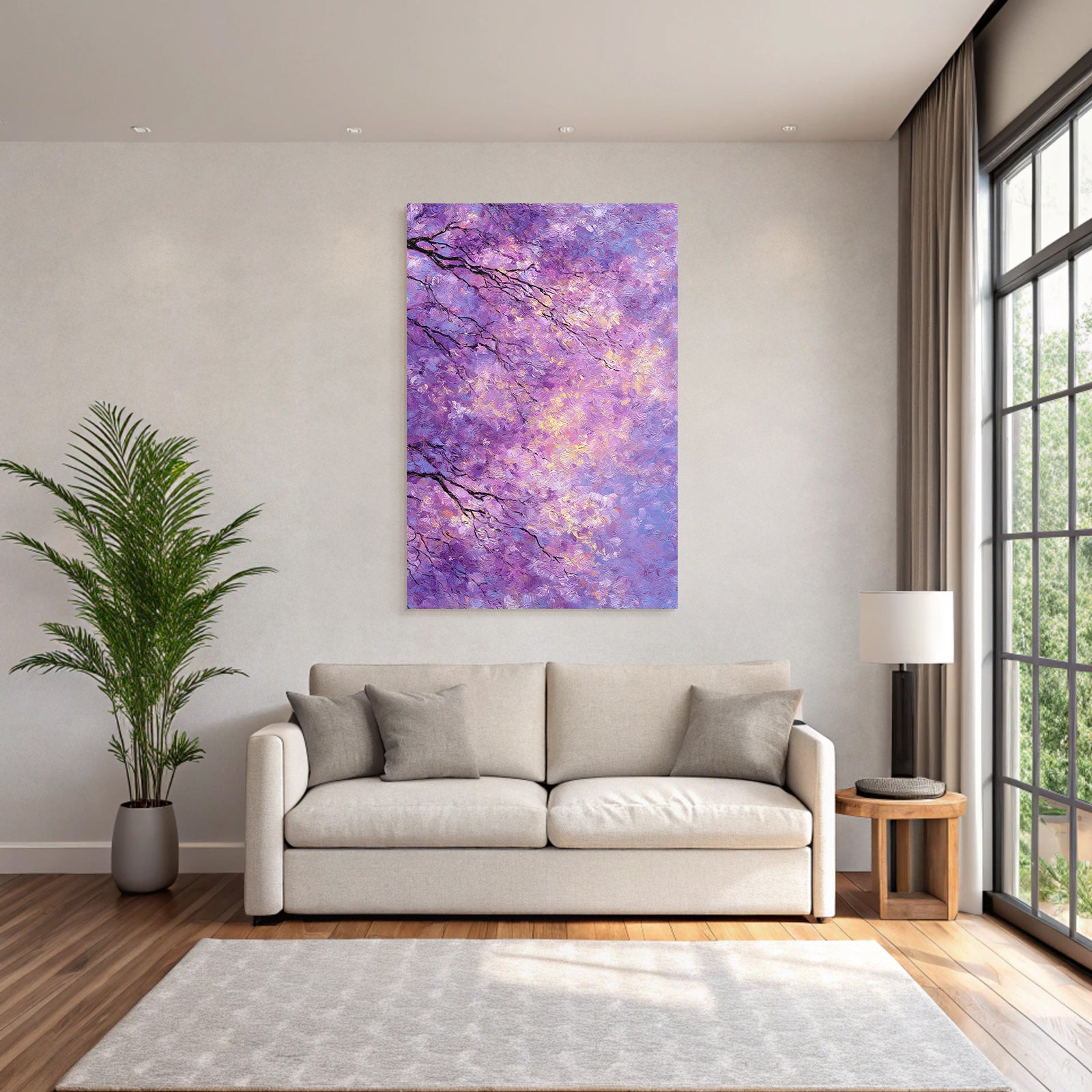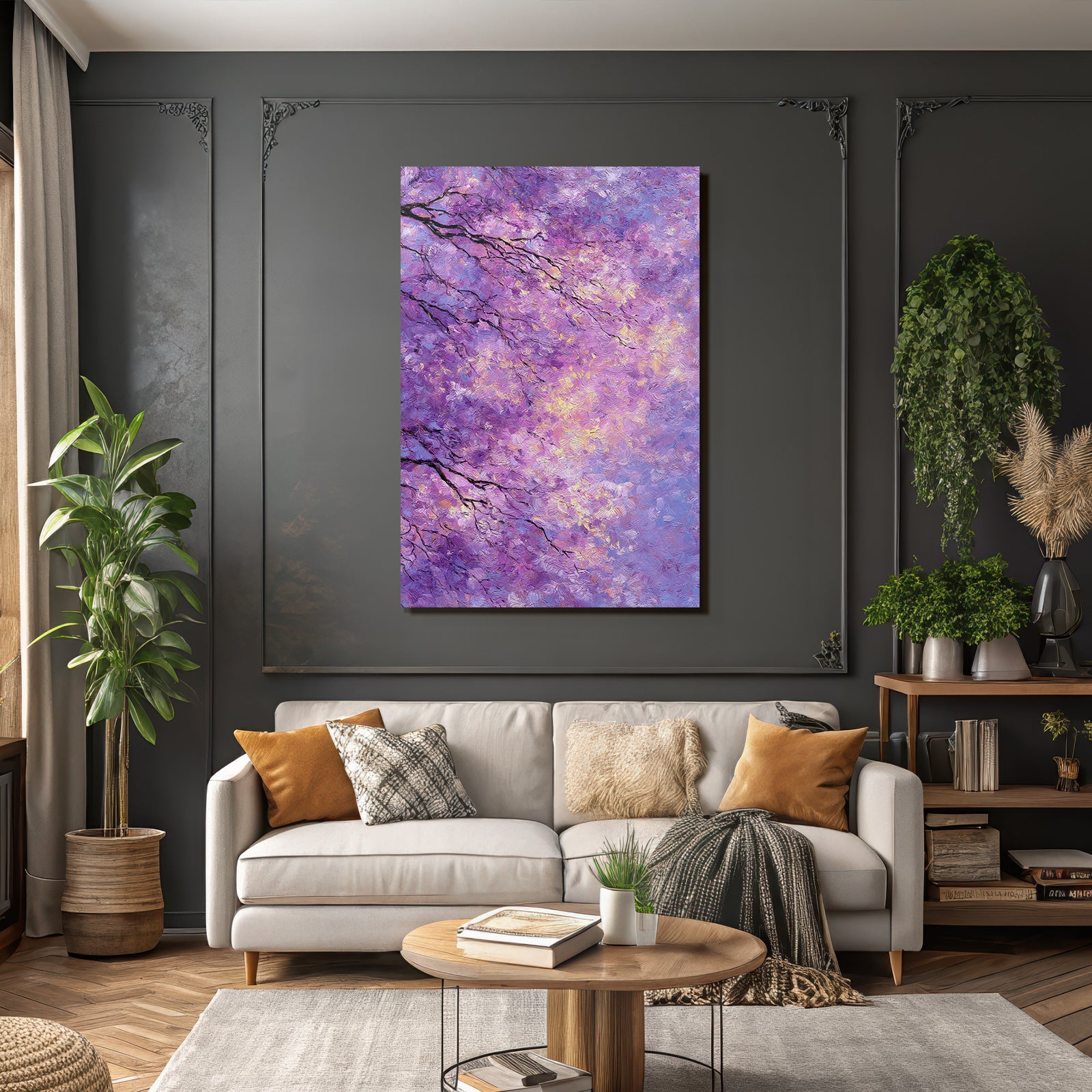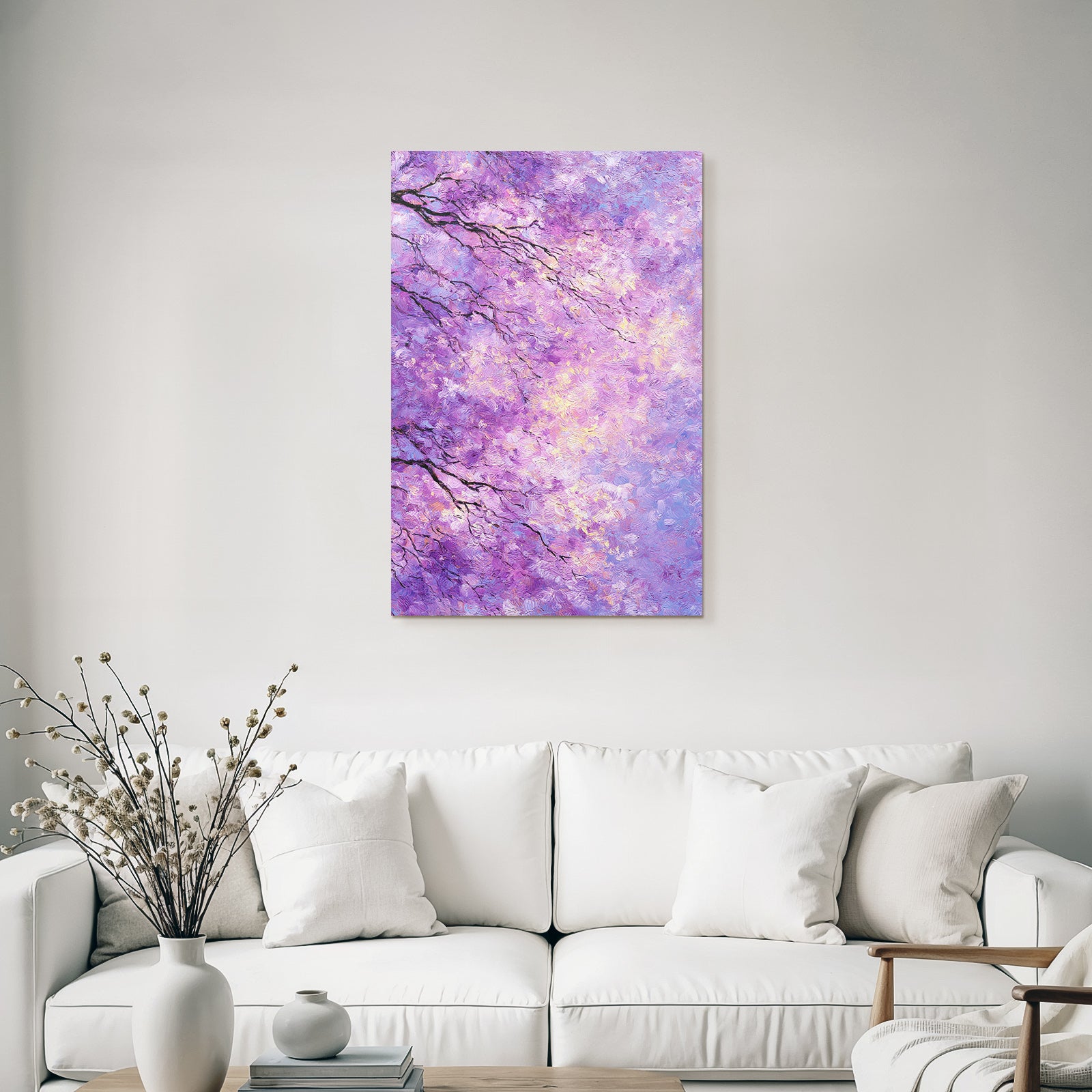Ob Flur, Wohnraum oder Wartebereich – das Motiv „Traumhafte Blumige Zweige Im Sonnenuntergang“ im Stil Jugendstil wirkt durch den hochwertigen FameFrame™ besonders modern.