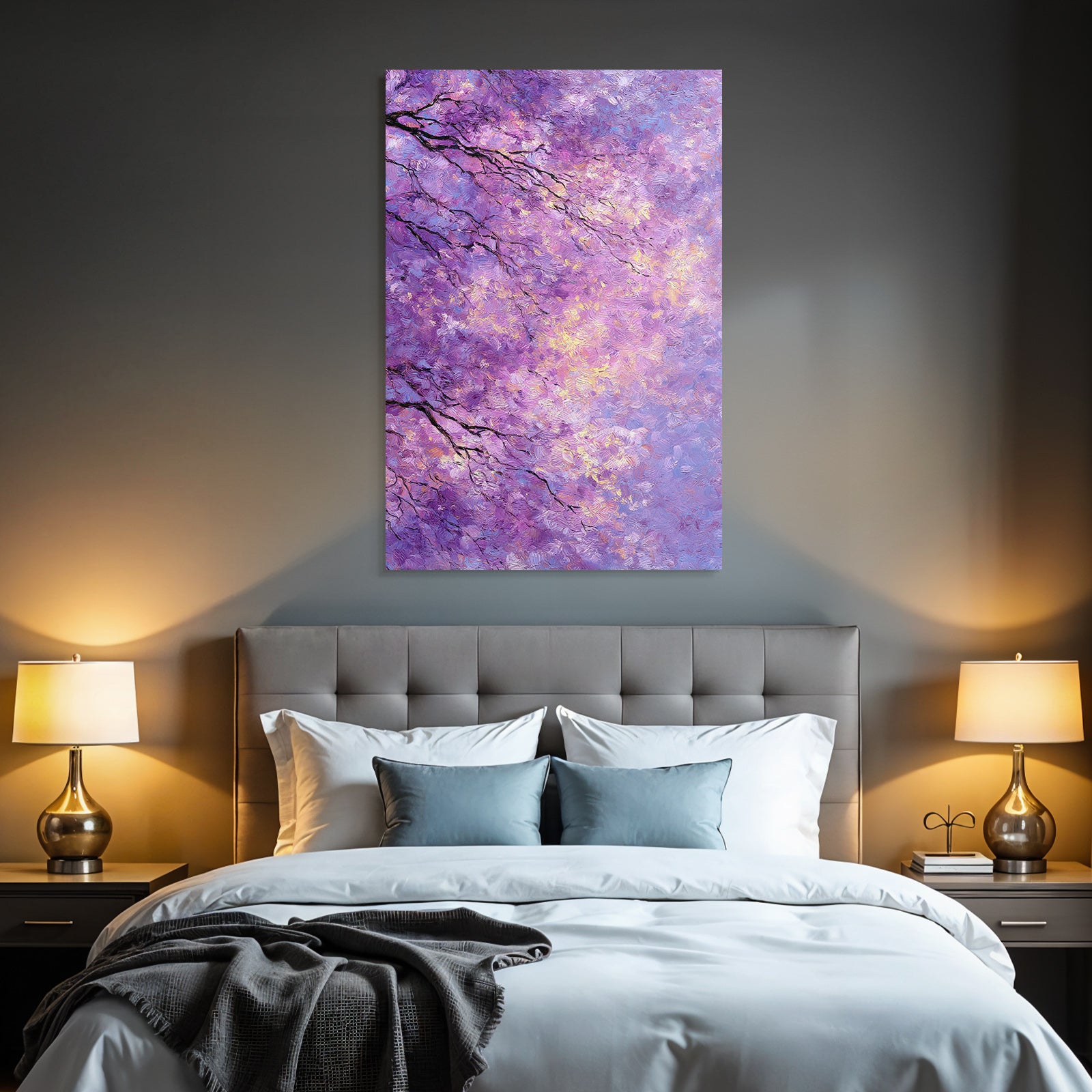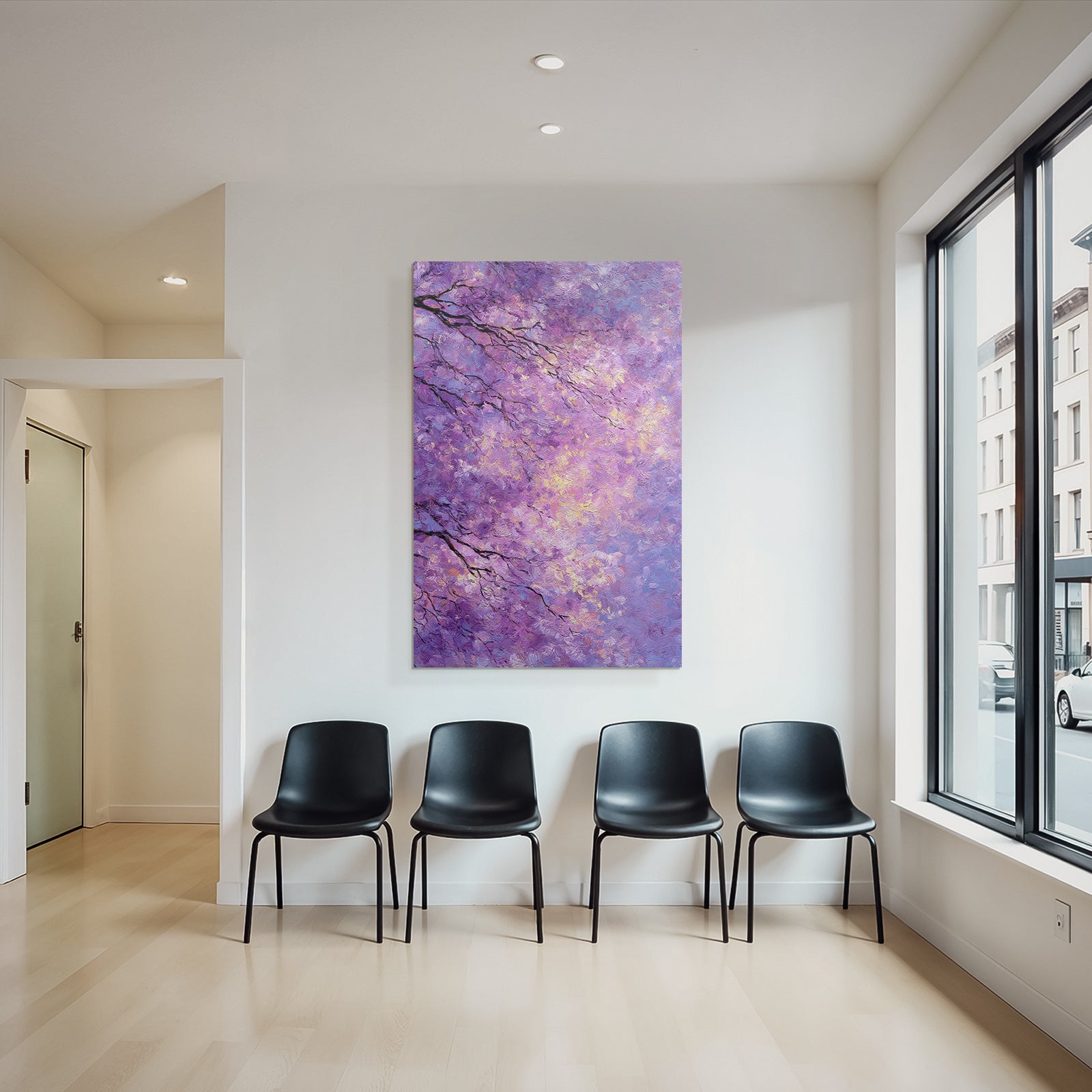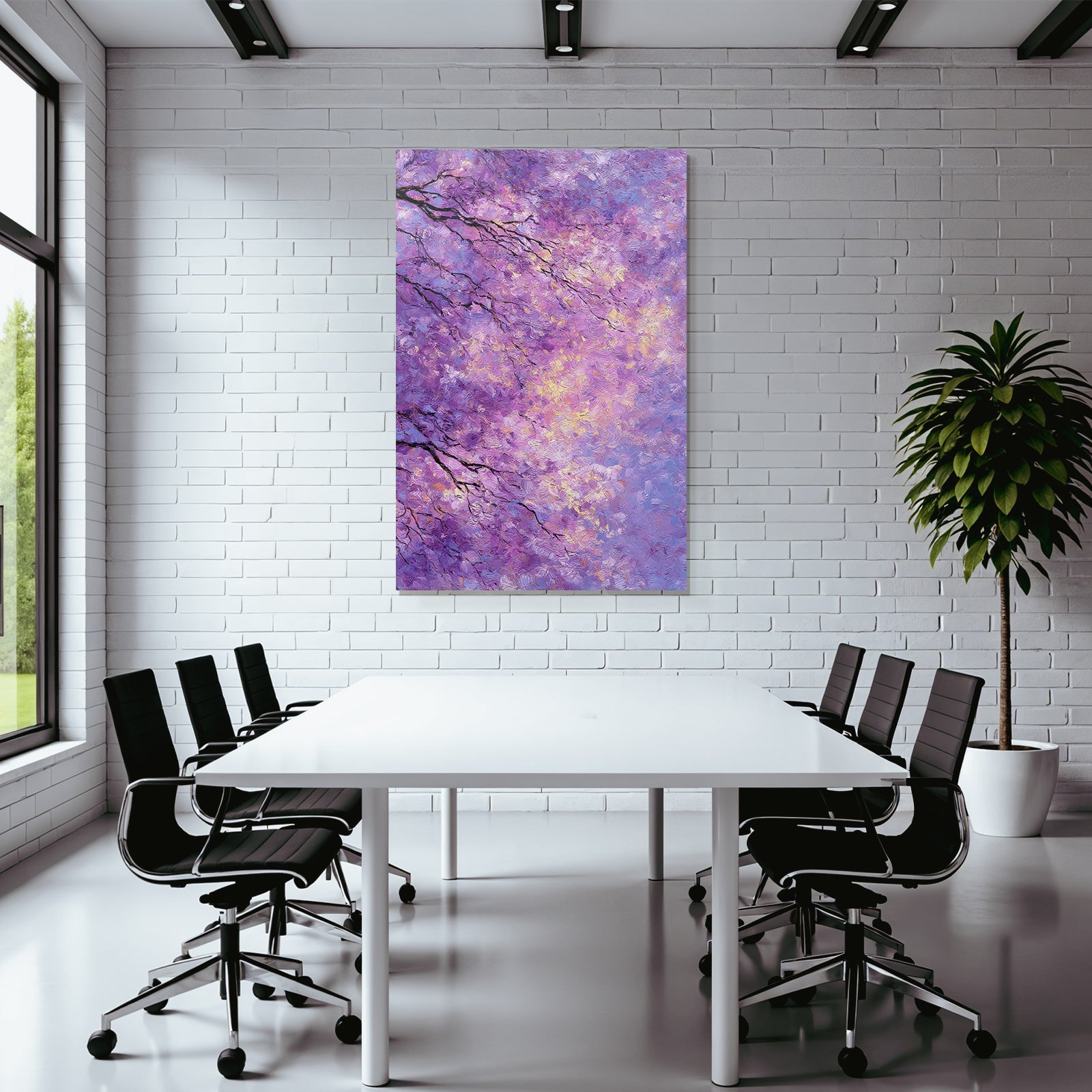 Ob Flur, Wohnraum oder Wartebereich – das Motiv „Traumhafte Blumige Zweige Im Sonnenuntergang“ im Stil Jugendstil wirkt durch den hochwertigen FameFrame™ besonders modern.