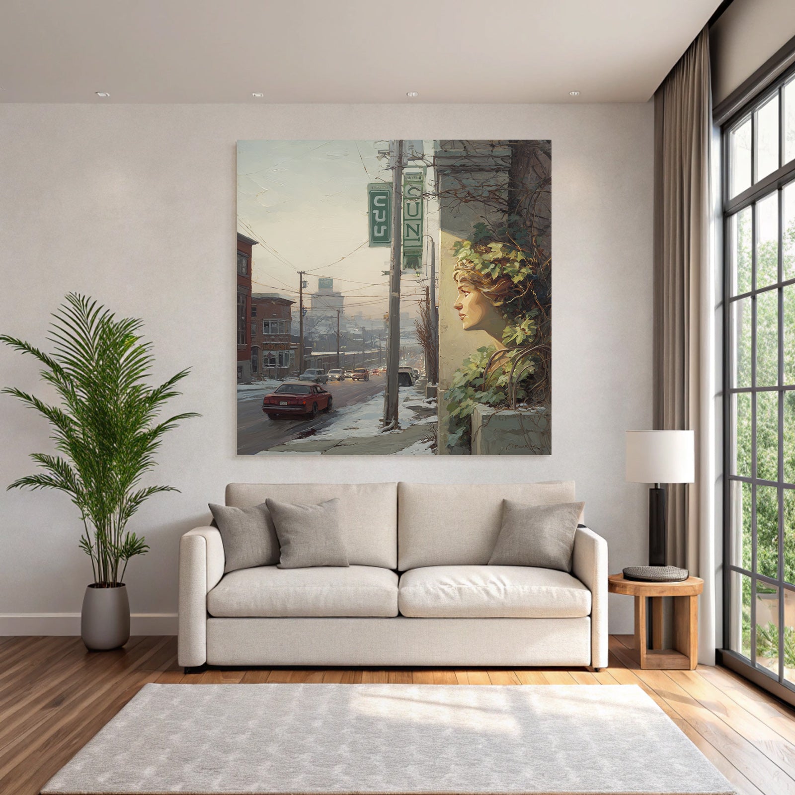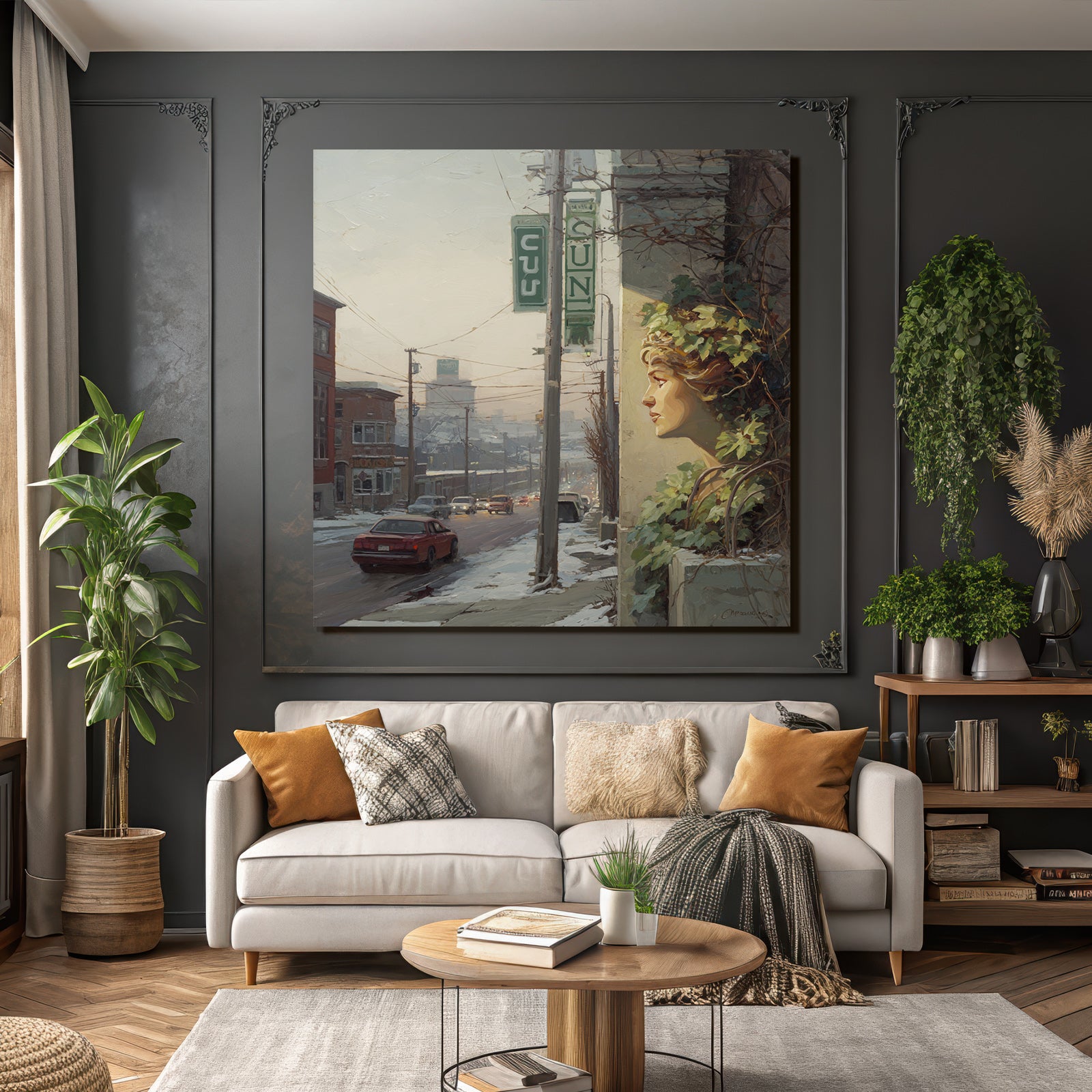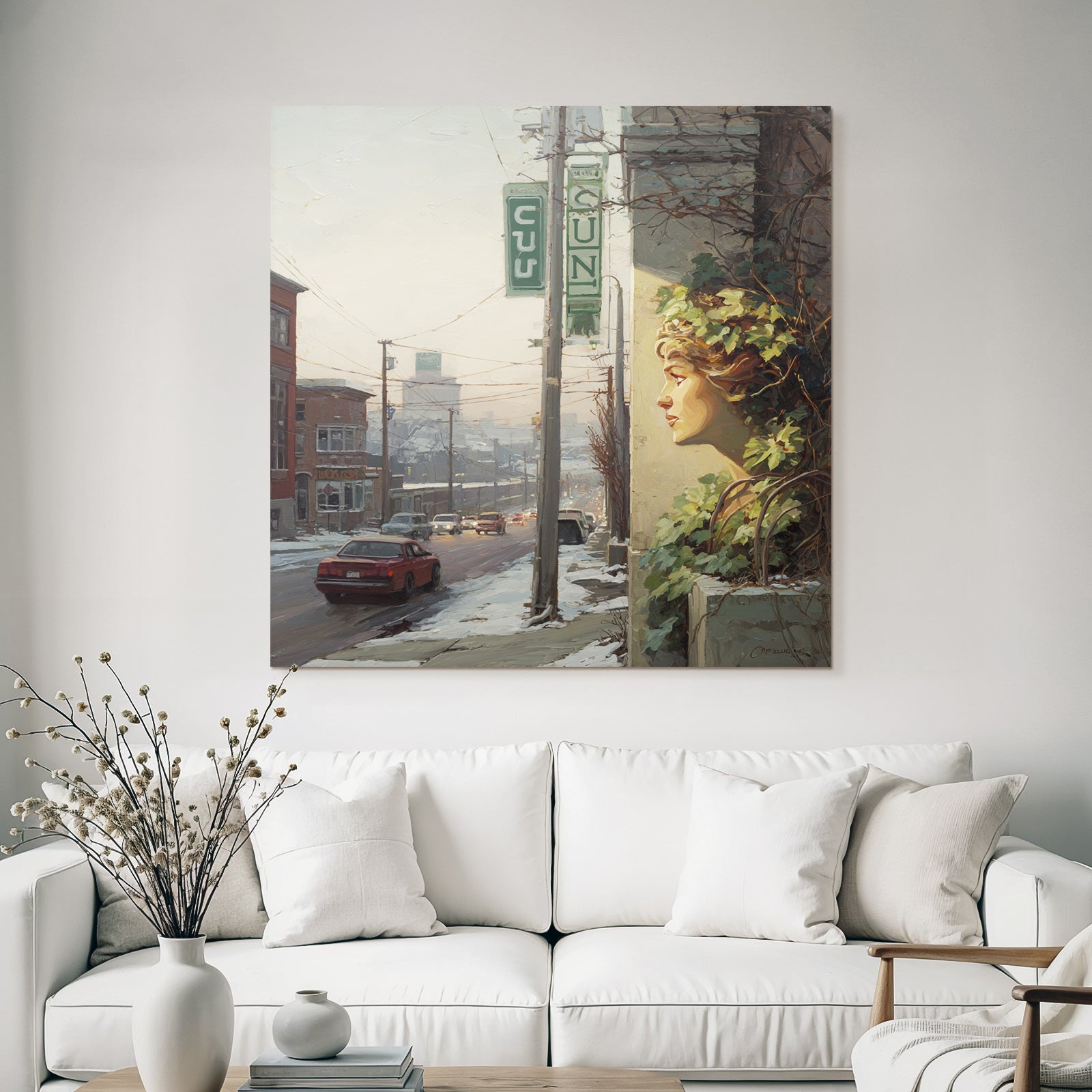 Eine Symbiose aus Kunst und Technik: Das Motiv „Winterstrasse Mit Gesichtsskulptur Und Efeu“ im Stil Jugendstil entfaltet auf dem Hightech-Textil des FameFrame™ eine unvergleichliche Tiefenwirkung.