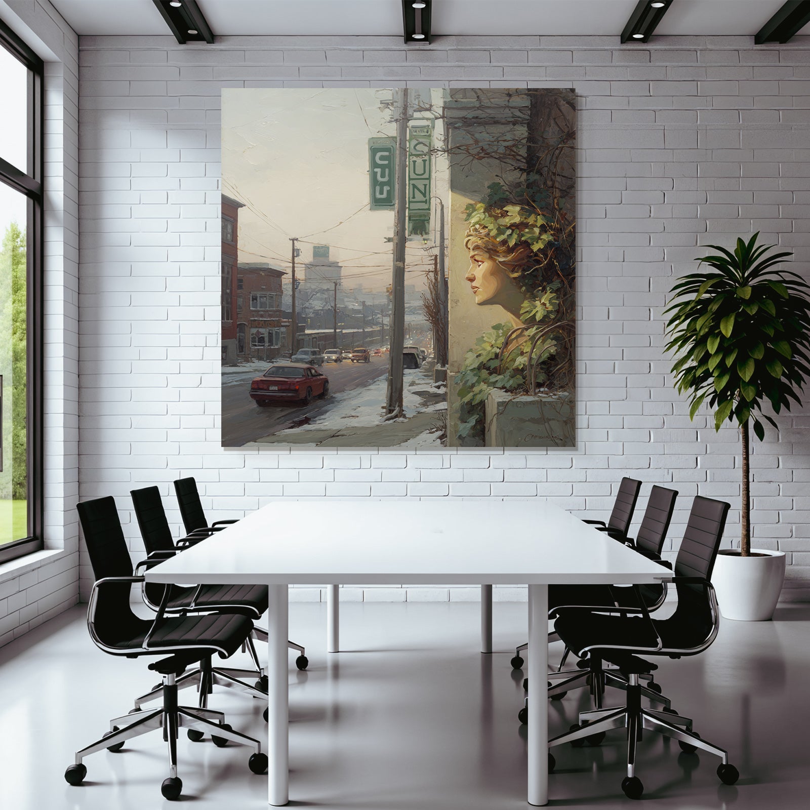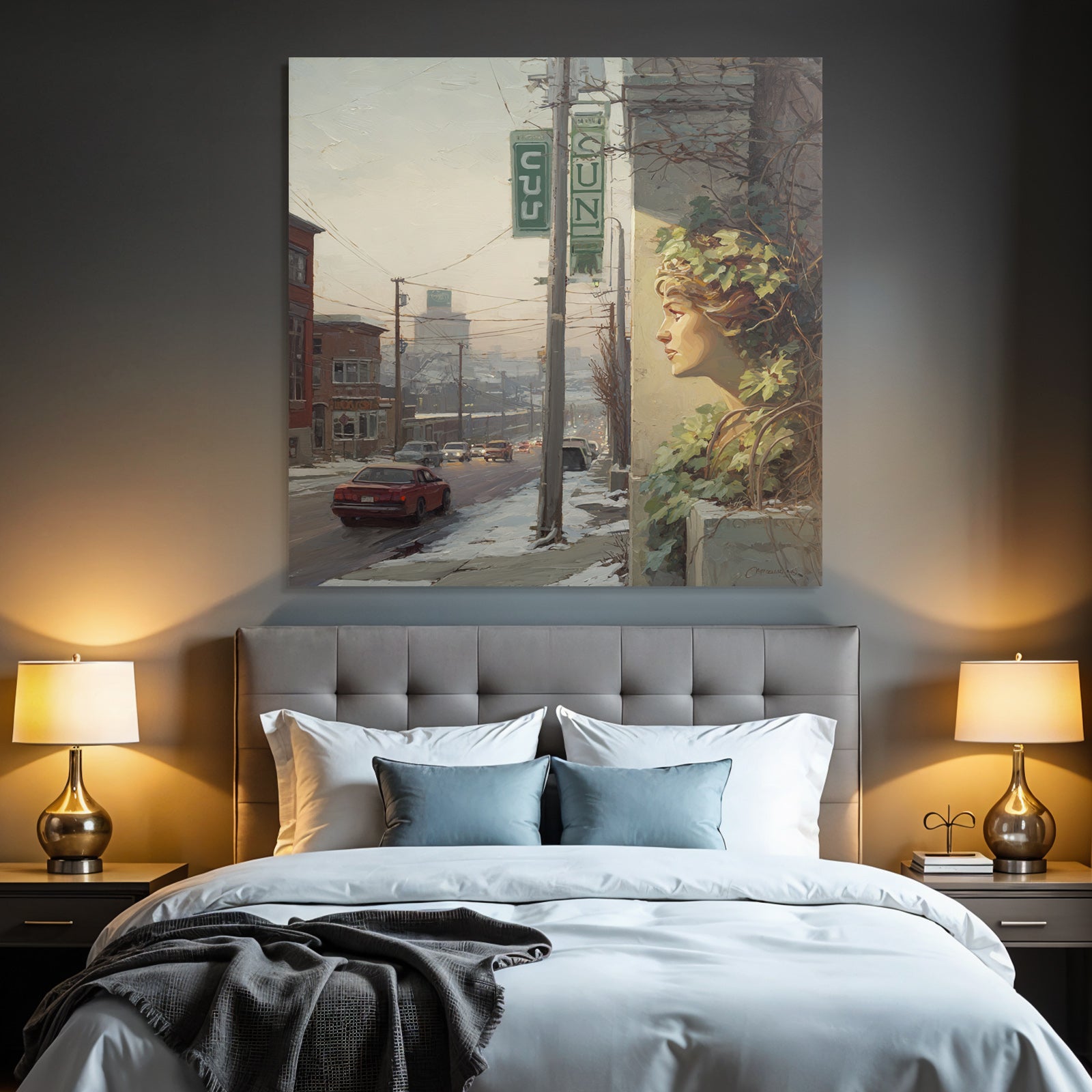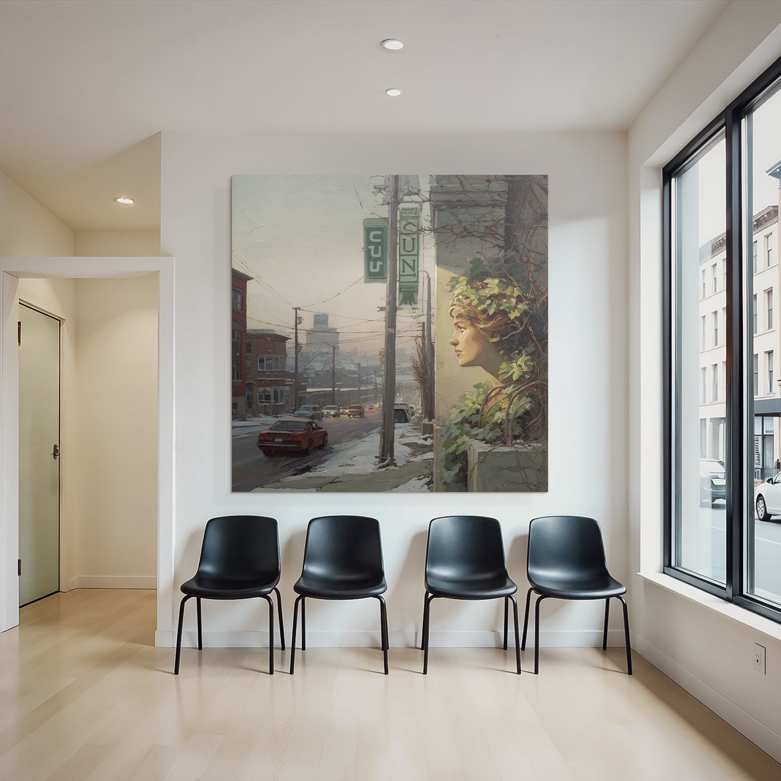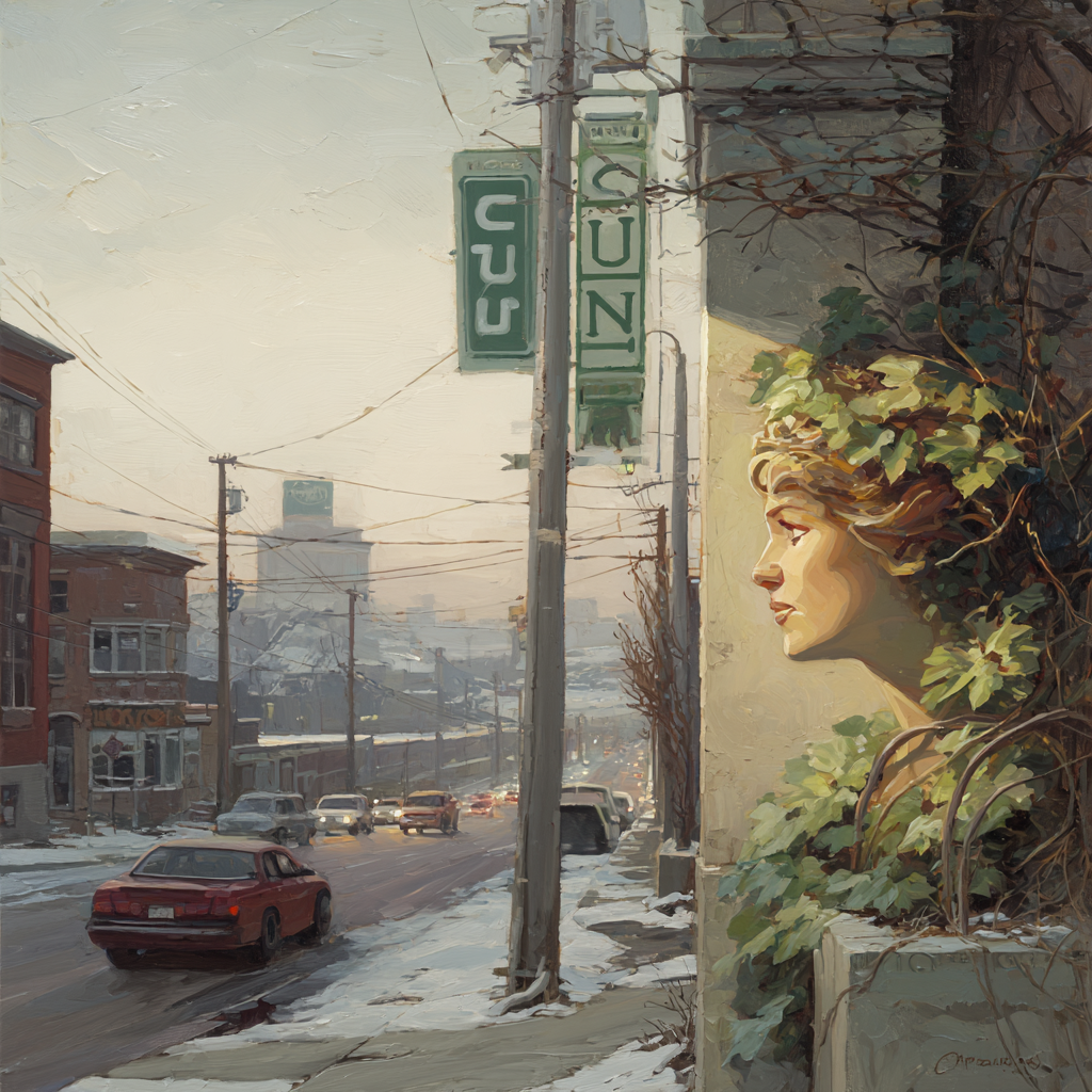 Eine Symbiose aus Kunst und Technik: Das Motiv „Winterstrasse Mit Gesichtsskulptur Und Efeu“ im Stil Jugendstil entfaltet auf dem Hightech-Textil des FameFrame™ eine unvergleichliche Tiefenwirkung.