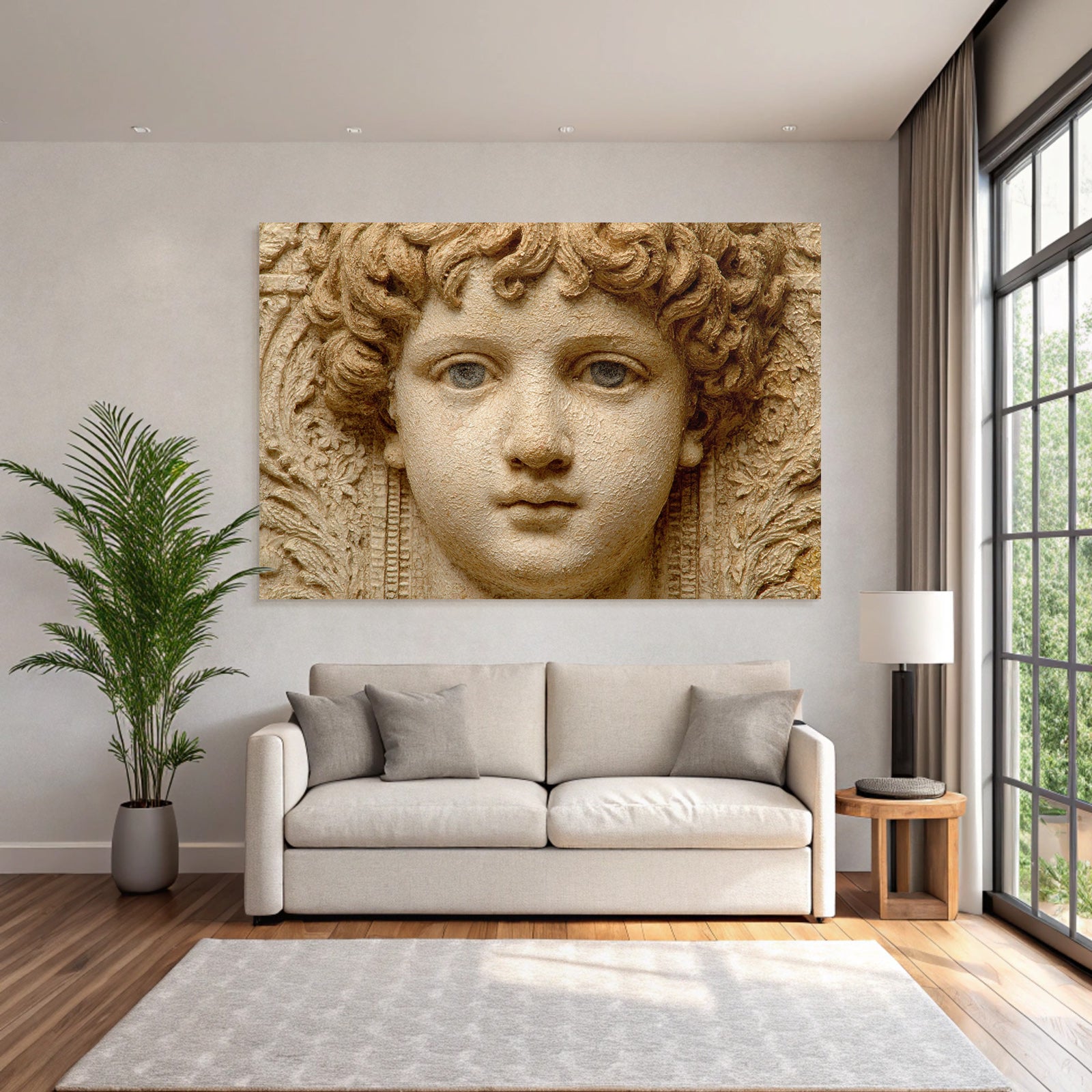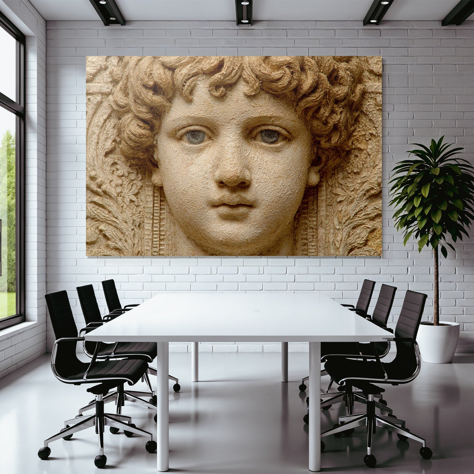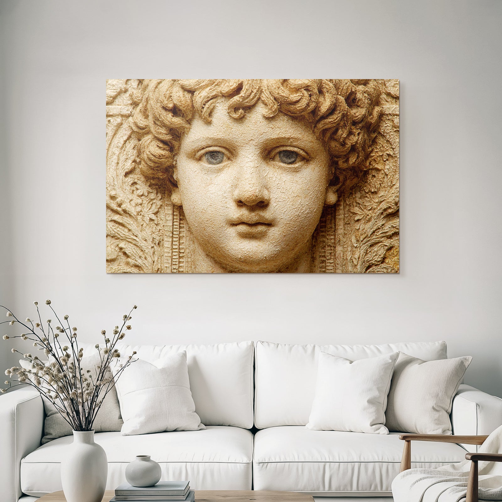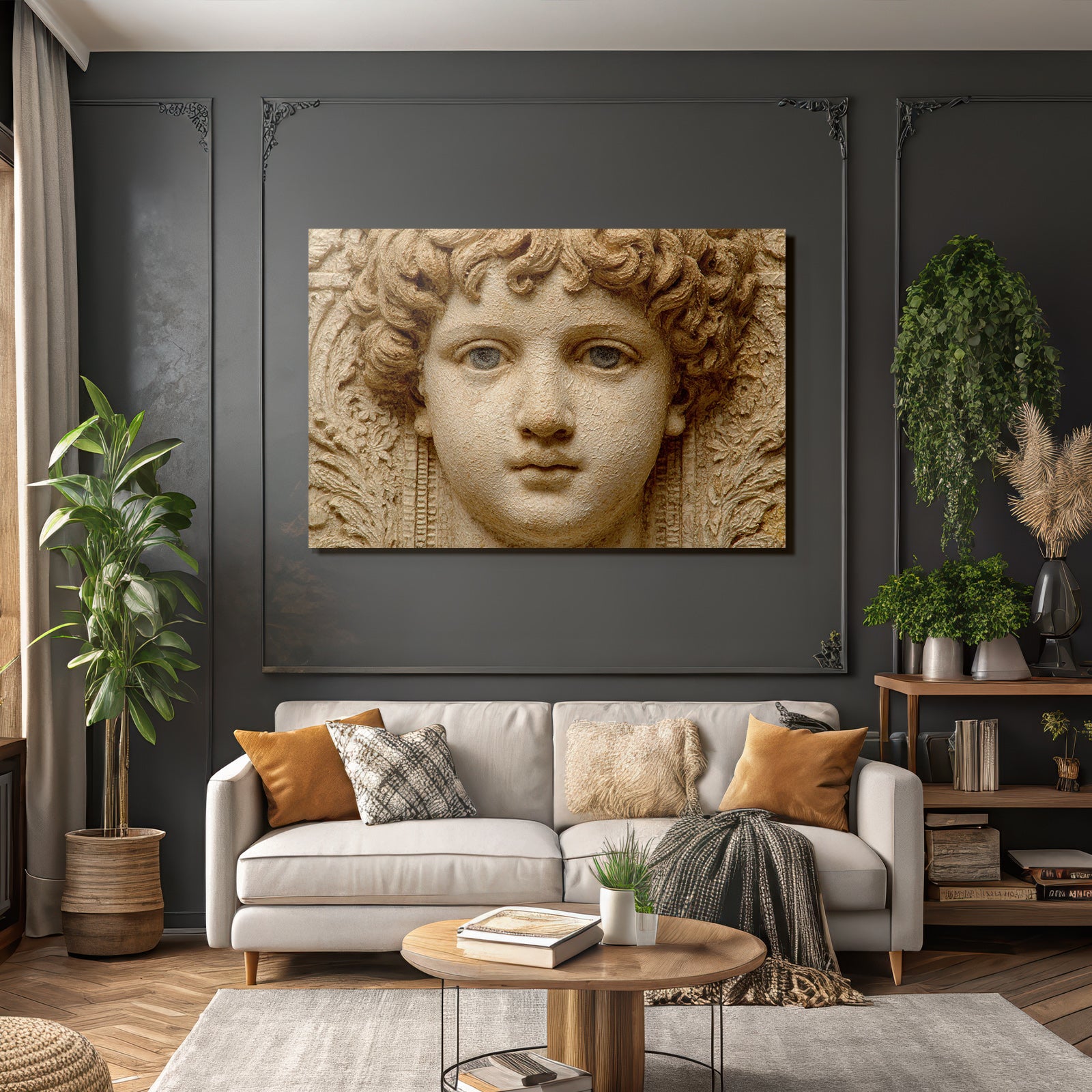 Ein Highlight für Wohnzimmer, Studio oder Empfangsbereich: „„Gelaesertes Gesicht Aus Der Antike““ bringt den Stil Klassisch auf Stoff – gespannt im edlen FameFrame.