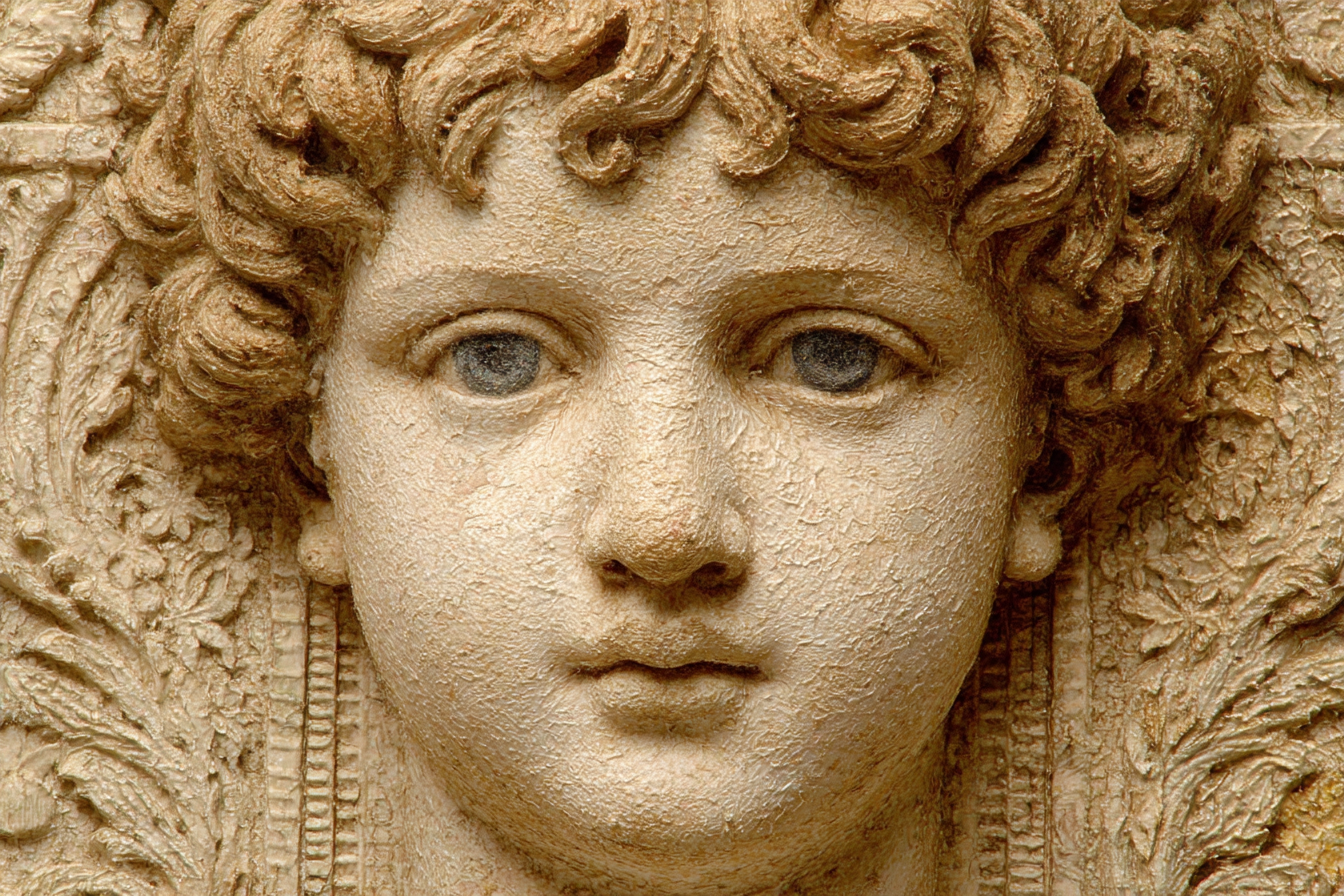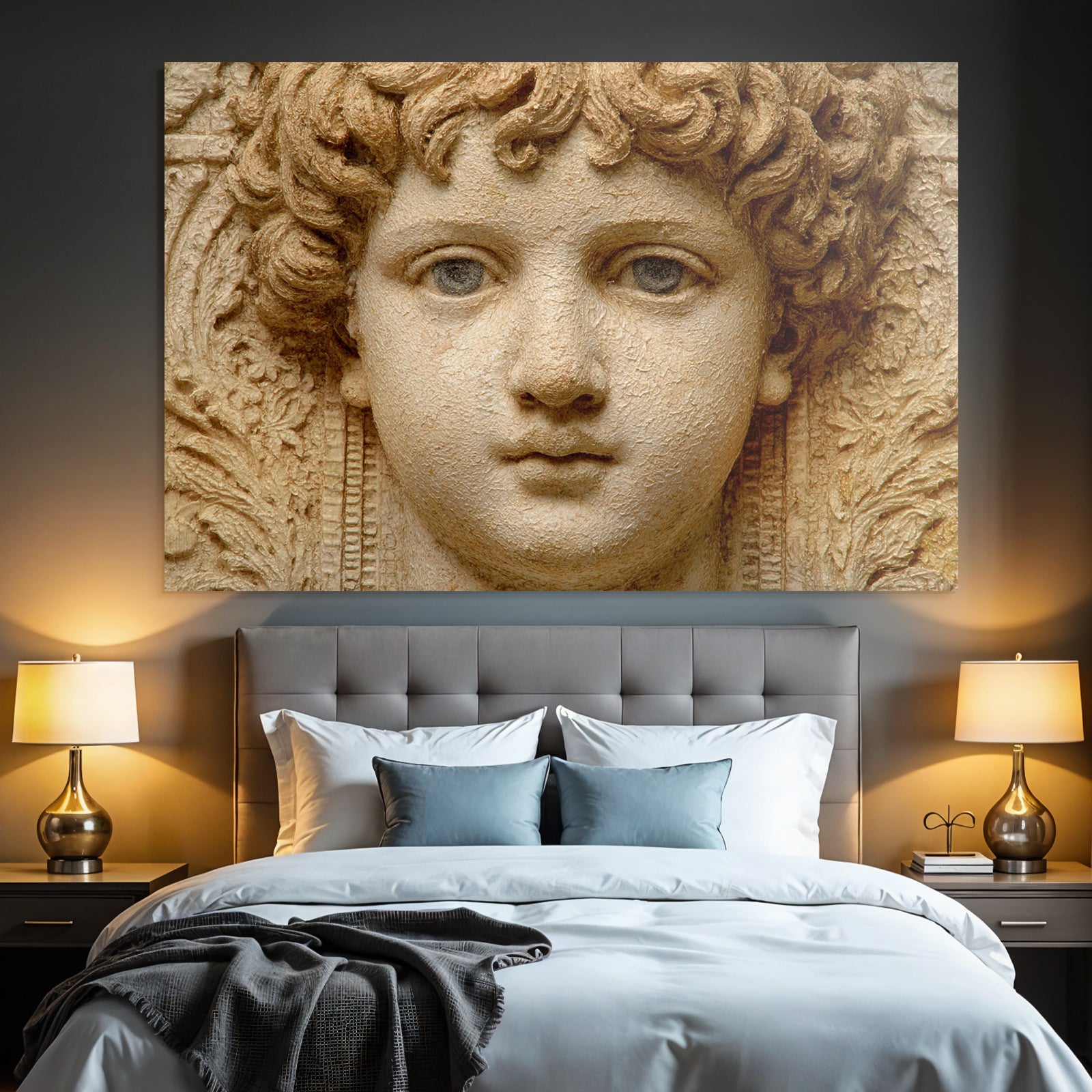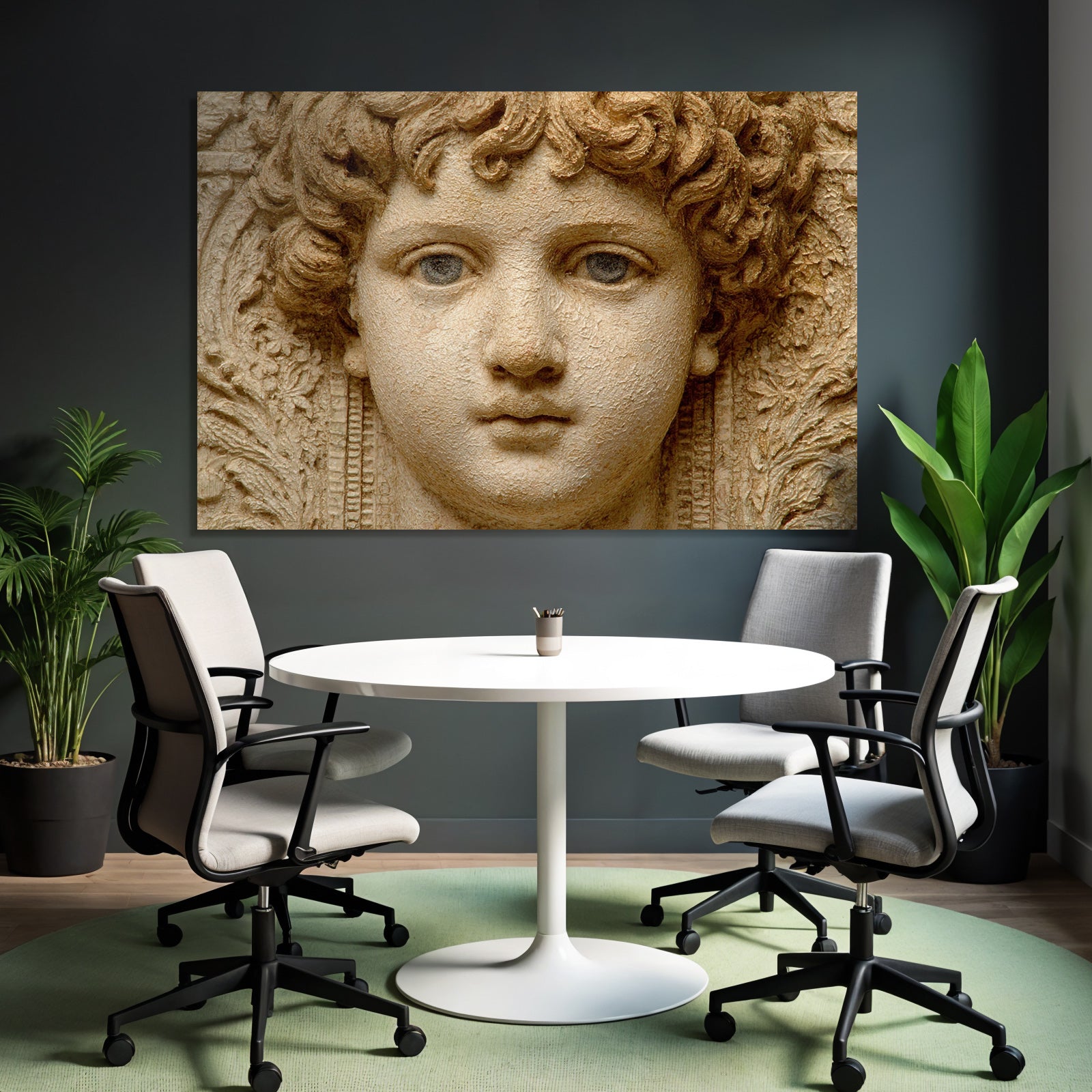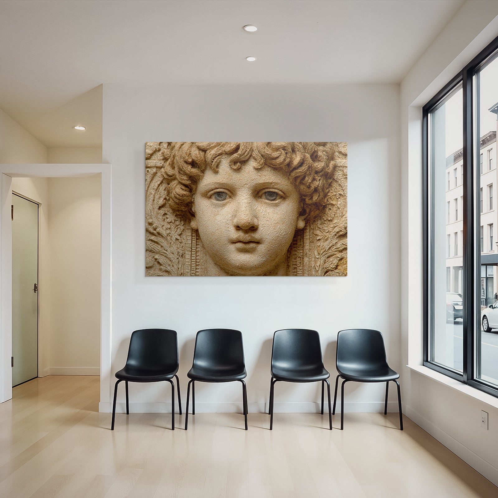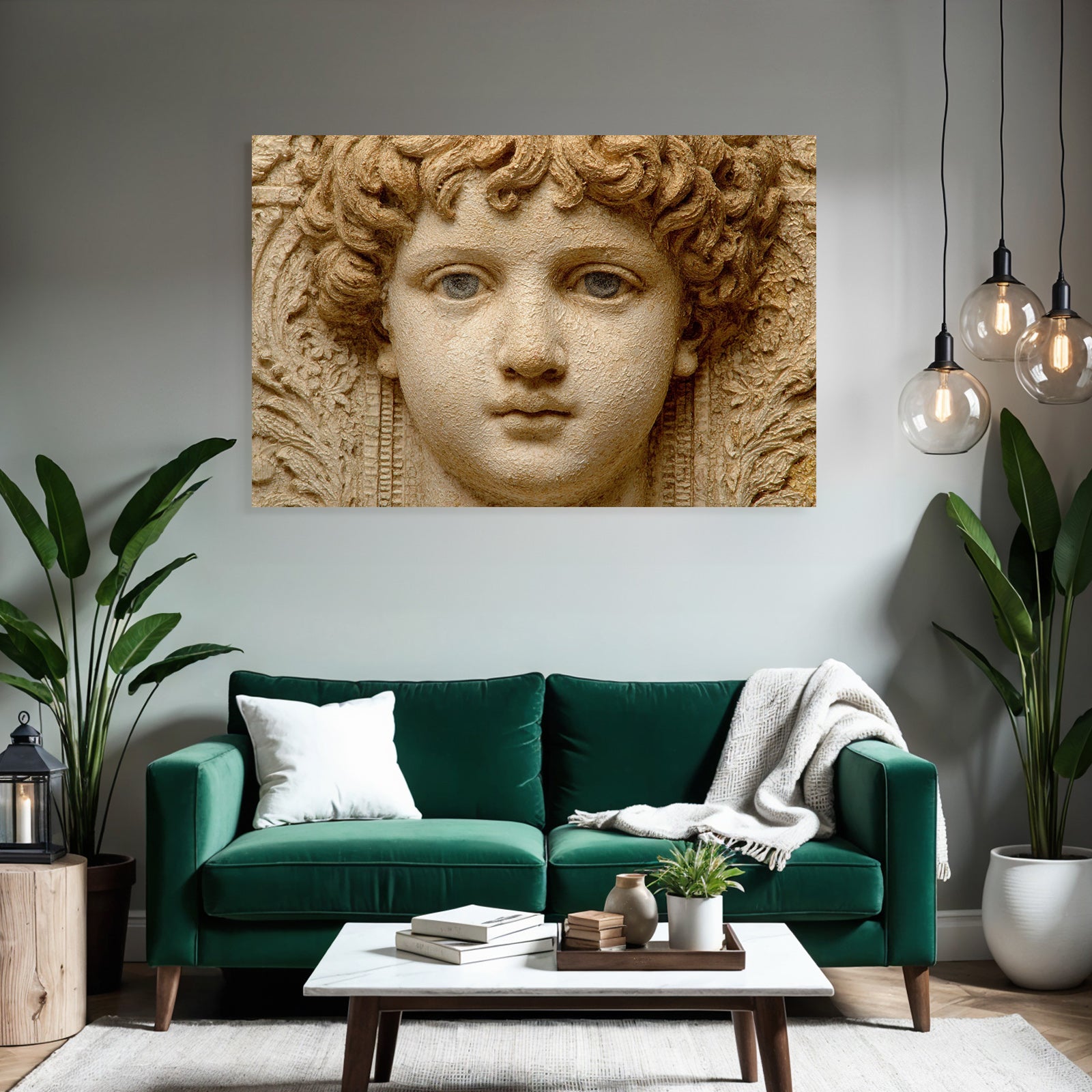 Ein Highlight für Wohnzimmer, Studio oder Empfangsbereich: „„Gelaesertes Gesicht Aus Der Antike““ bringt den Stil Klassisch auf Stoff – gespannt im edlen FameFrame.