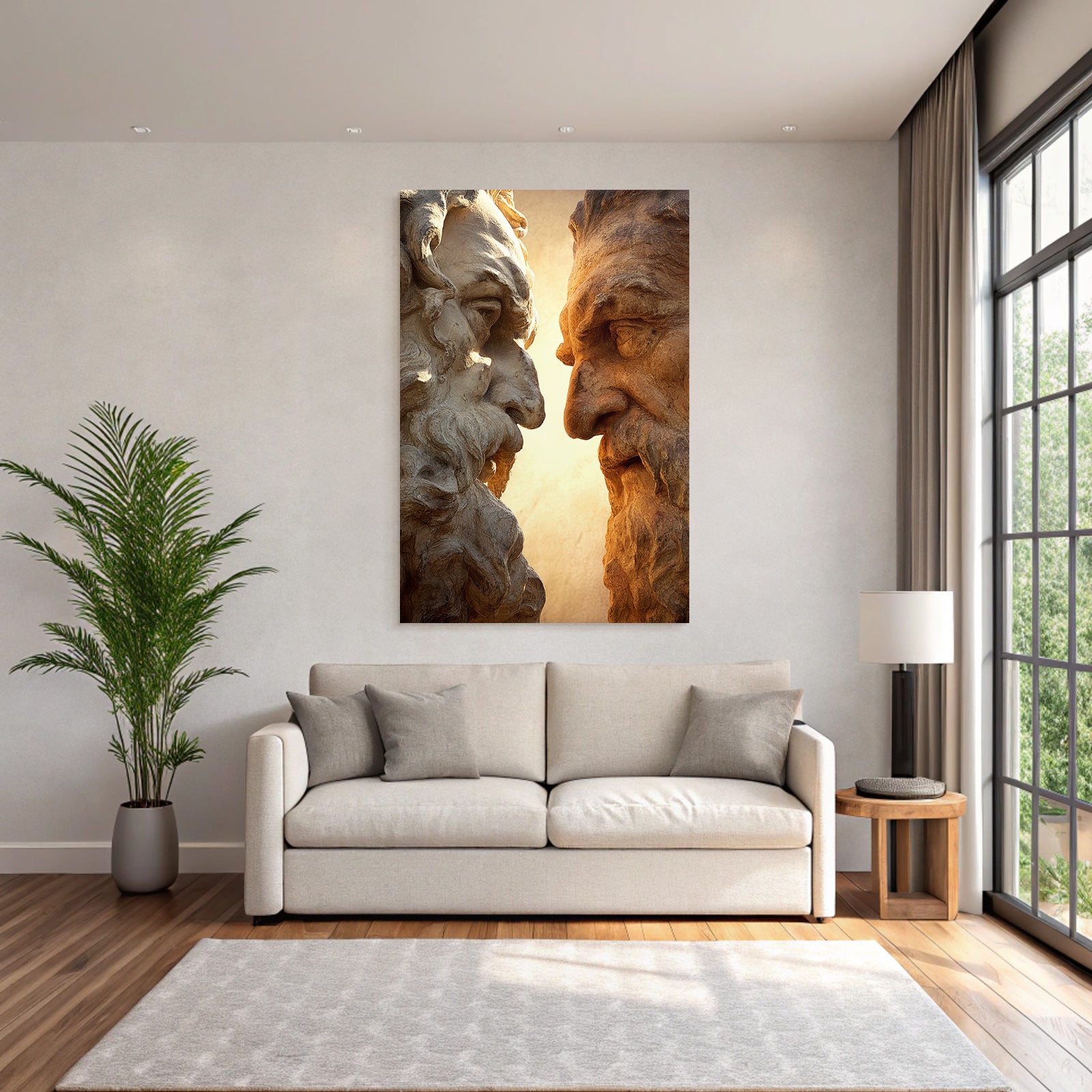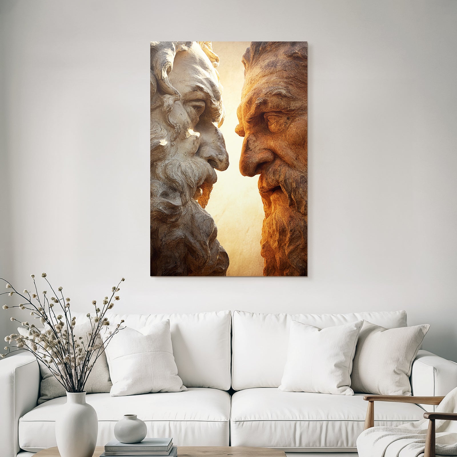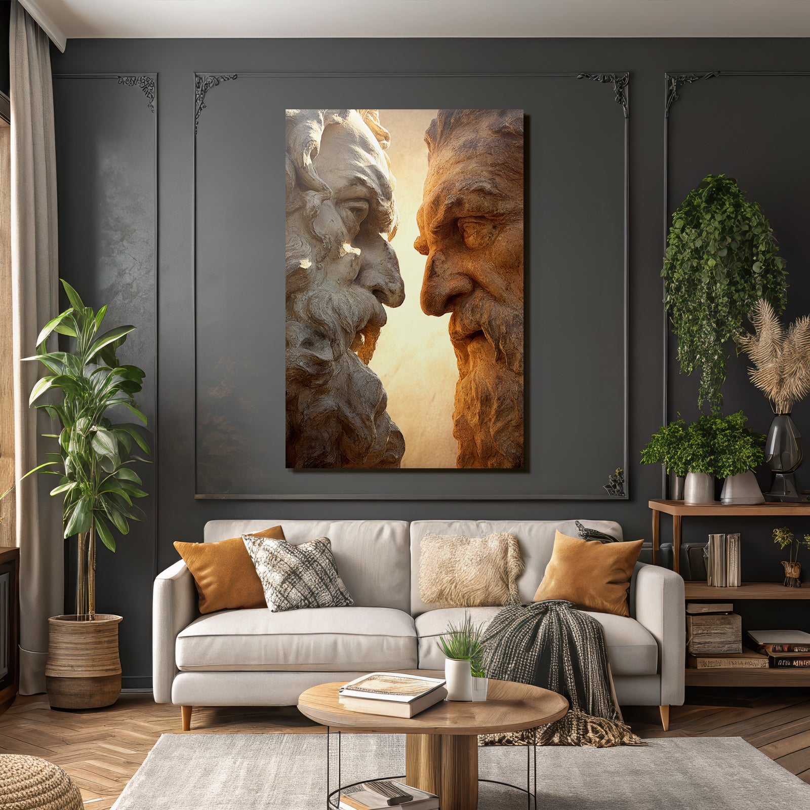 Mach mehr aus Deinem Wohnbereich oder Besprechungszimmer„„Geschnitzte Gesichter Mit Baerten Intensiven Ausdrucken““ im Stil Klassisch überzeugt als eleganter Textildruck im FameFrame.