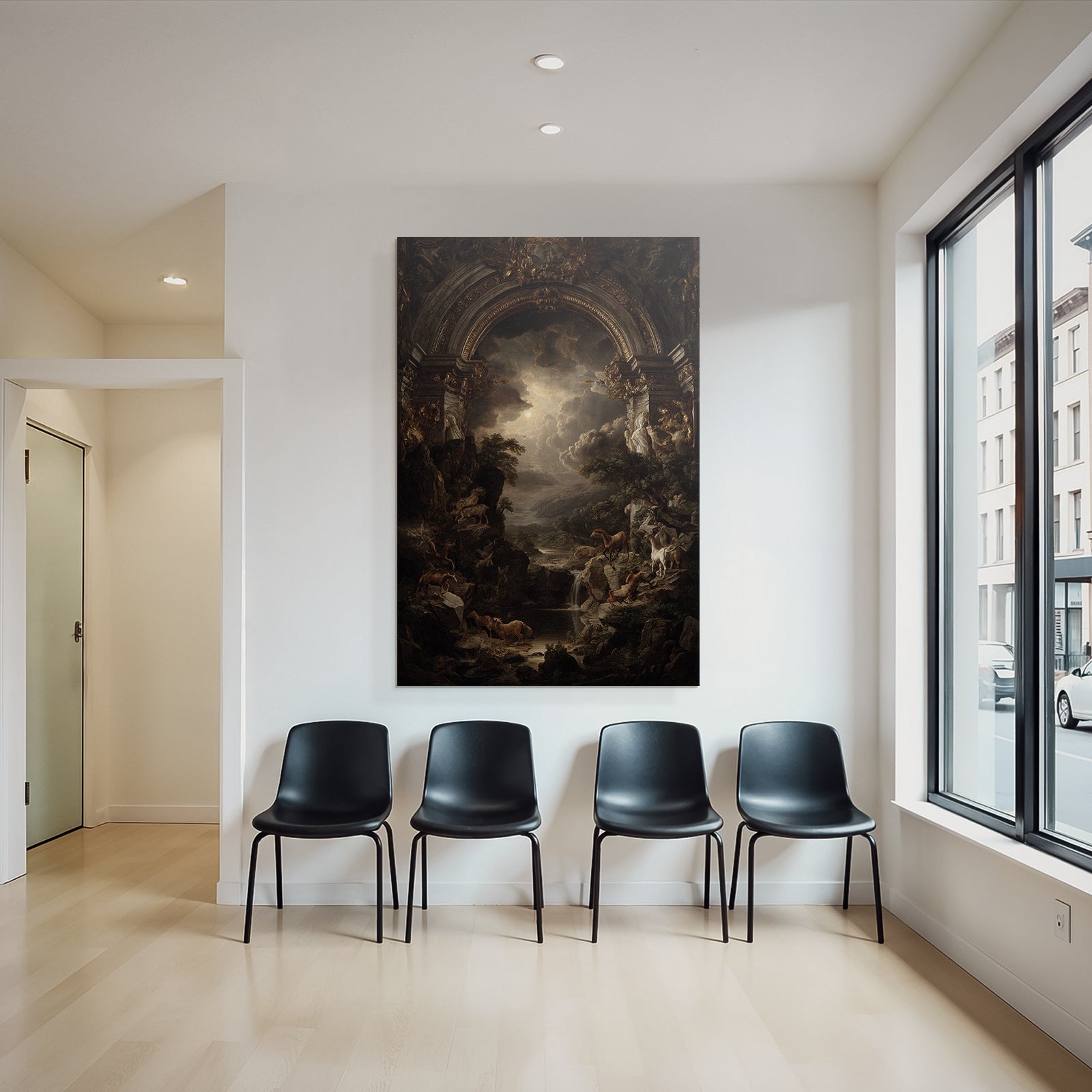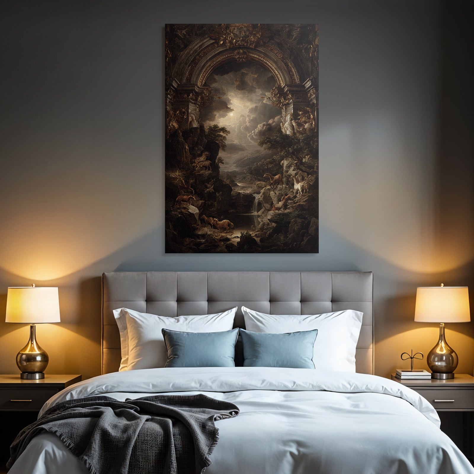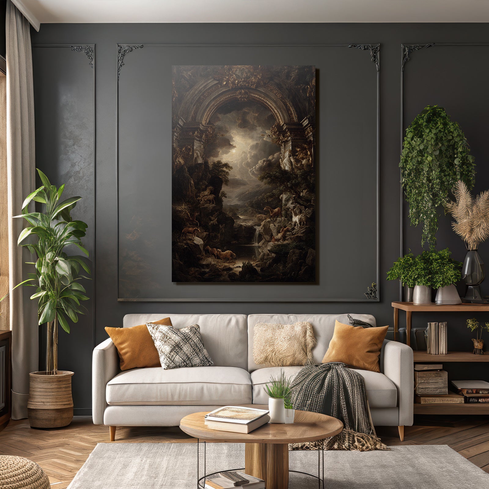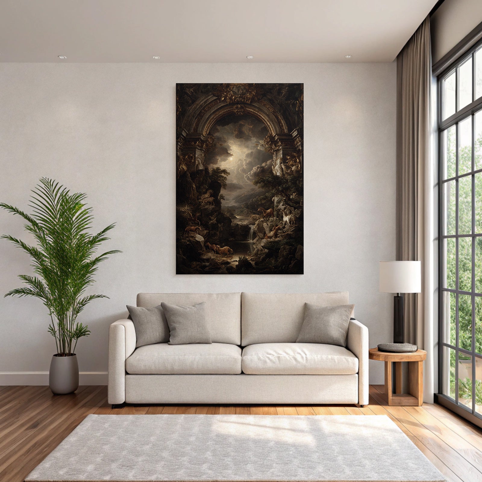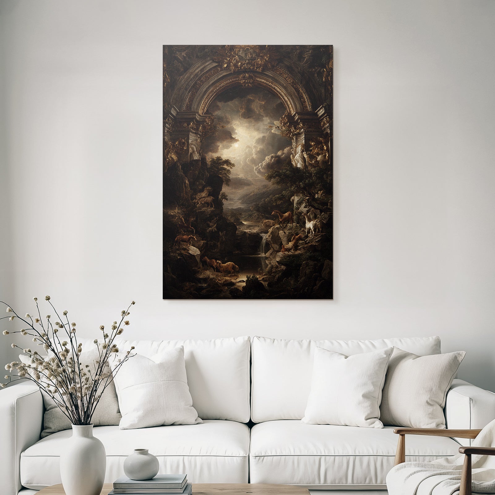 „„Kuenstlerische Landschaft Mit Bogen Und Tieren““ bringt den Stil Klassisch an Deine Wand – perfekt für Schlafzimmer, Homeoffice oder Besprechungsräume, edel gerahmt im FameFrame.