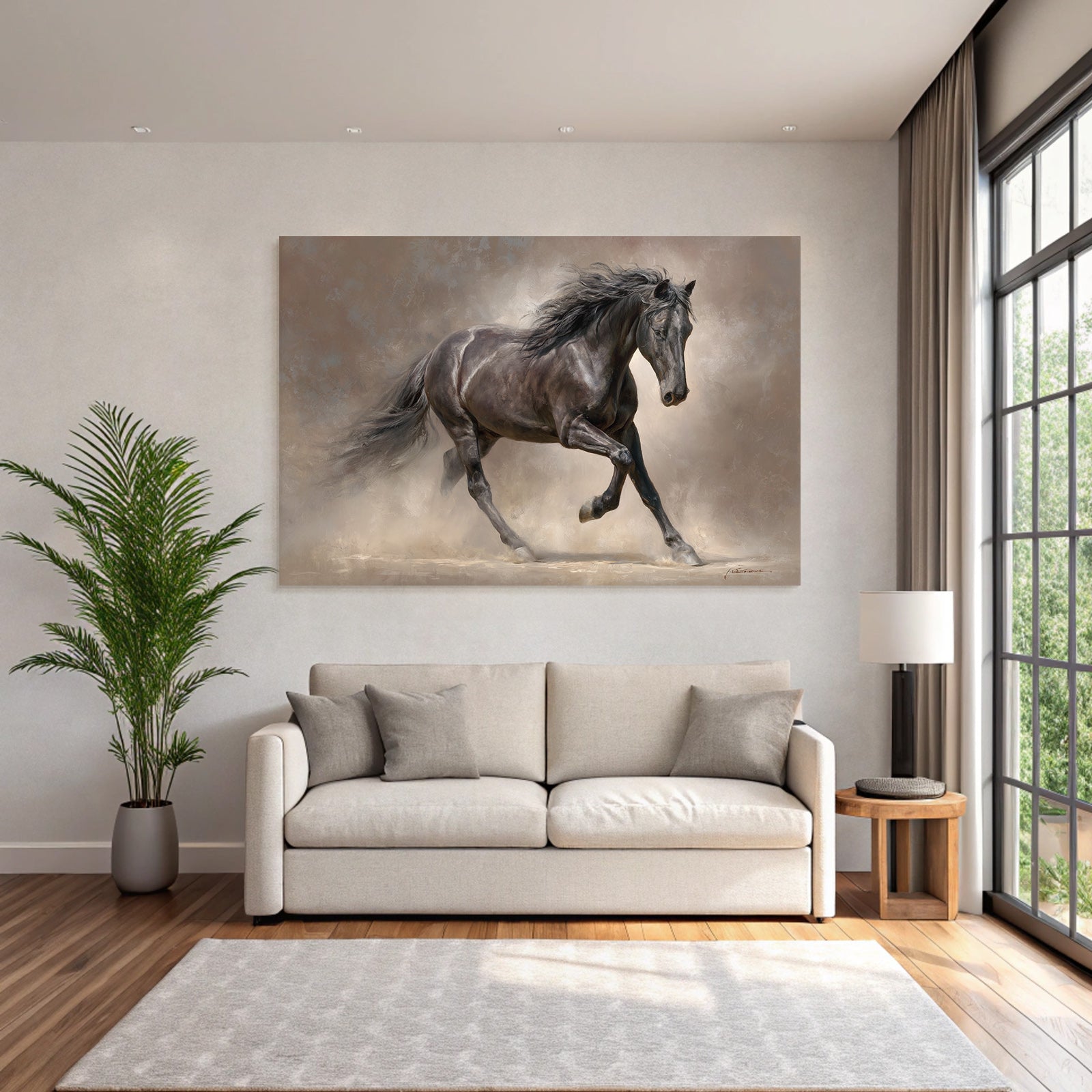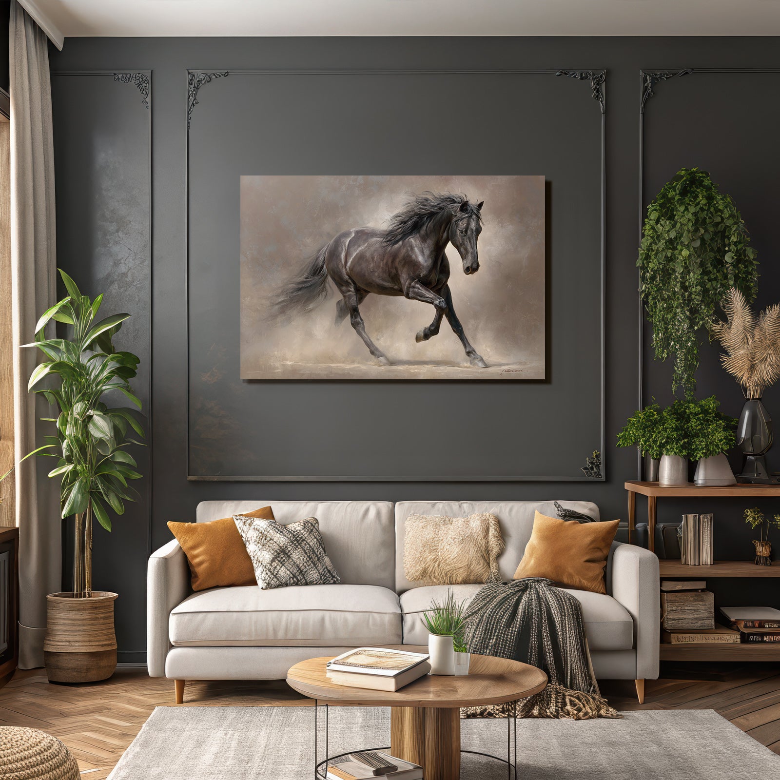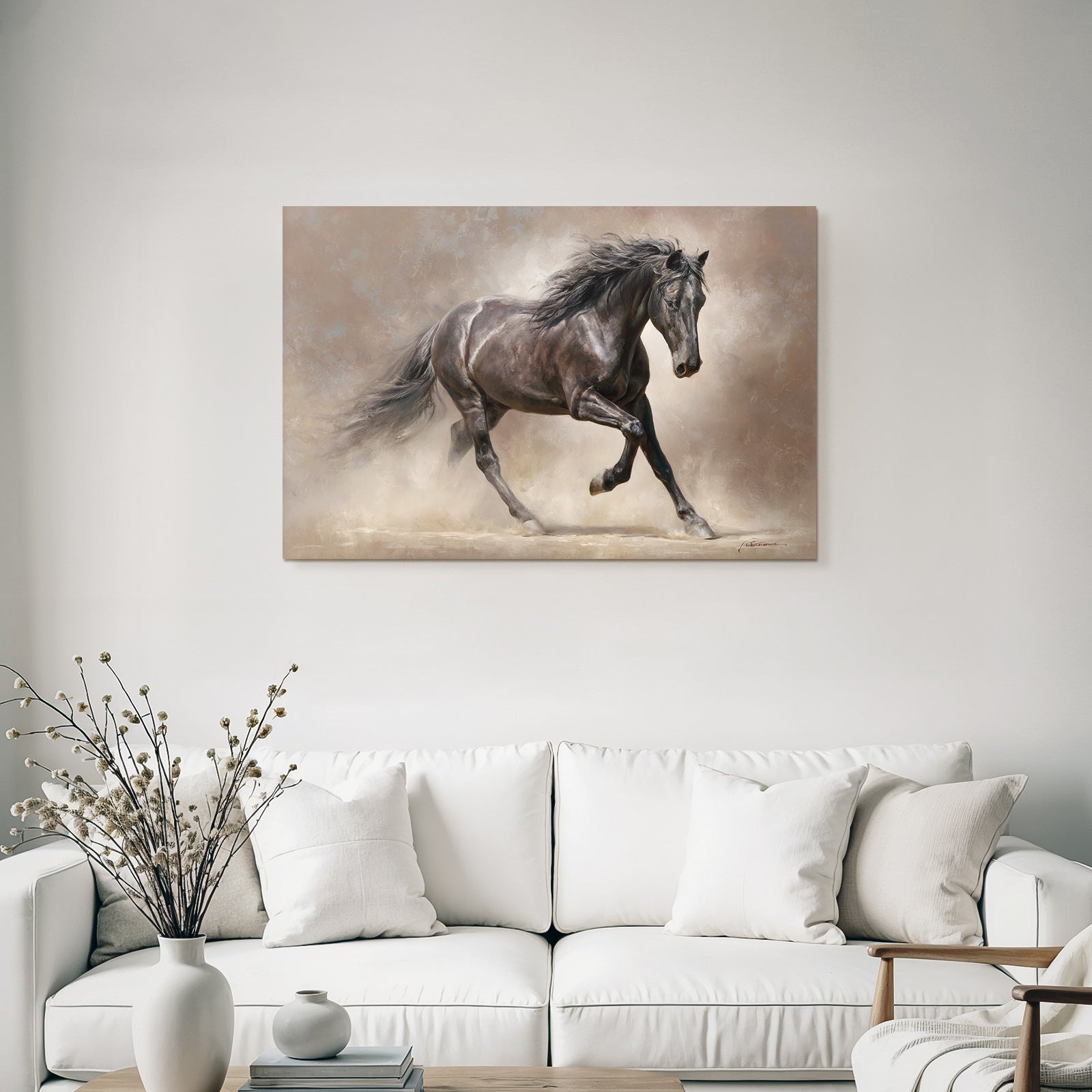 Modern, stilvoll, individuell: „„Pferd In Bewegung Eleganz Und Staerke““ im Stil Klassisch überzeugt im hochwertigen FameFrame durch klare Formen und starke Farben.