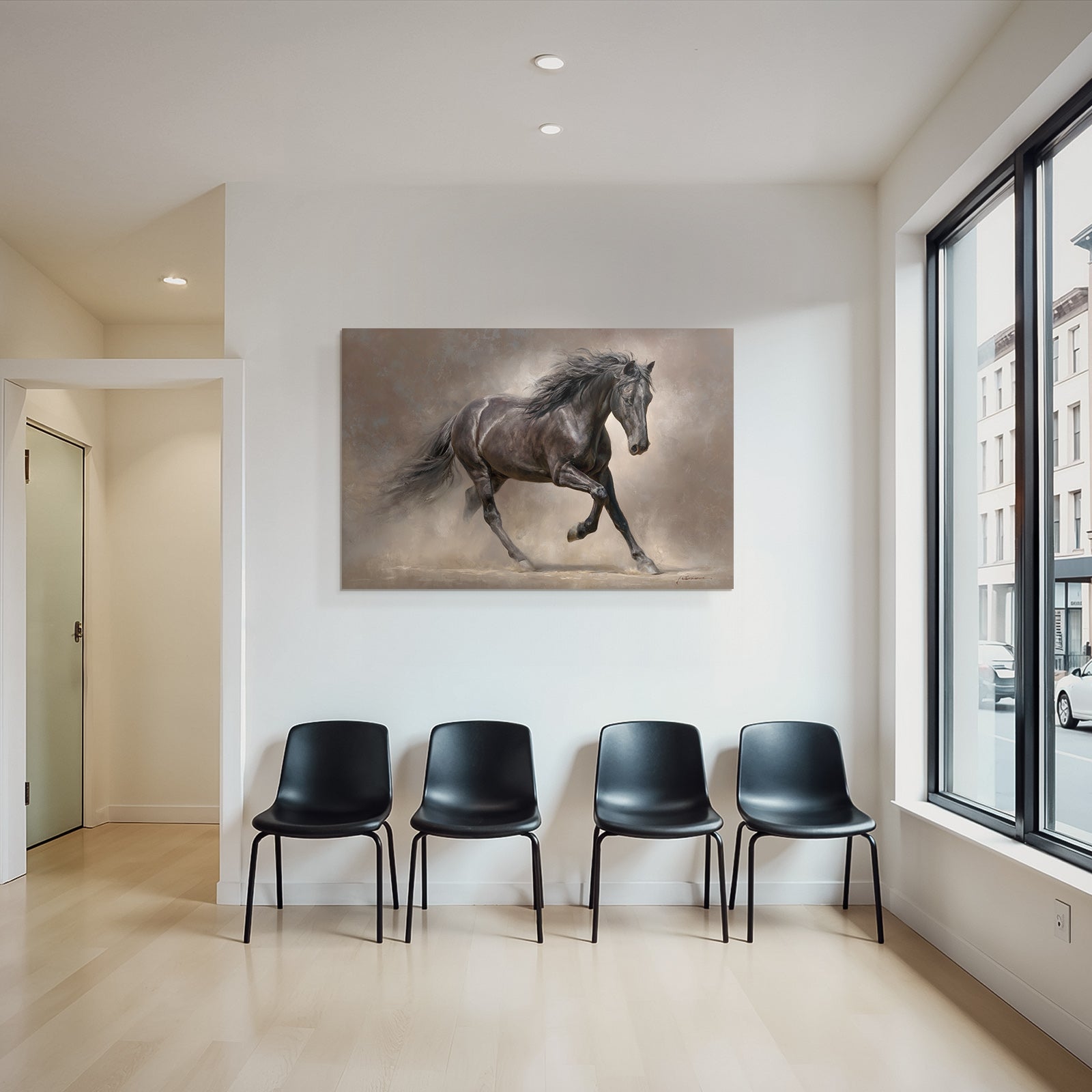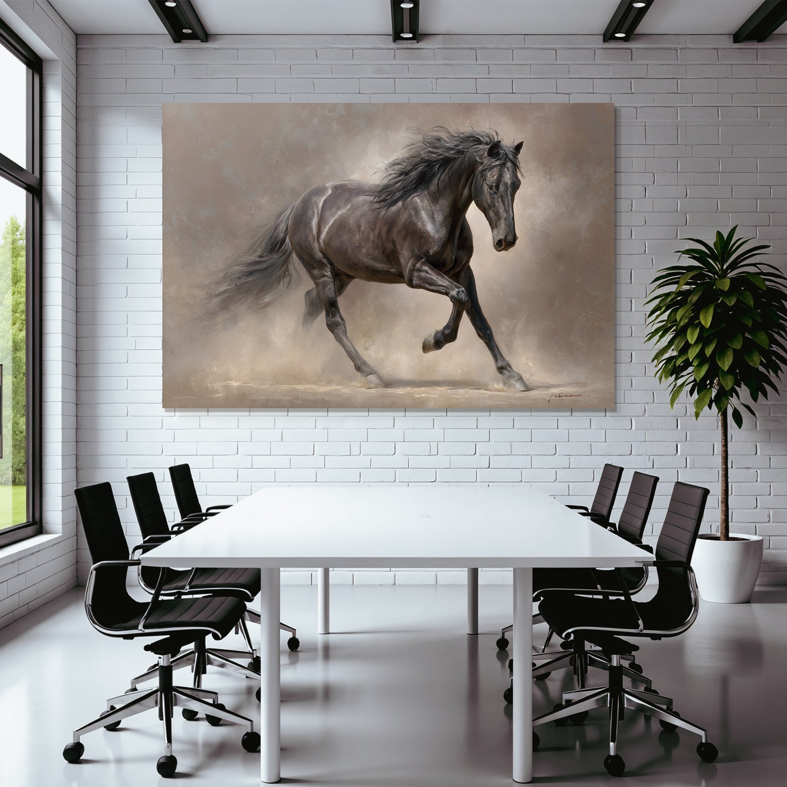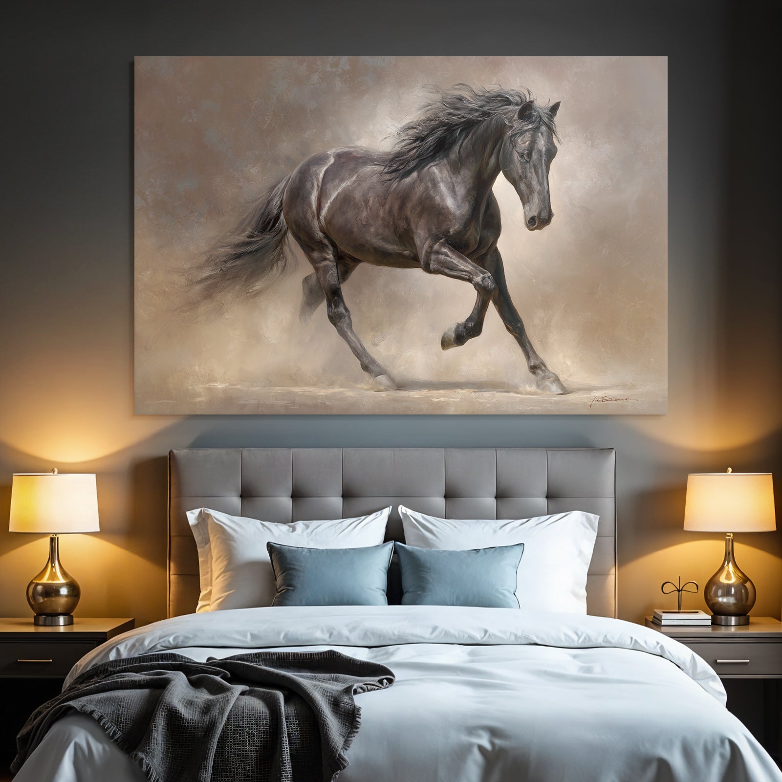Modern, stilvoll, individuell: „„Pferd In Bewegung Eleganz Und Staerke““ im Stil Klassisch überzeugt im hochwertigen FameFrame durch klare Formen und starke Farben.