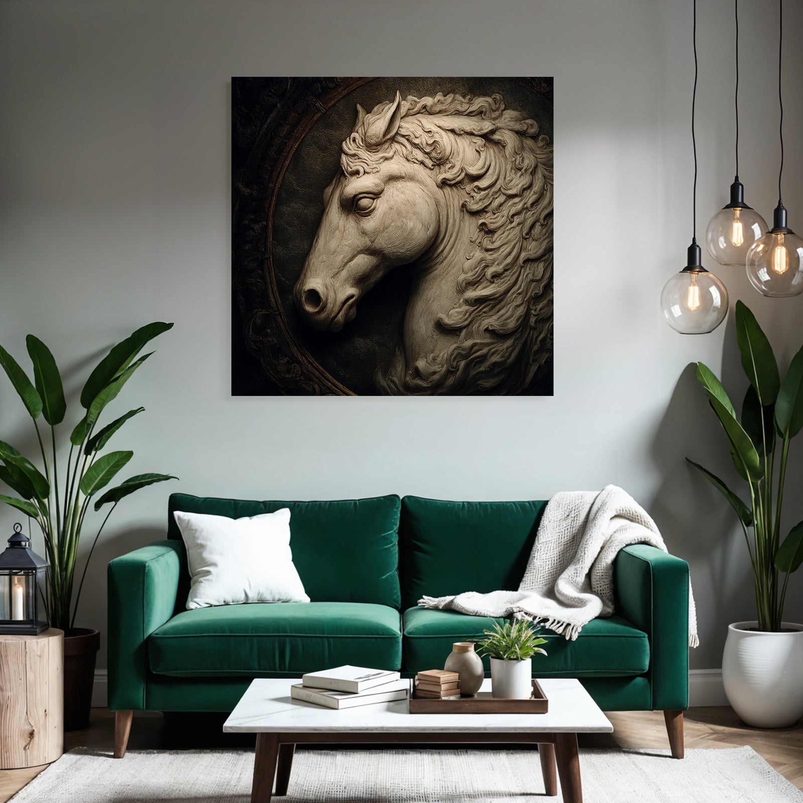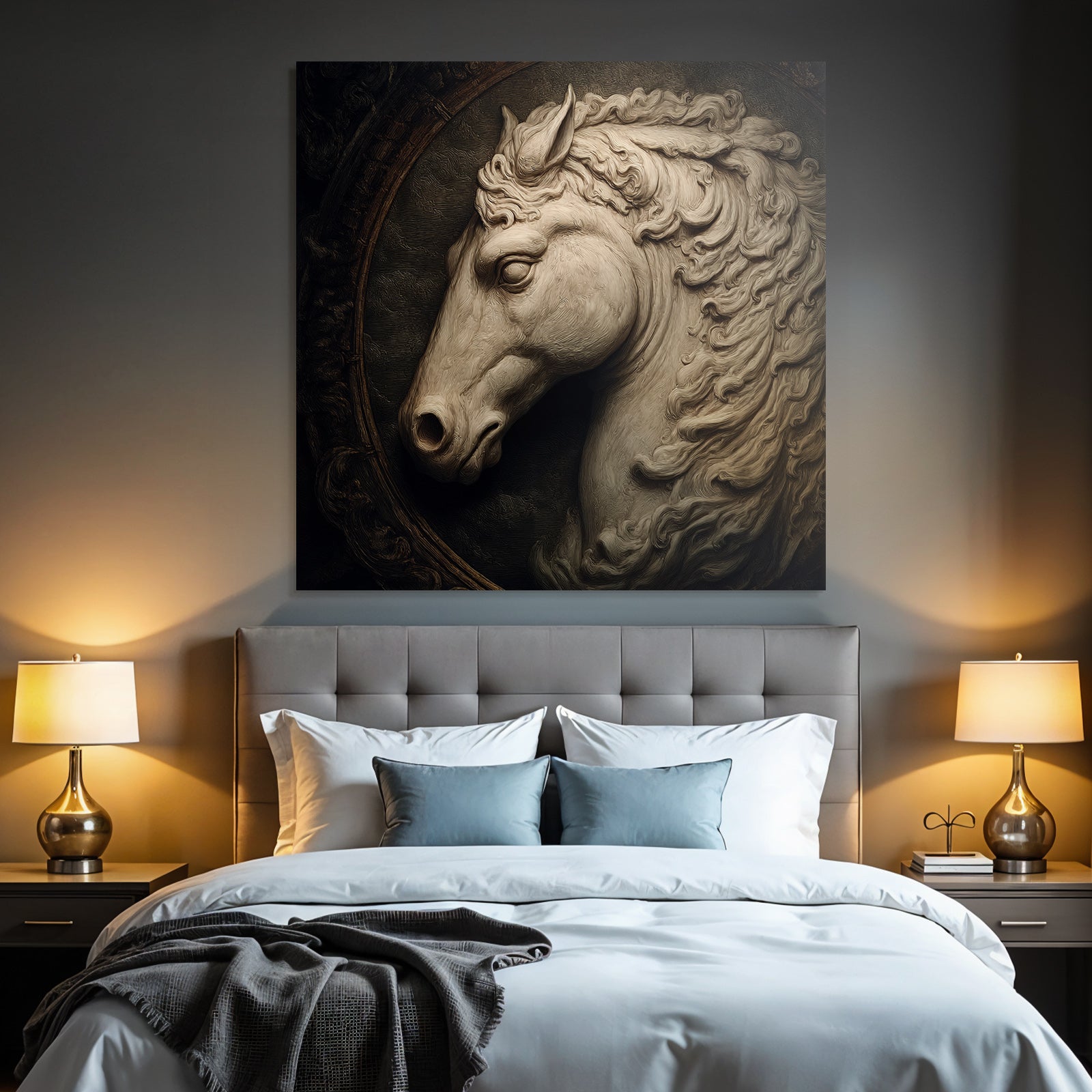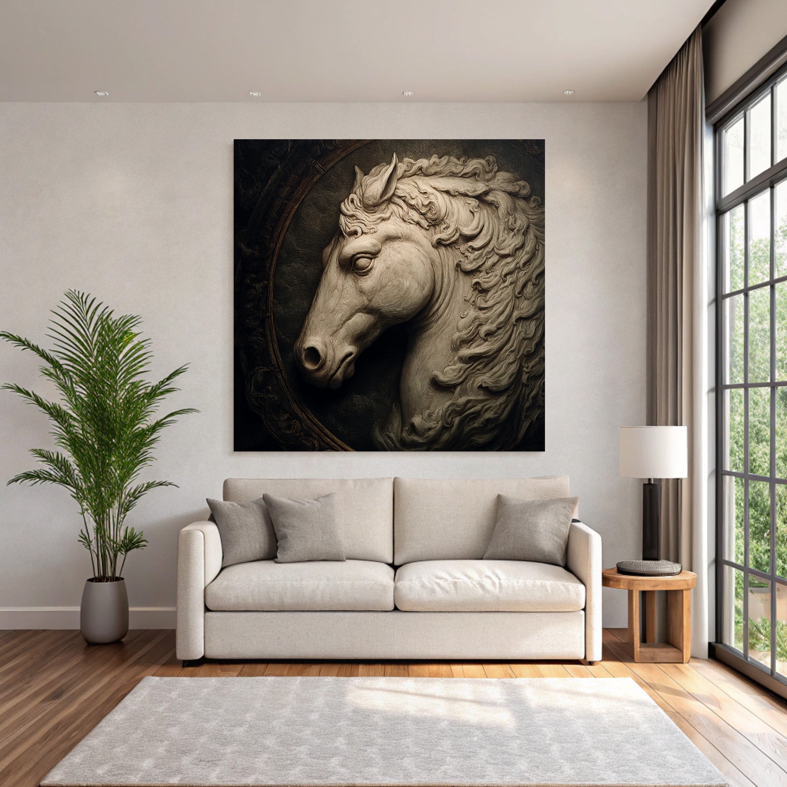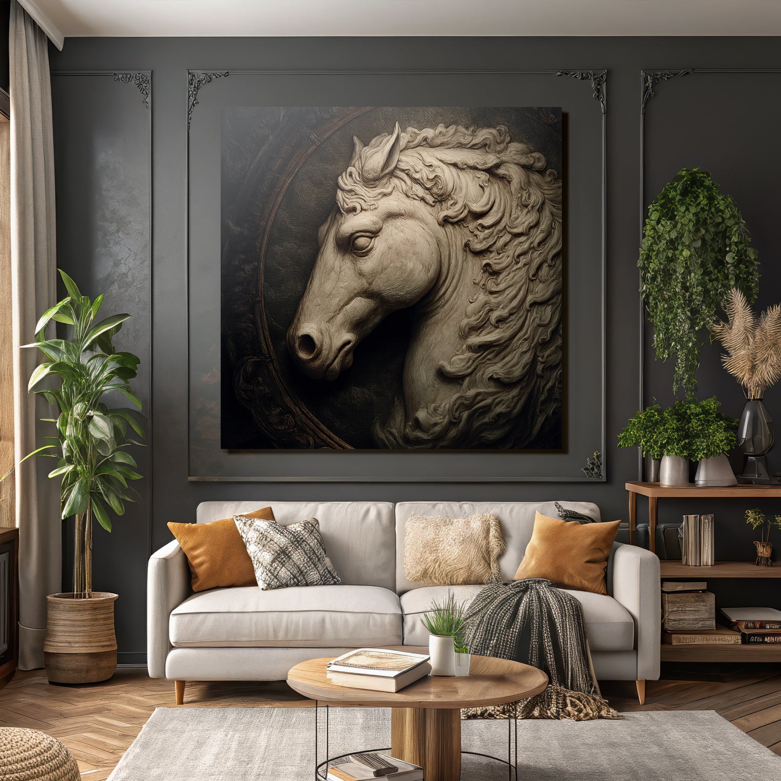 „„Pferdekopf Skulptur Detailreiche Texturen““ bringt den Stil Klassisch an Deine Wand – perfekt für Schlafzimmer, Homeoffice oder Besprechungsräume, edel gerahmt im FameFrame.