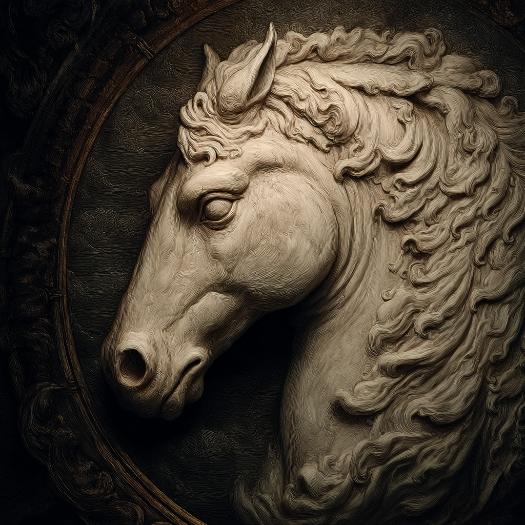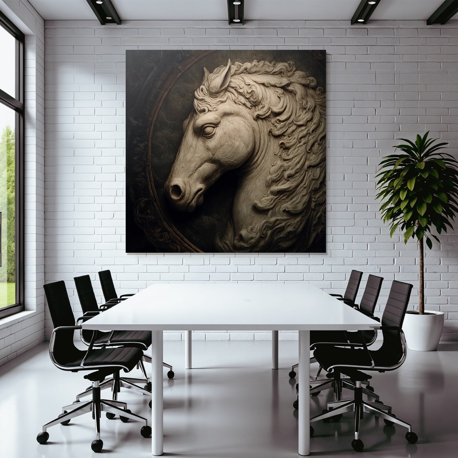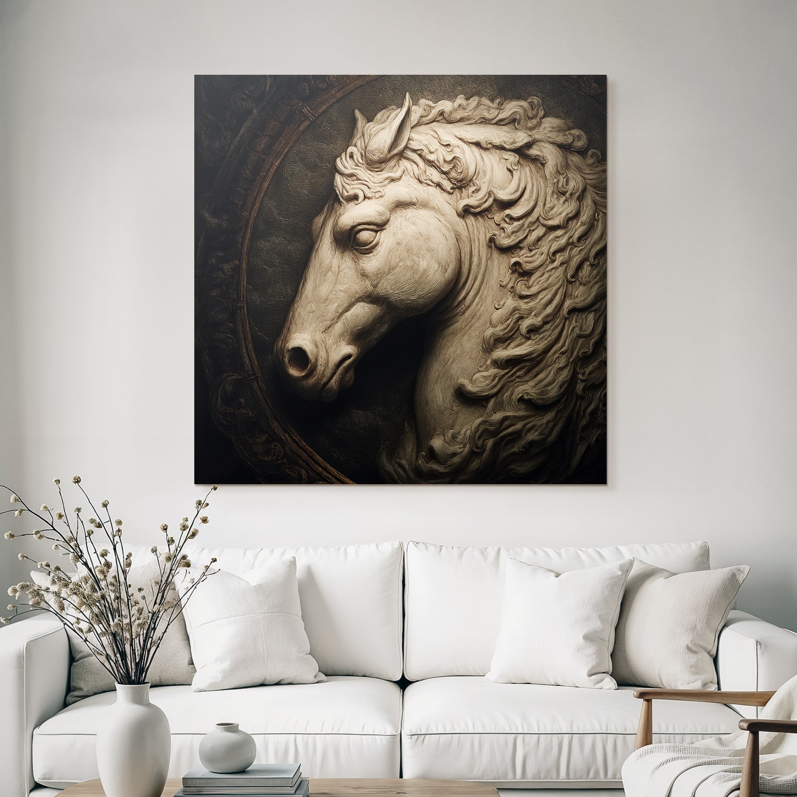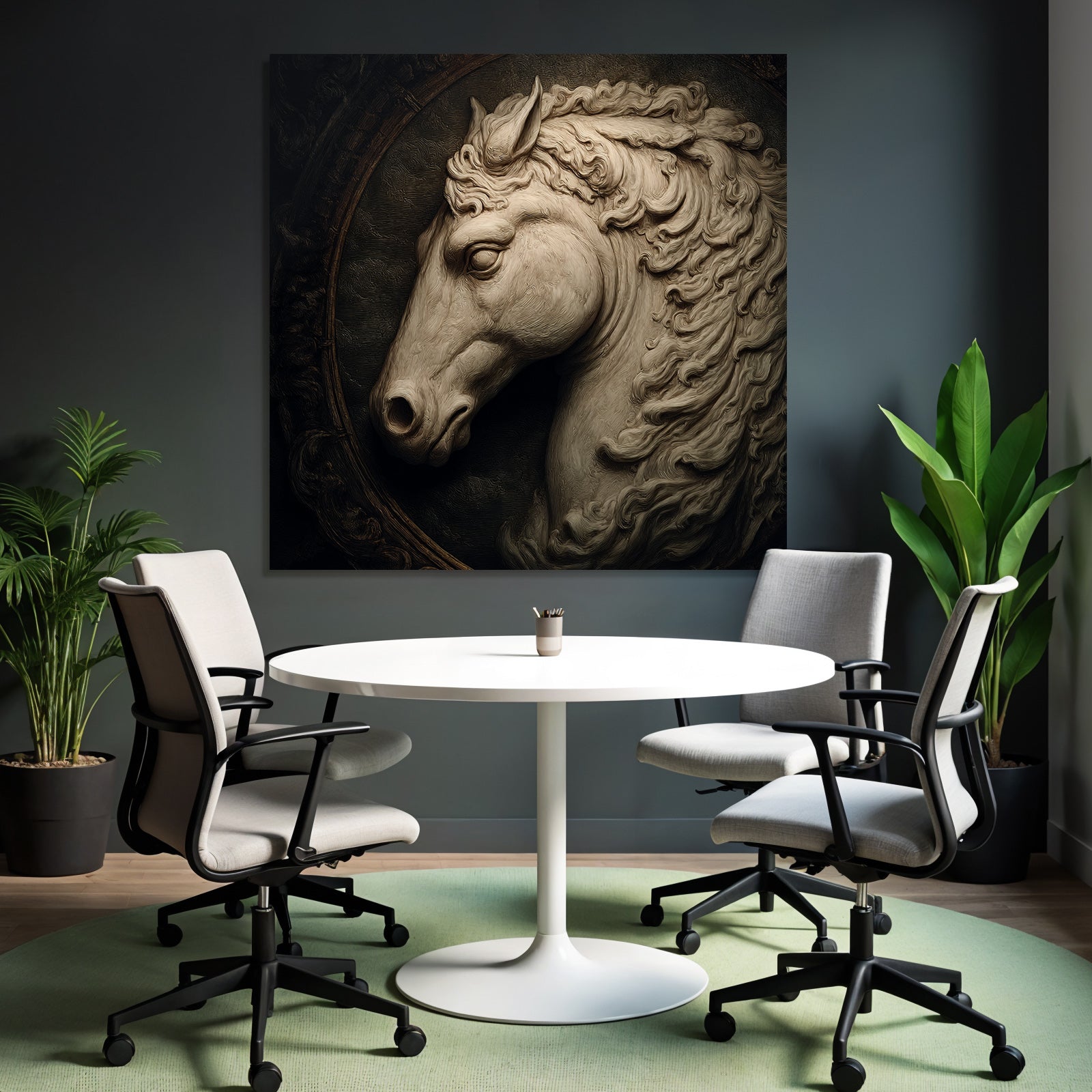„„Pferdekopf Skulptur Detailreiche Texturen““ bringt den Stil Klassisch an Deine Wand – perfekt für Schlafzimmer, Homeoffice oder Besprechungsräume, edel gerahmt im FameFrame.