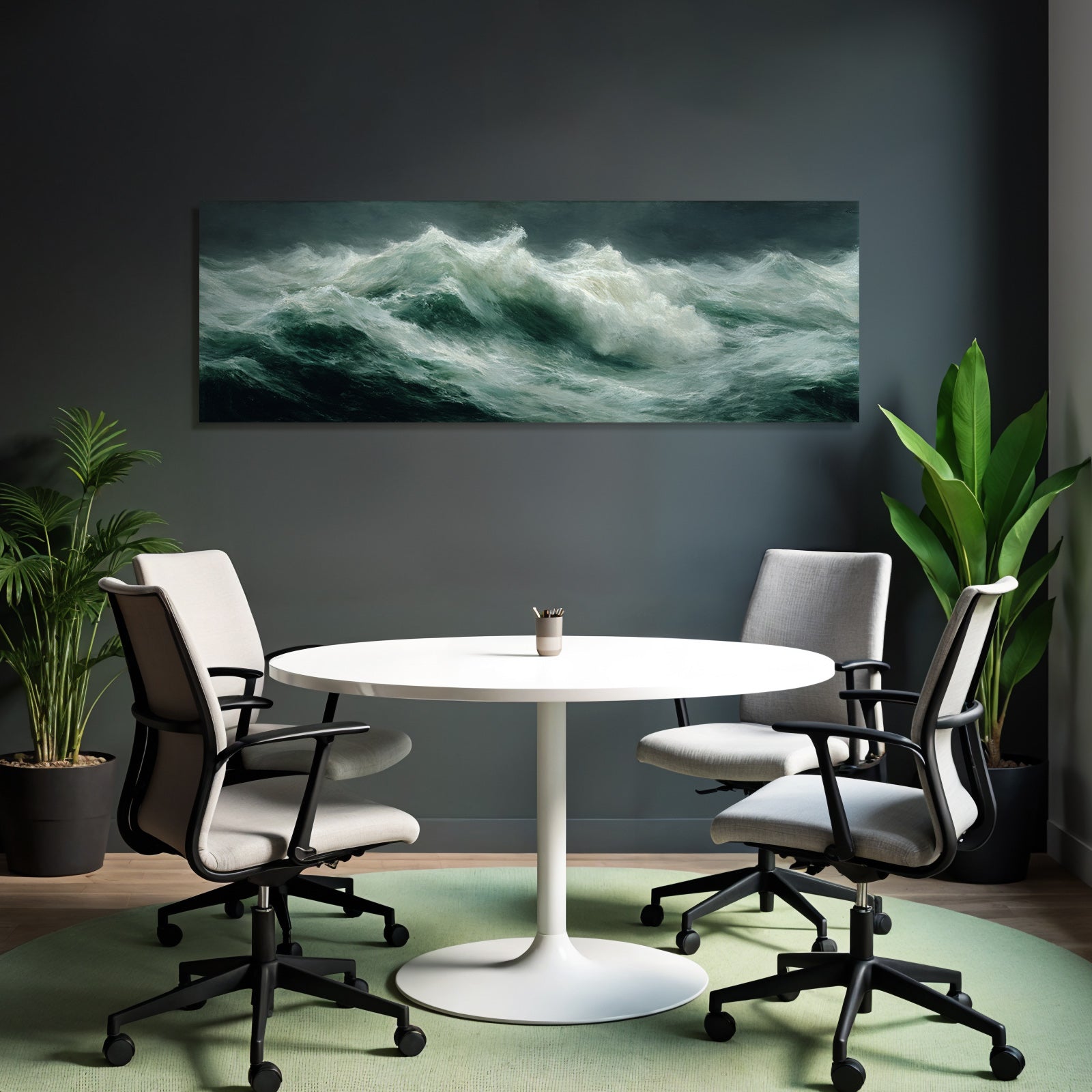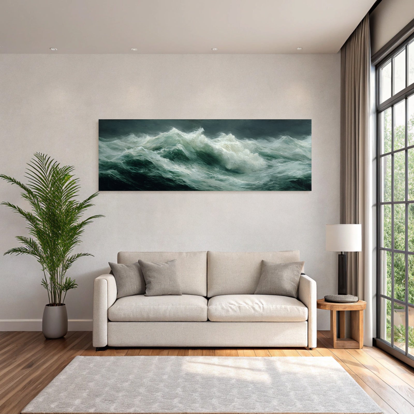 Mit Klassisch-Elementen und klarer Wirkung verleiht „„Turbulente Ozeanwellen Sturmhimmel Maritimes Gemaelde““ Deinem Raum Persönlichkeit – eingerahmt im exklusiven FameFrame.