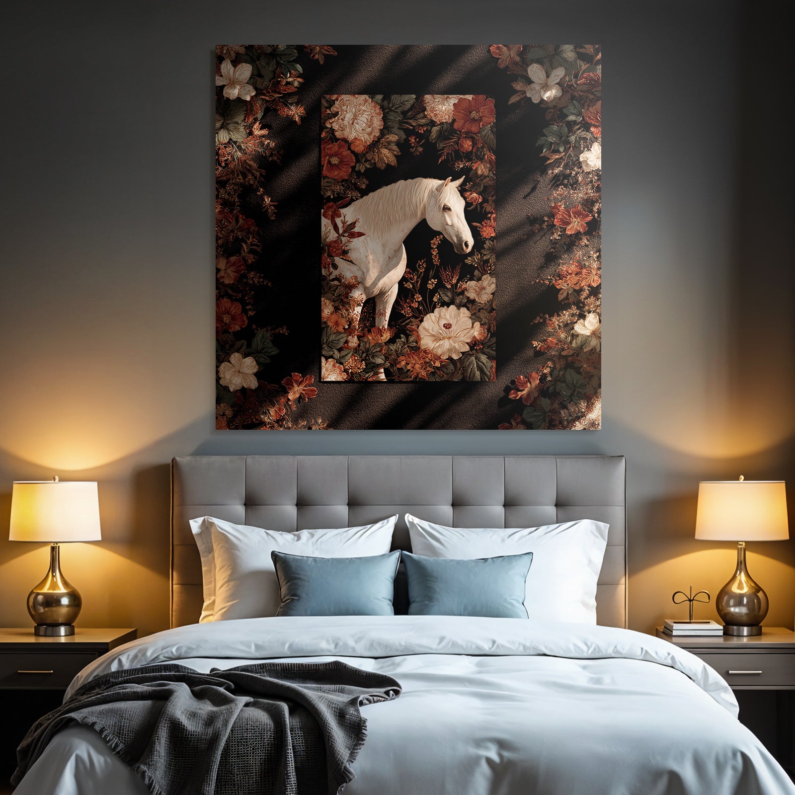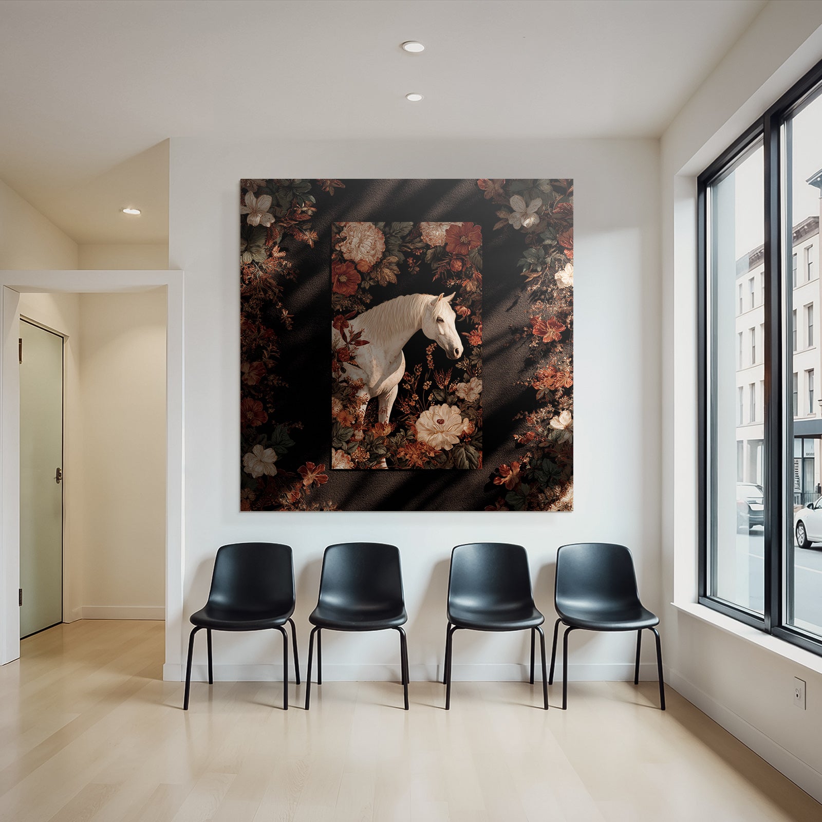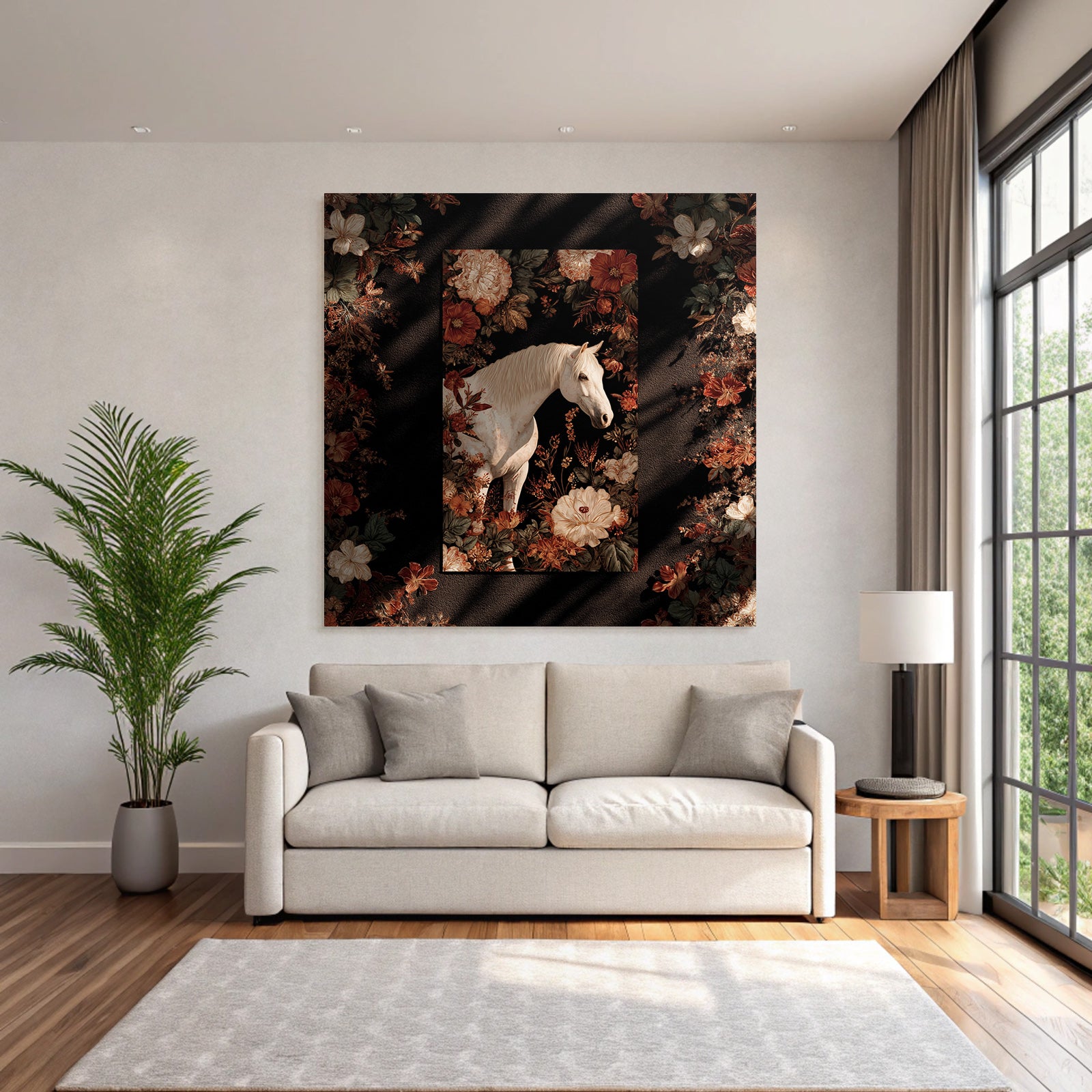 Erlebe Kunst im Stil Klassisch neu: „„Weisser Pferd Blumen Erkundung Kunstvoll Dunkler Hintergrund““ wird durch den eleganten FameFrame zum Blickfang in jedem Raum.