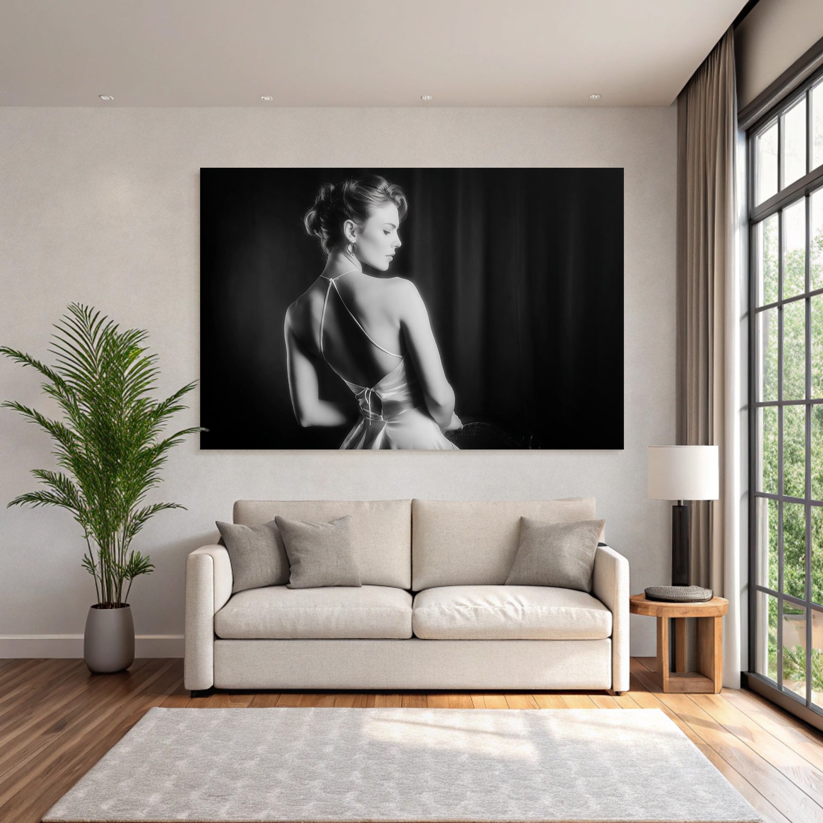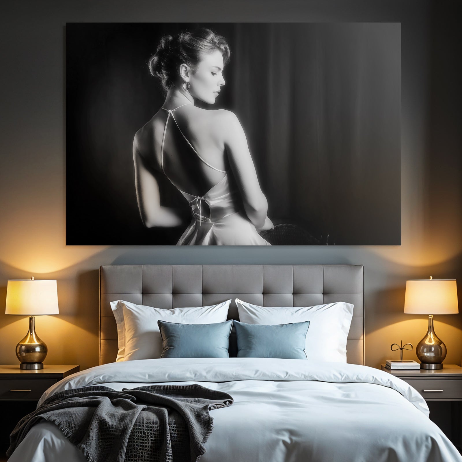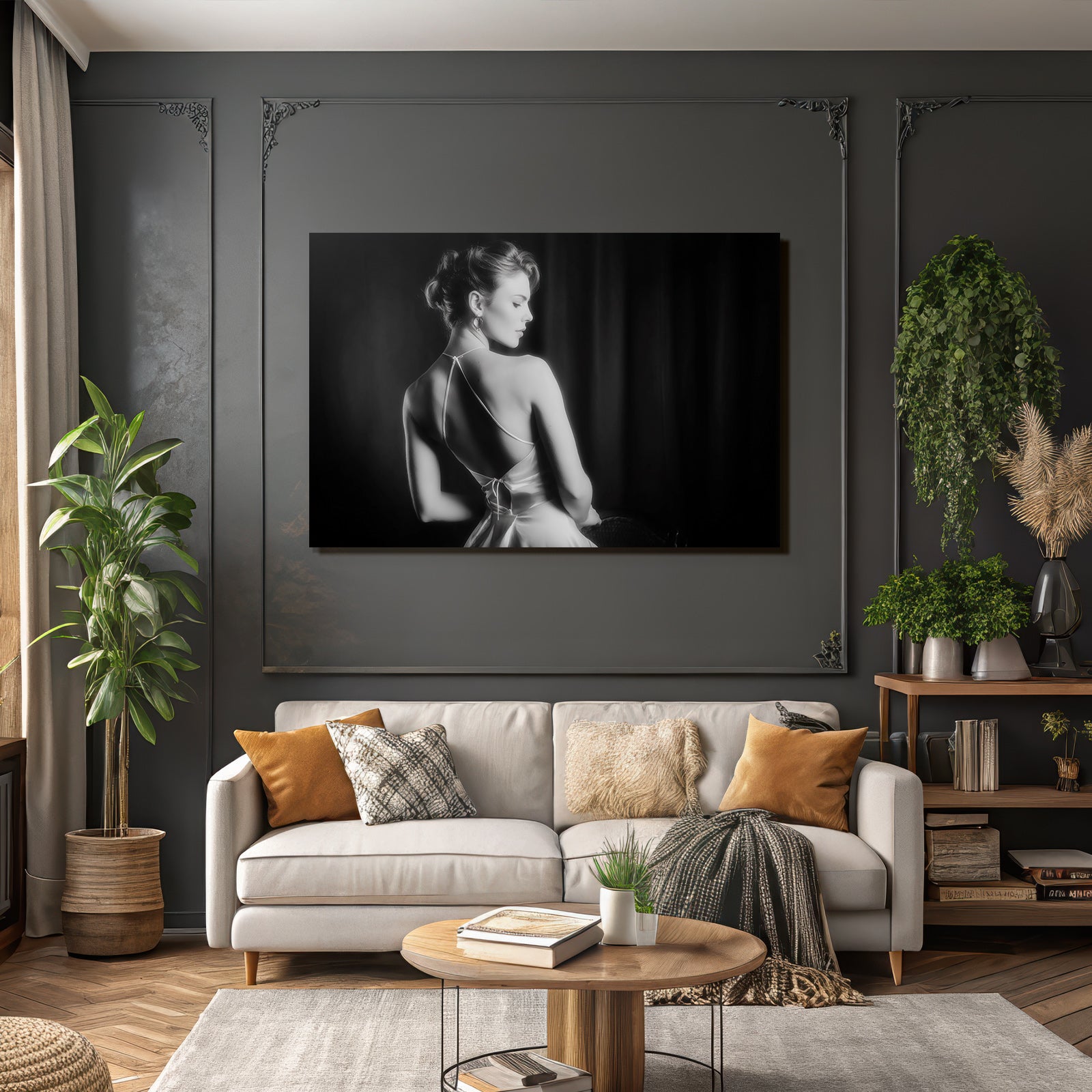 Verwandeln Sie Ihr Schlafzimmer in eine Oase der Ruhe. Das Motiv „Dame In Elegantem Kleid Schwarz Und Weiss“ im Stil Aktkunst und Sinnlichkeit wirkt im FameFrame™ besonders harmonisch und beruhigend.