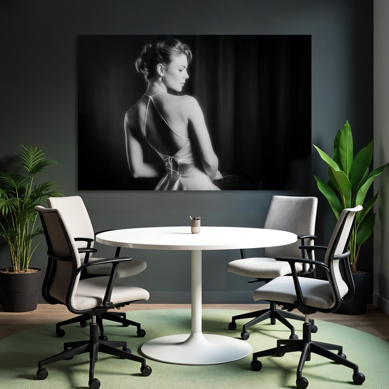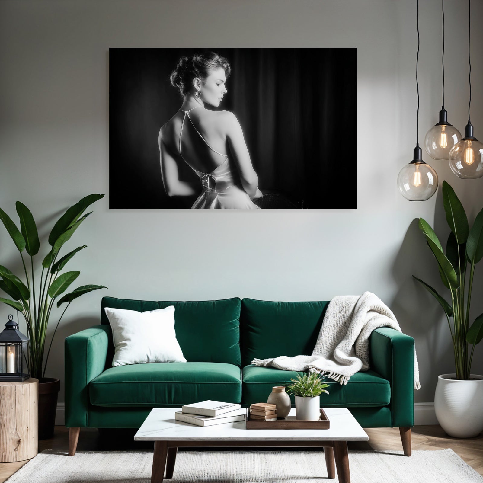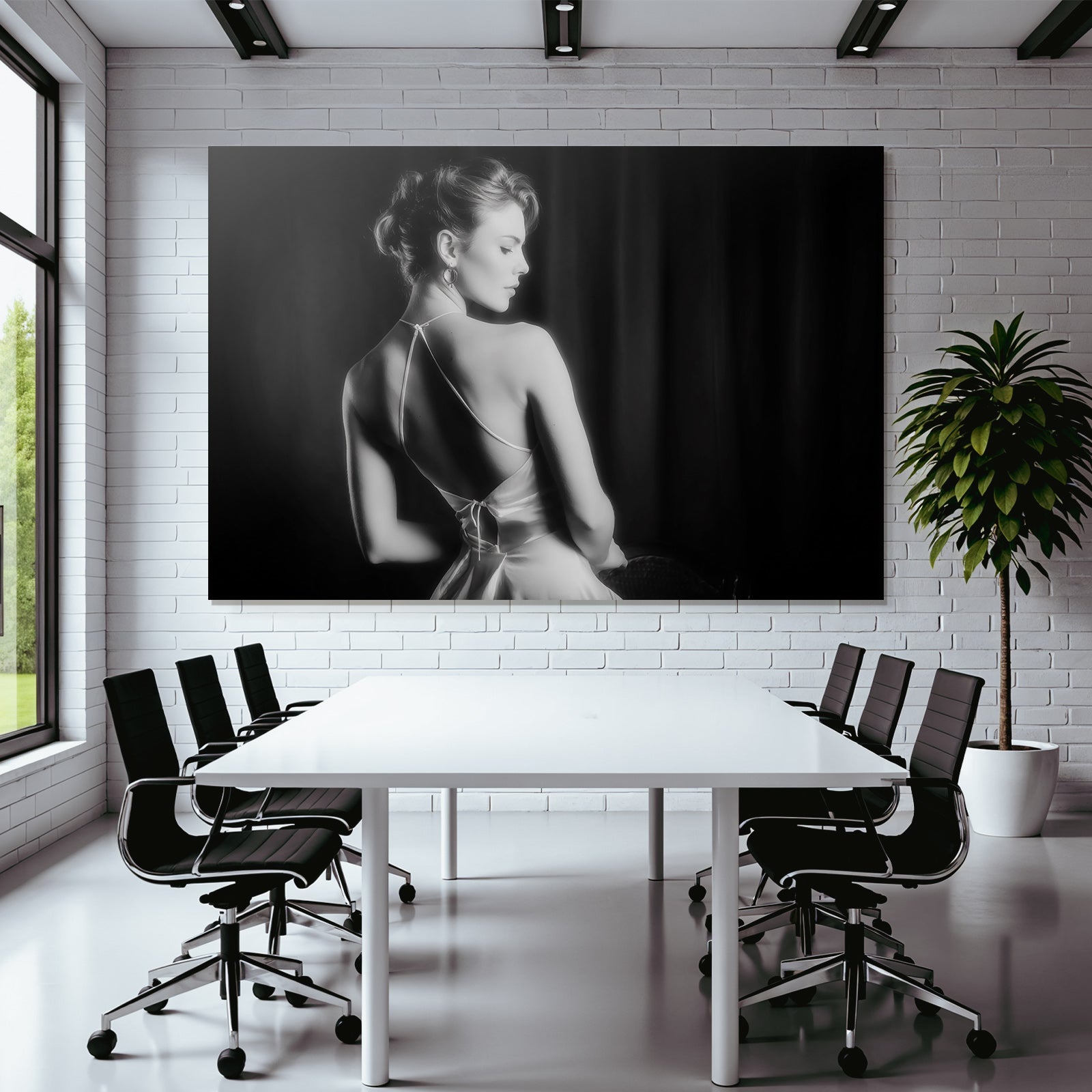 Verwandeln Sie Ihr Schlafzimmer in eine Oase der Ruhe. Das Motiv „Dame In Elegantem Kleid Schwarz Und Weiss“ im Stil Aktkunst und Sinnlichkeit wirkt im FameFrame™ besonders harmonisch und beruhigend.