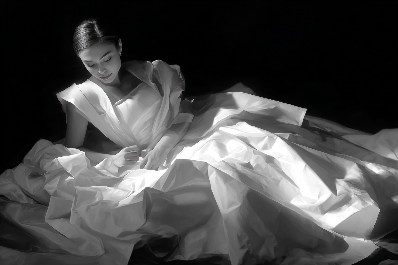 Verleihe Lobby, Wartezimmer oder Studio eine besondere Atmosphäre mit „Person In Fliessendem Gewae Kleid Portrait Mode Kunst“ im Stil Aktkunst und Sinnlichkeit – eindrucksvoll im FameFrame™ präsentiert.