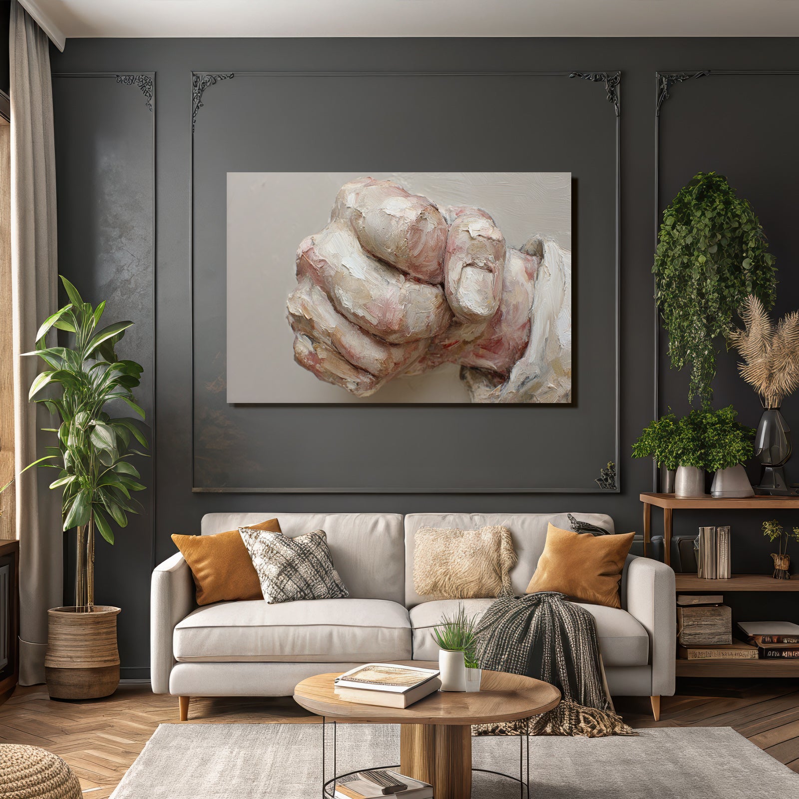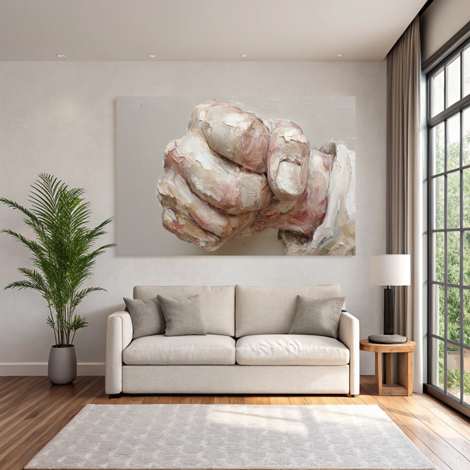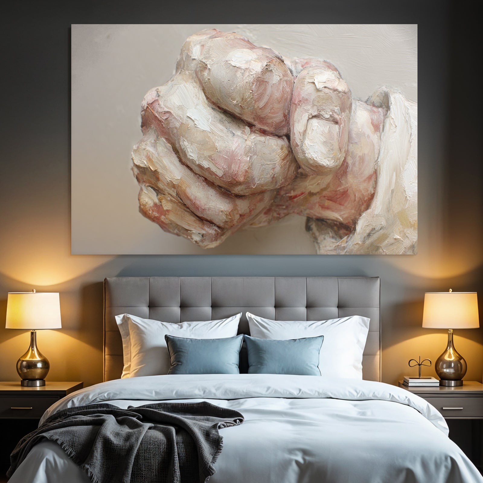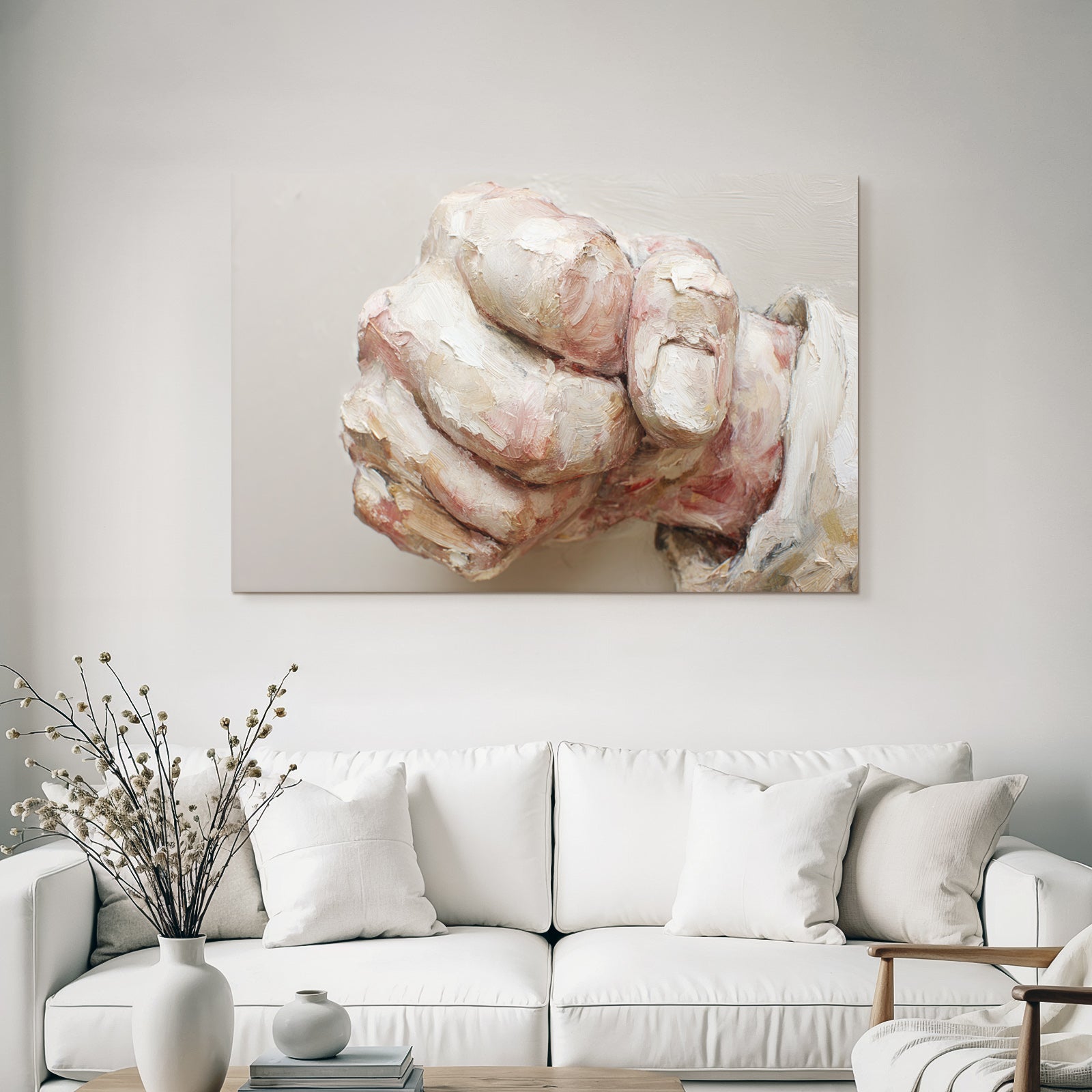 Für Liebhaber des Hände und Gestik-Looks: Das Kunstwerk „Porträts Naheaufnahme Einer Gemalten Faust Mit Textur Und Detail“ bringt die charakteristischen Merkmale dieses Stils brillant auf Stoff – perfektioniert durch den FameFrame™.