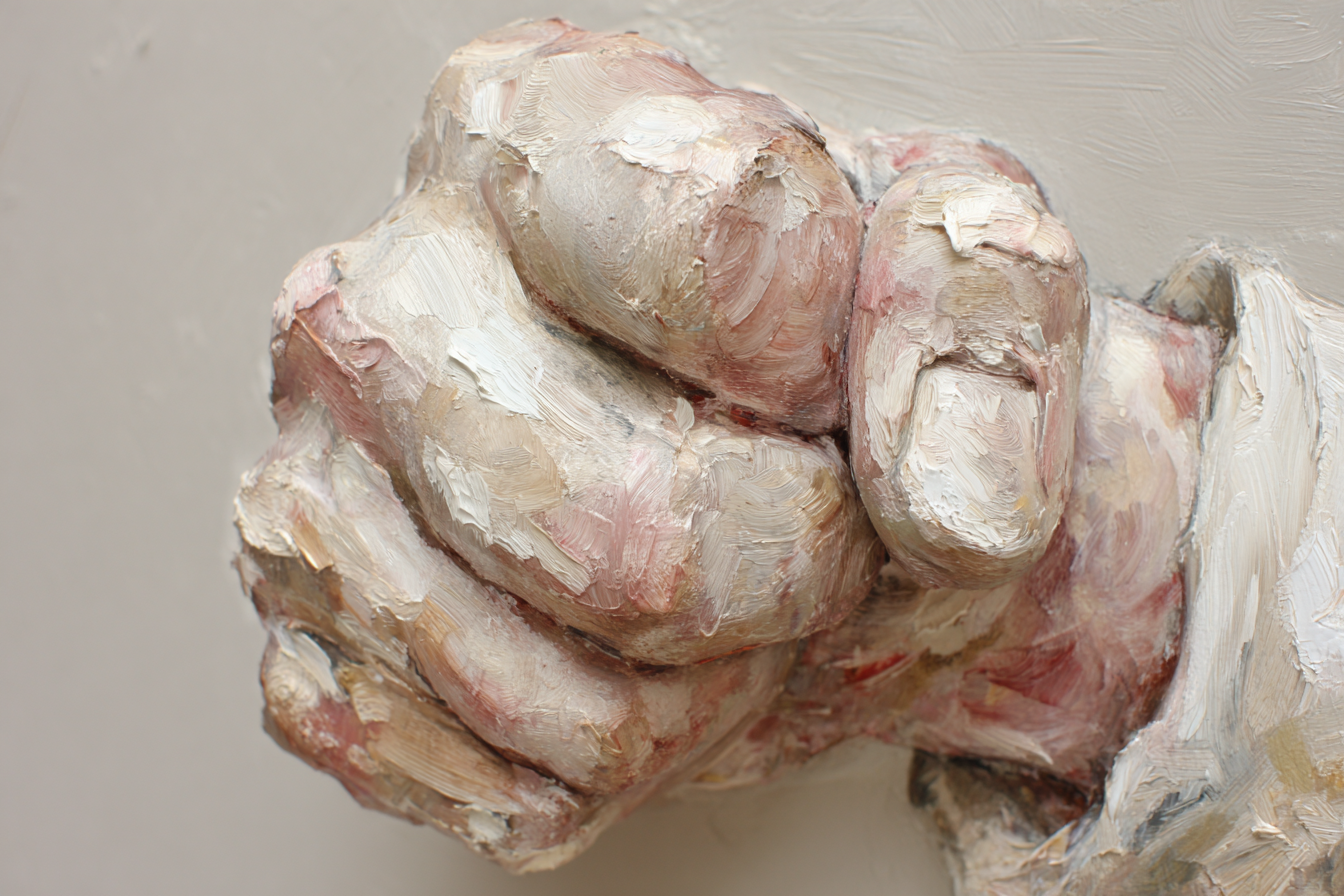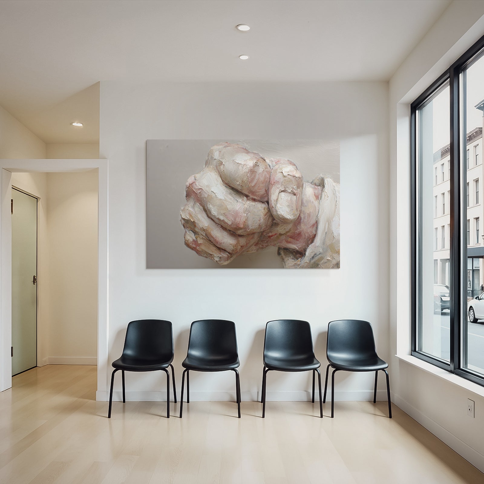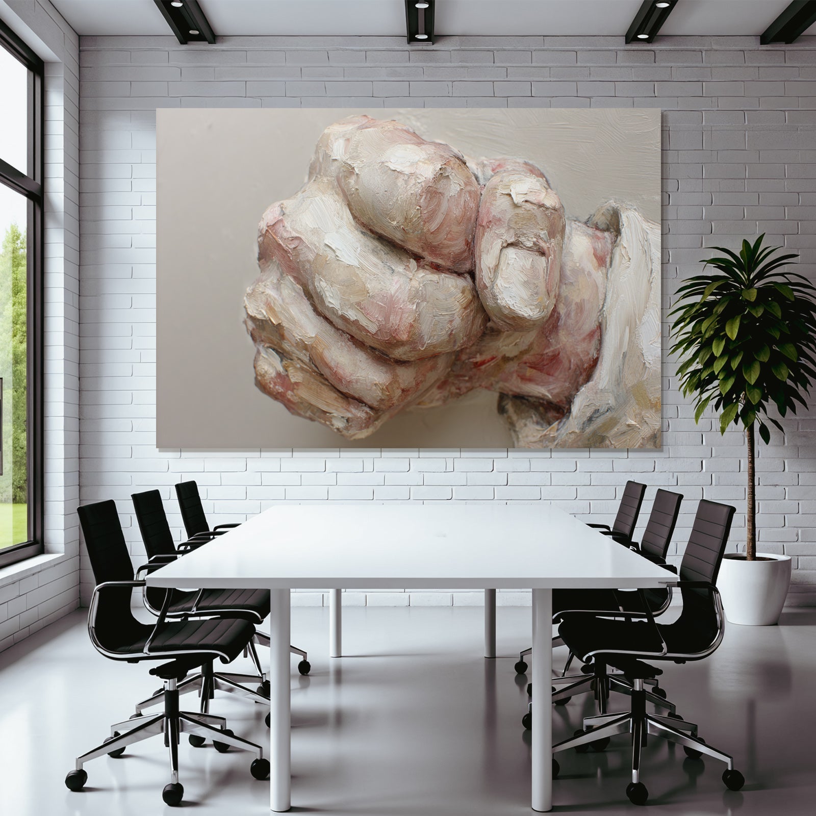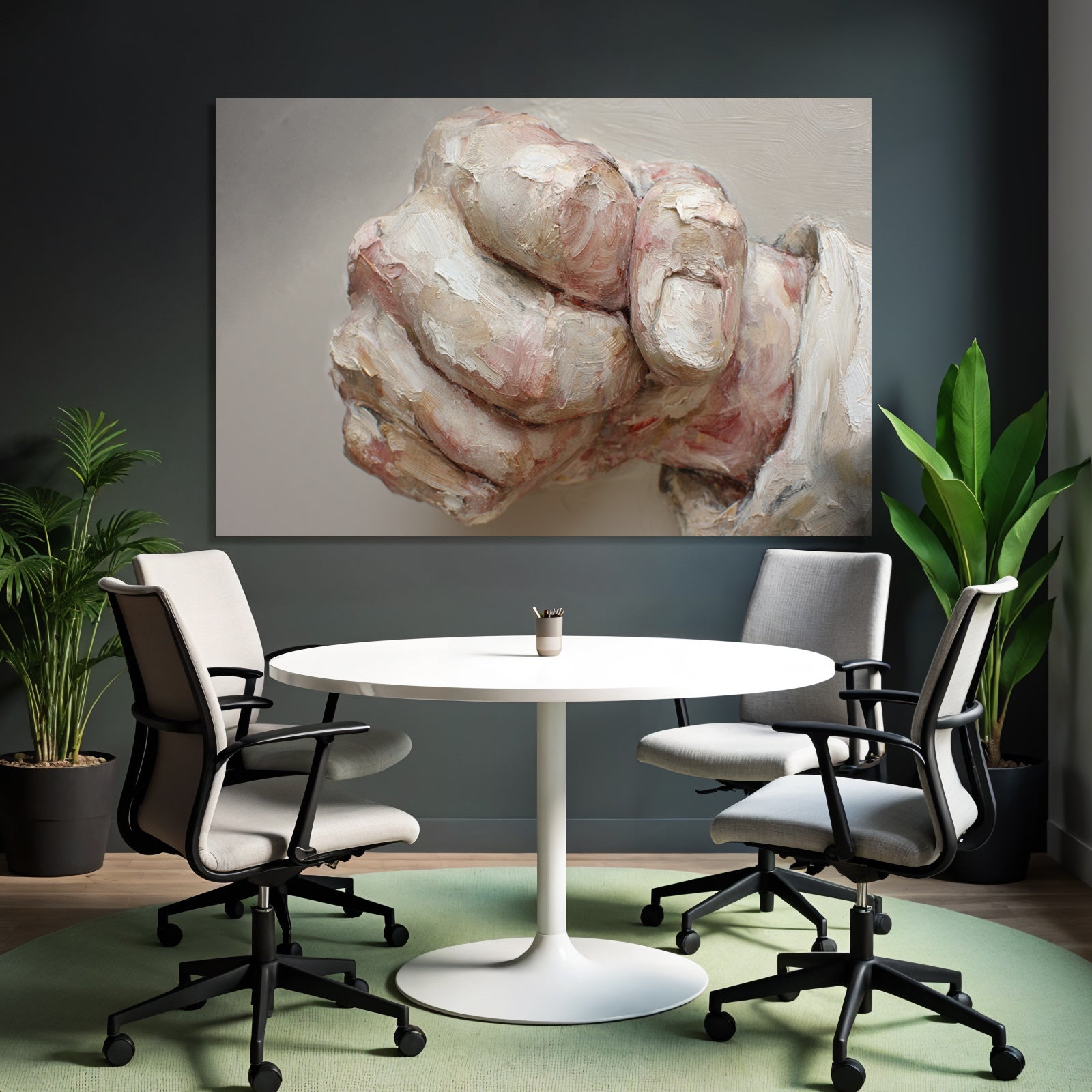 Für Liebhaber des Hände und Gestik-Looks: Das Kunstwerk „Porträts Naheaufnahme Einer Gemalten Faust Mit Textur Und Detail“ bringt die charakteristischen Merkmale dieses Stils brillant auf Stoff – perfektioniert durch den FameFrame™.