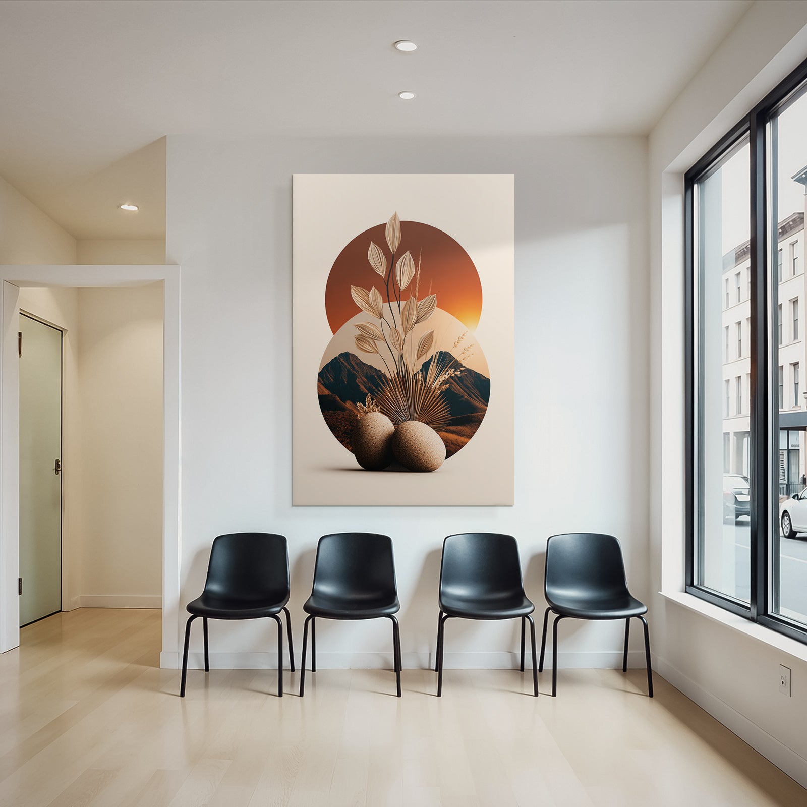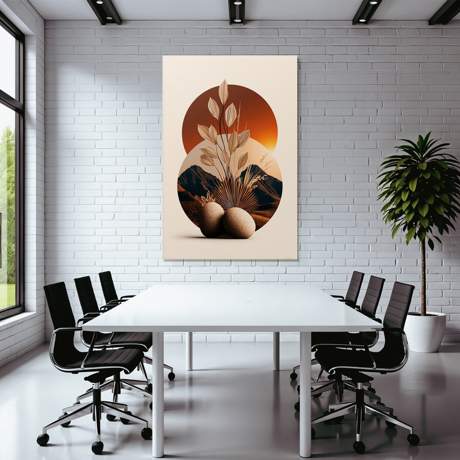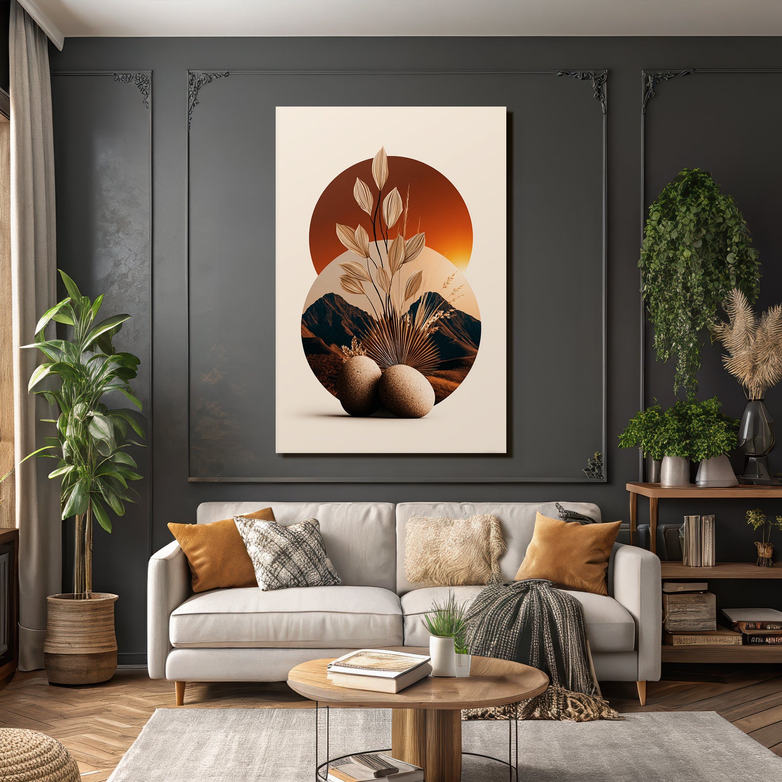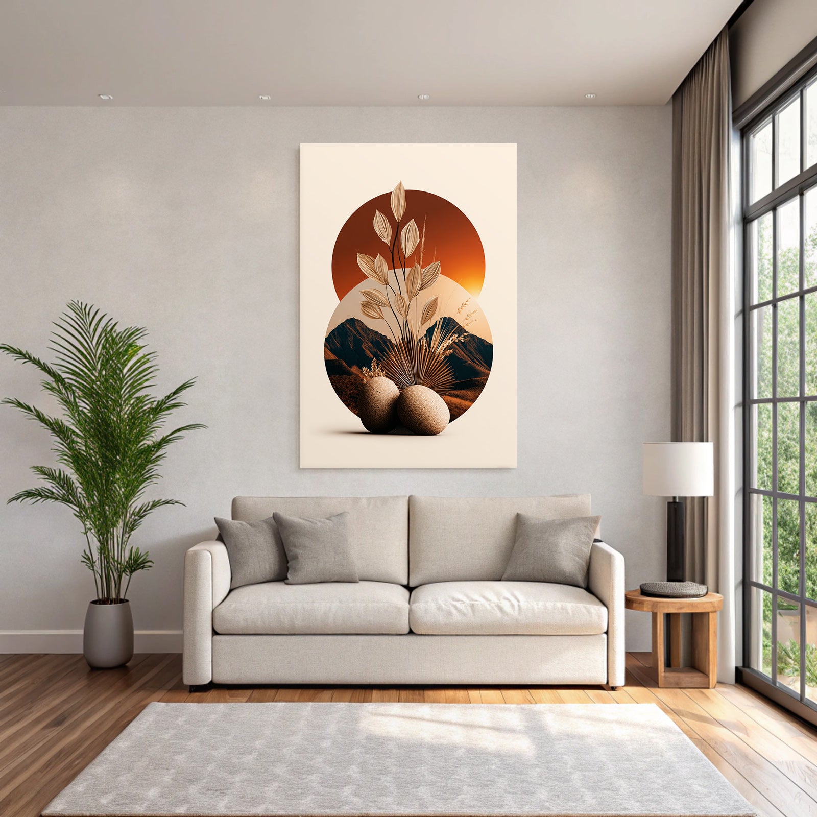 Modern, stilvoll, individuell: „„Abstrakte Naturdesign Mit Blaettern Und Sonnenuntergang““ im Stil Collagen überzeugt im hochwertigen FameFrame durch klare Formen und starke Farben.