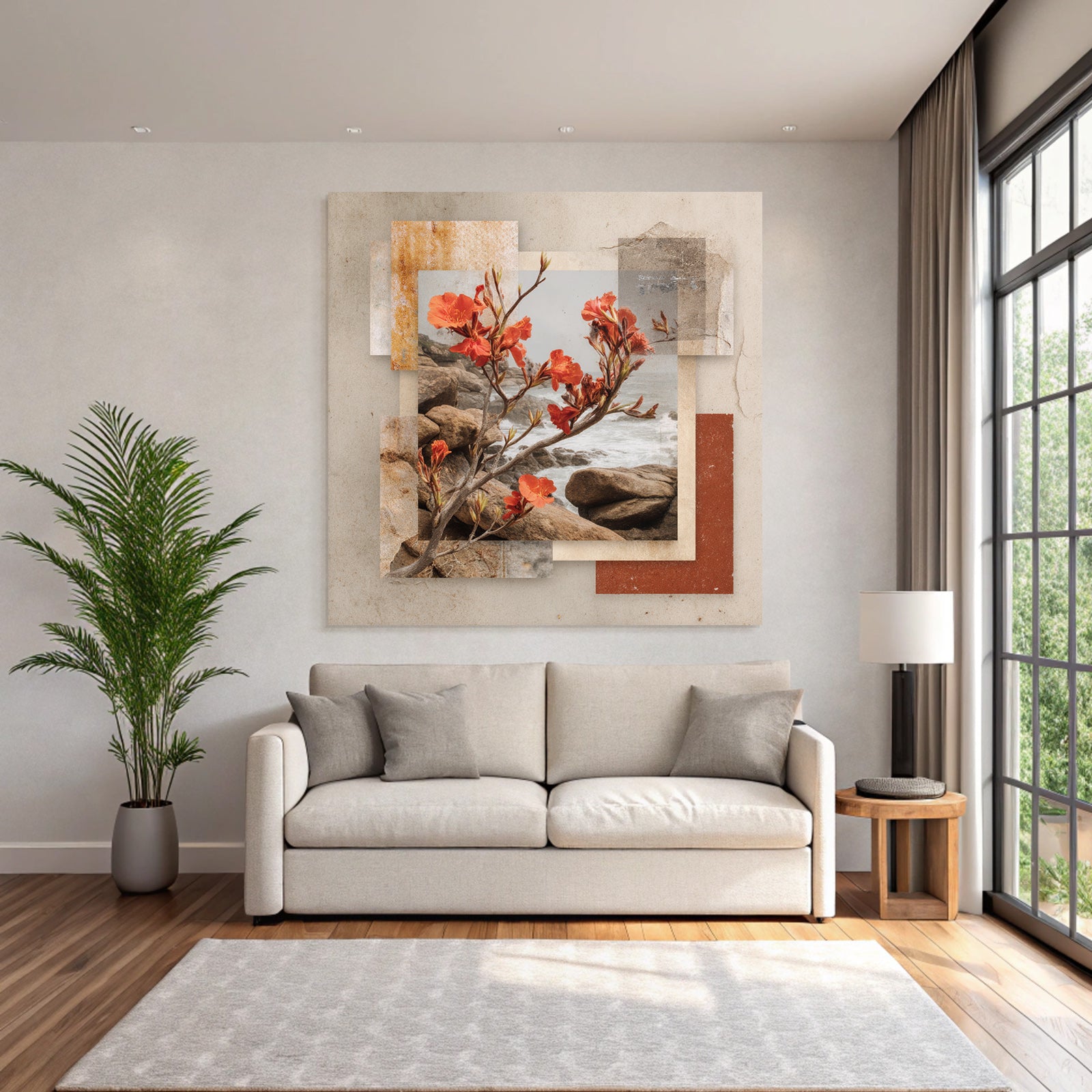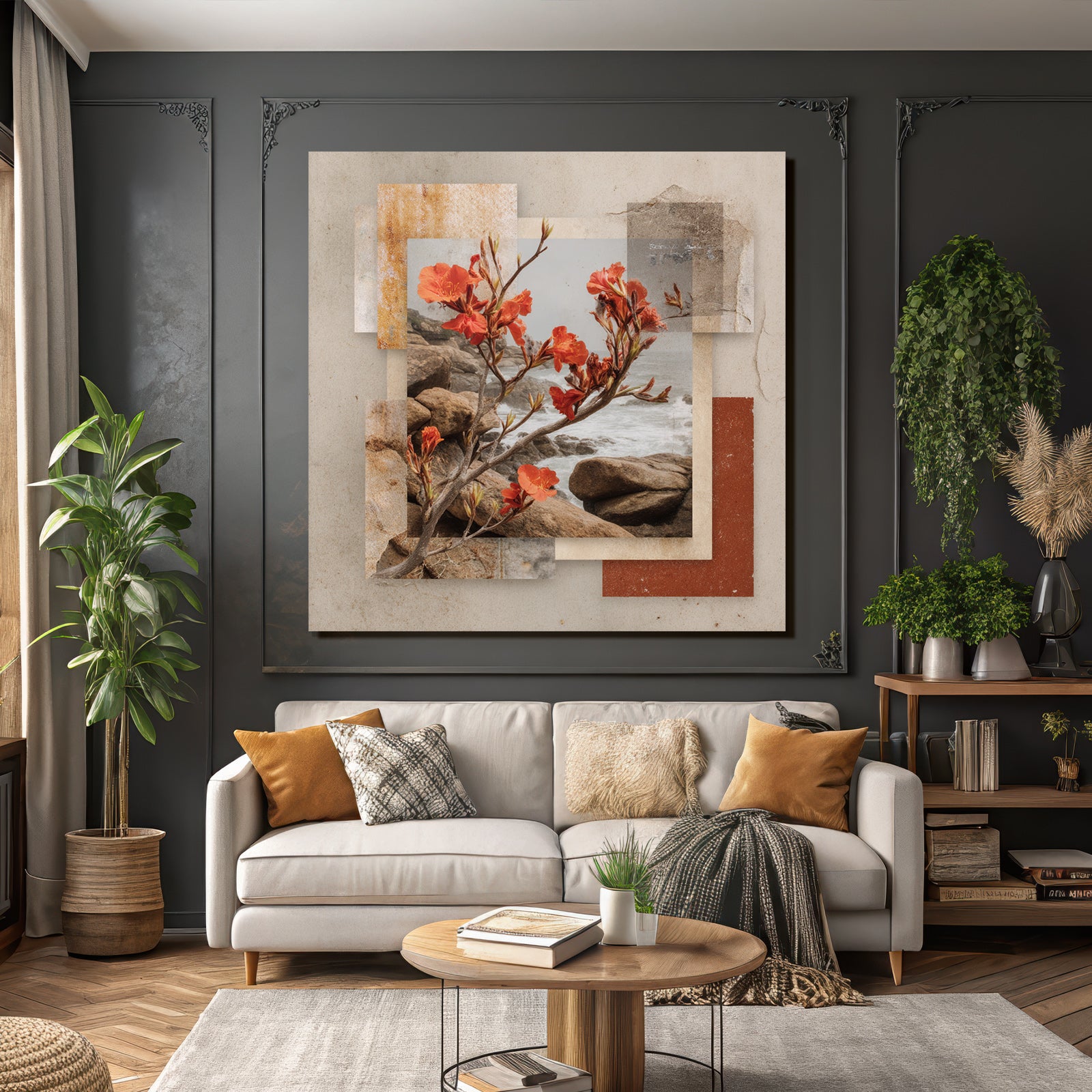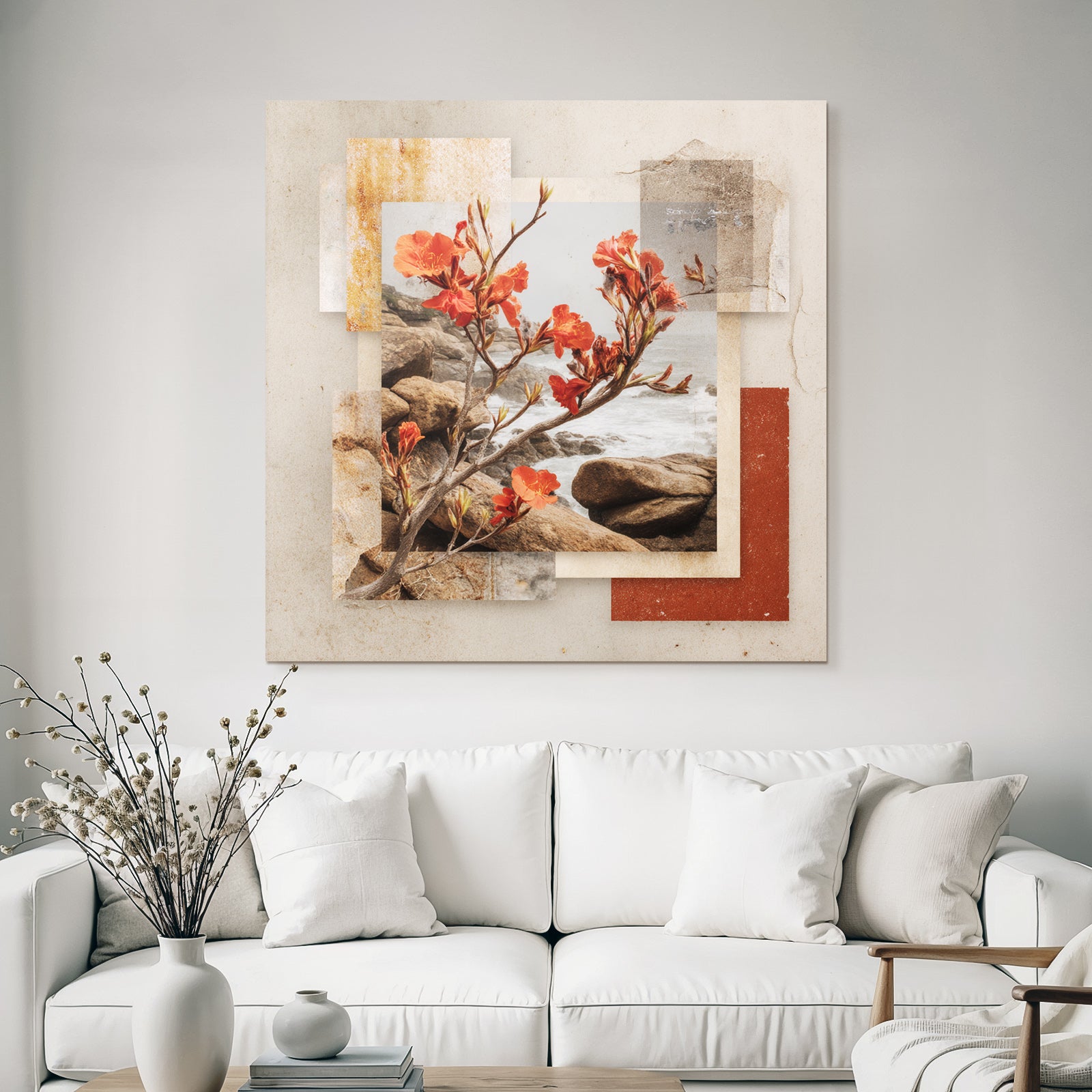 Verschönere Dein Zuhause mit diesem Werk im Stil Collagen. Der Titel „„Bluetenzweig Gegen Hintergrund Von Felsen Und Meer““ kommt im hochwertigen FameFrame perfekt zur Geltung.