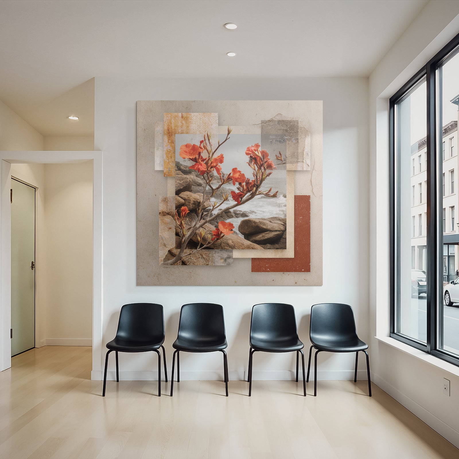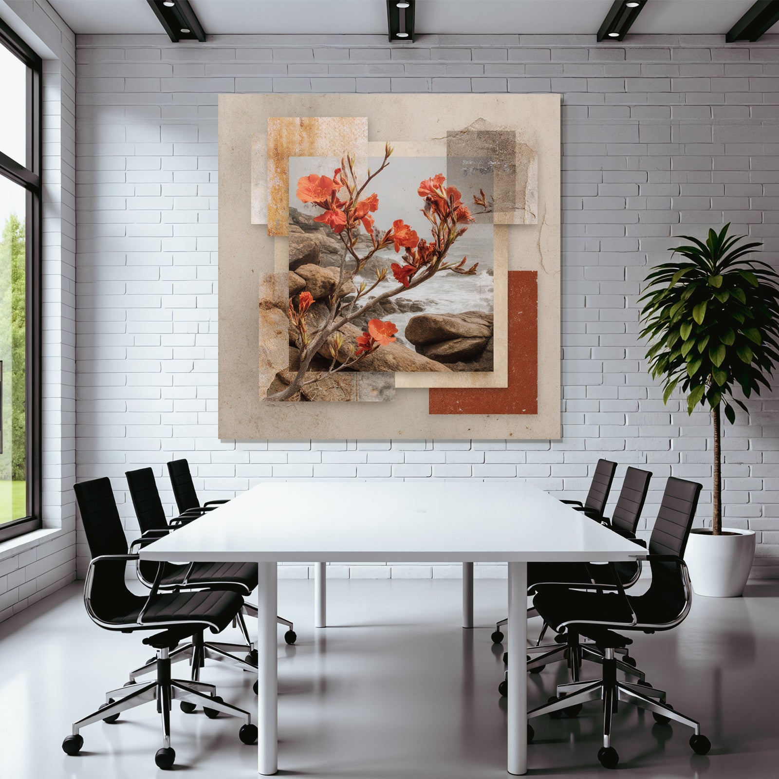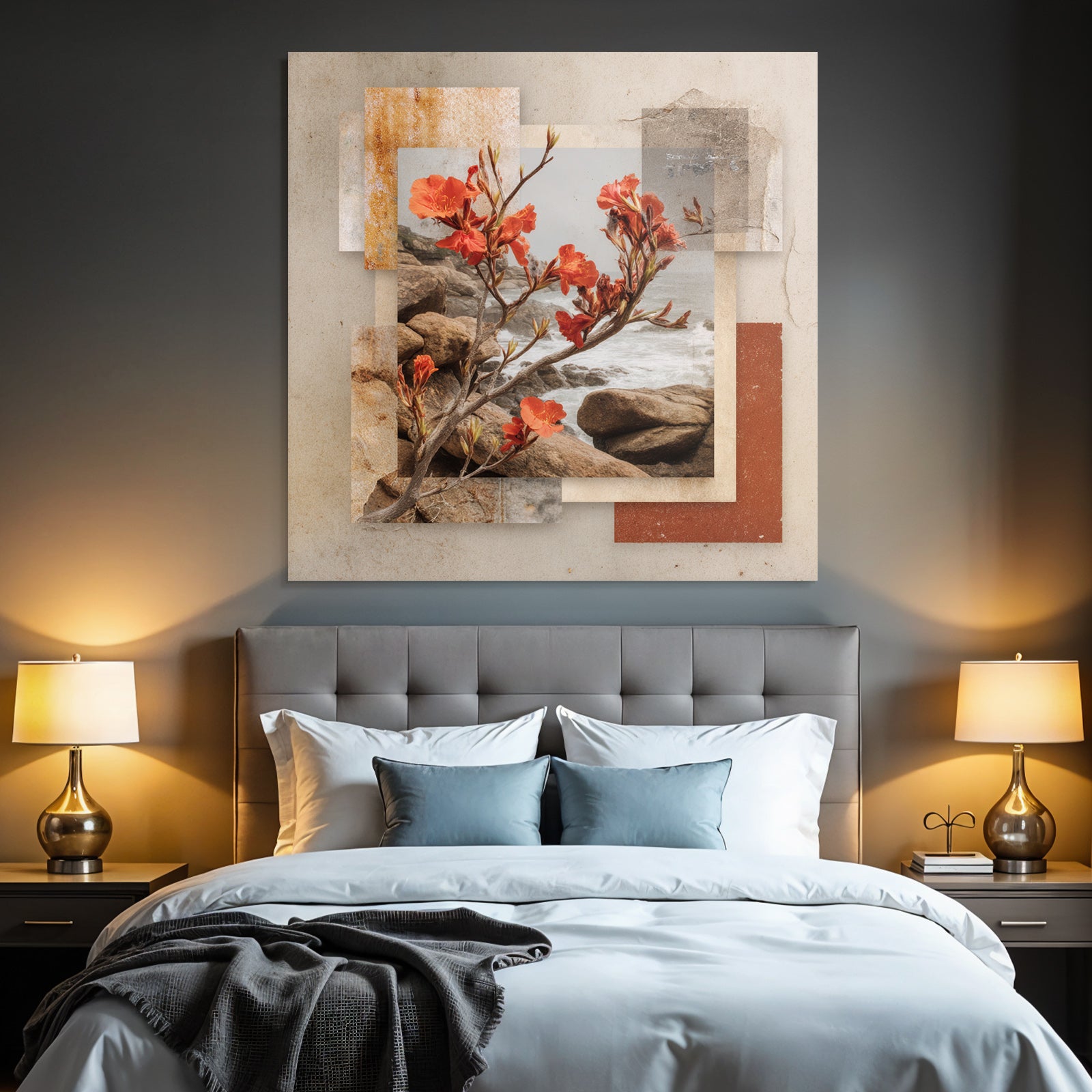 Verschönere Dein Zuhause mit diesem Werk im Stil Collagen. Der Titel „„Bluetenzweig Gegen Hintergrund Von Felsen Und Meer““ kommt im hochwertigen FameFrame perfekt zur Geltung.