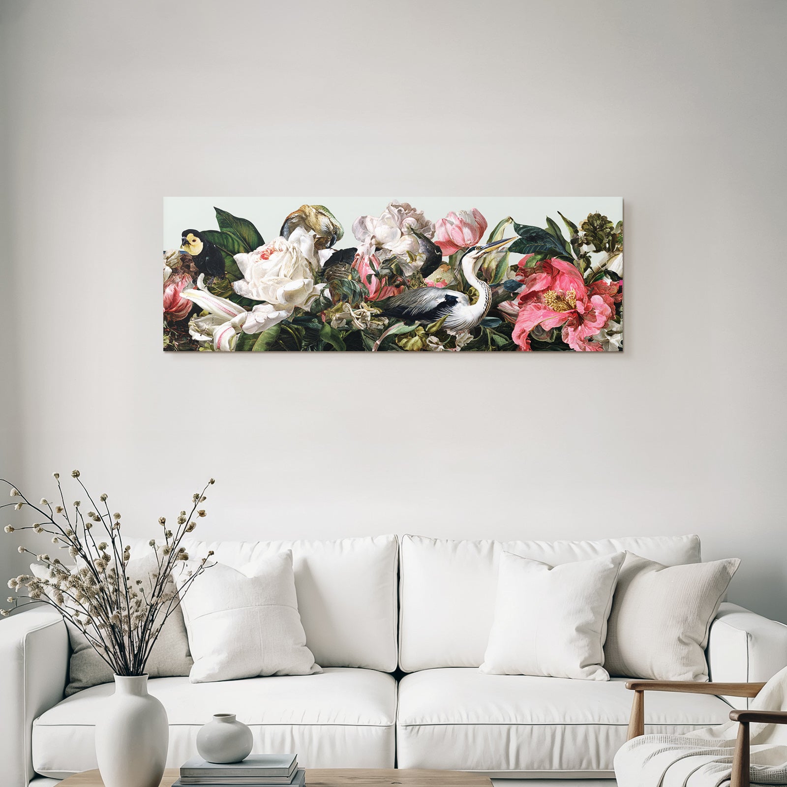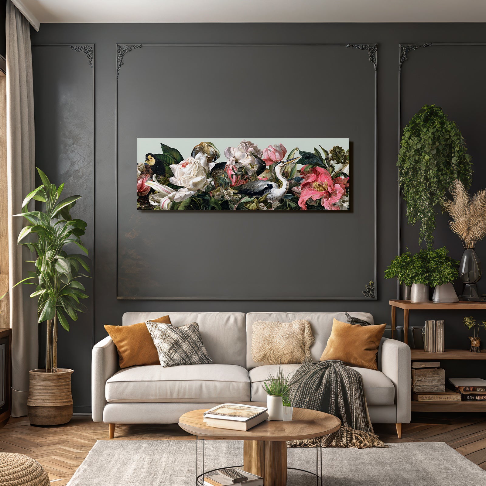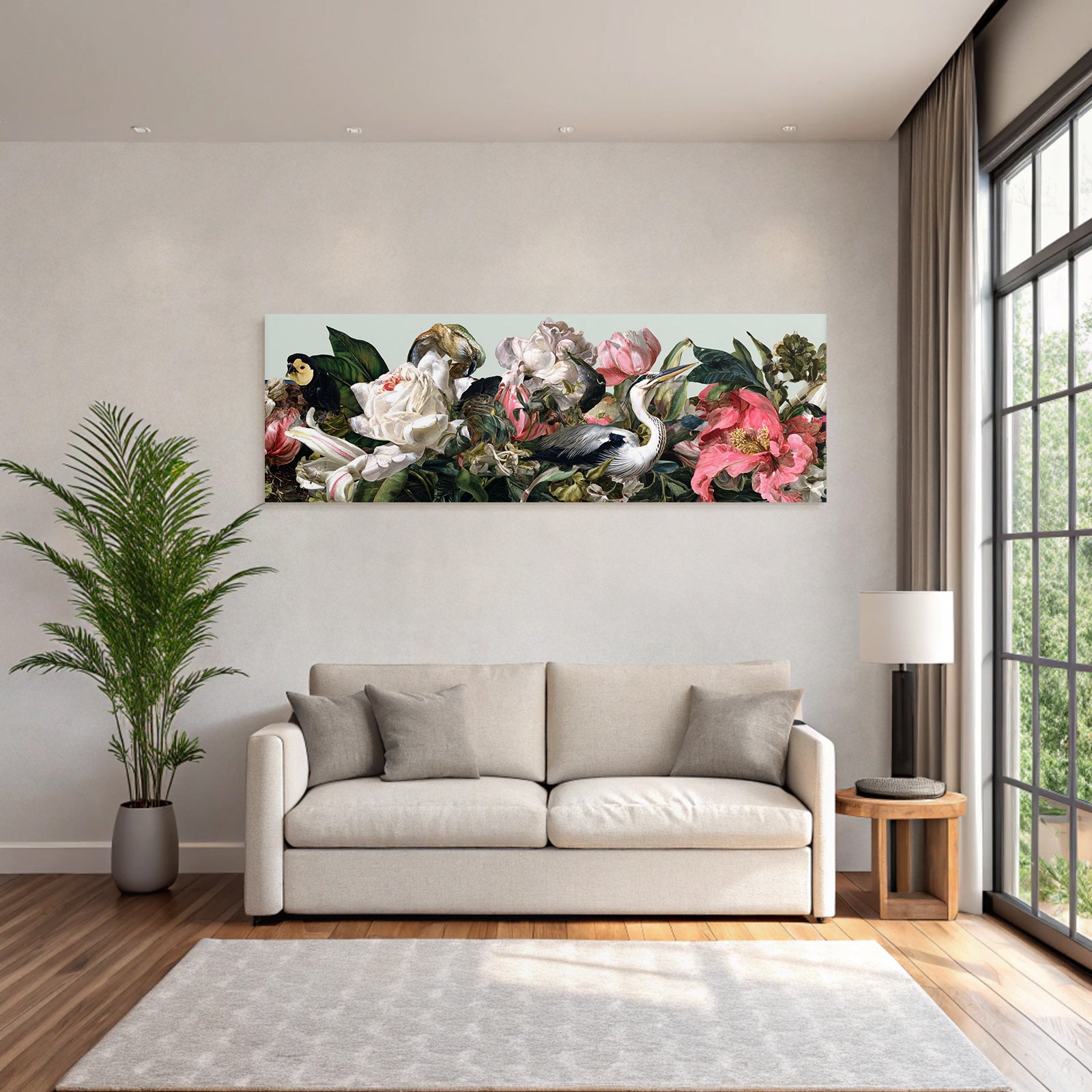 Verschönere Dein Zuhause mit diesem Werk im Stil Collagen. Der Titel „„Blumenvogelkomposition Farbige Peonien Und Voegel““ kommt im hochwertigen FameFrame perfekt zur Geltung.