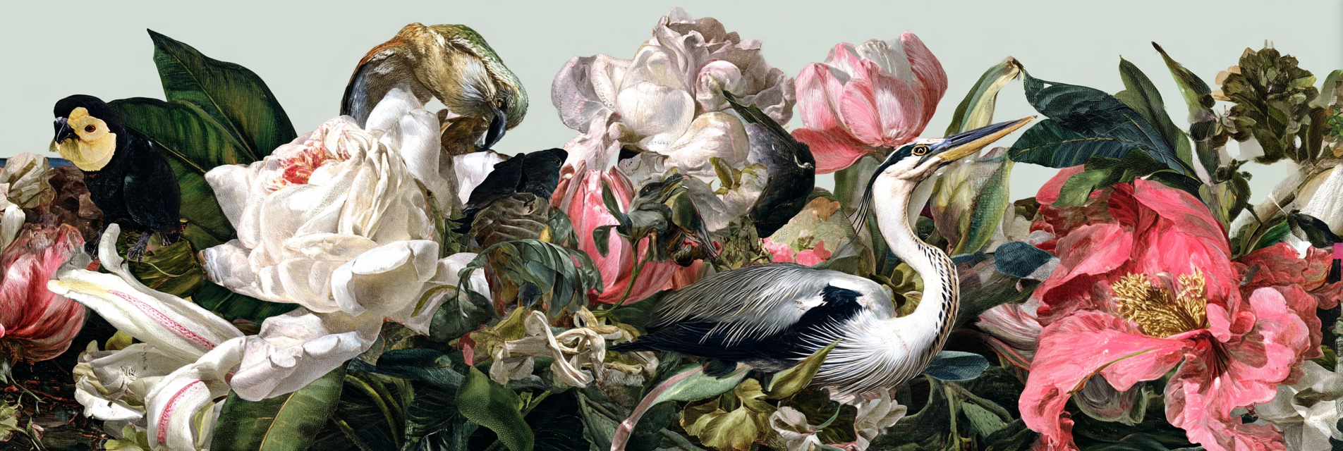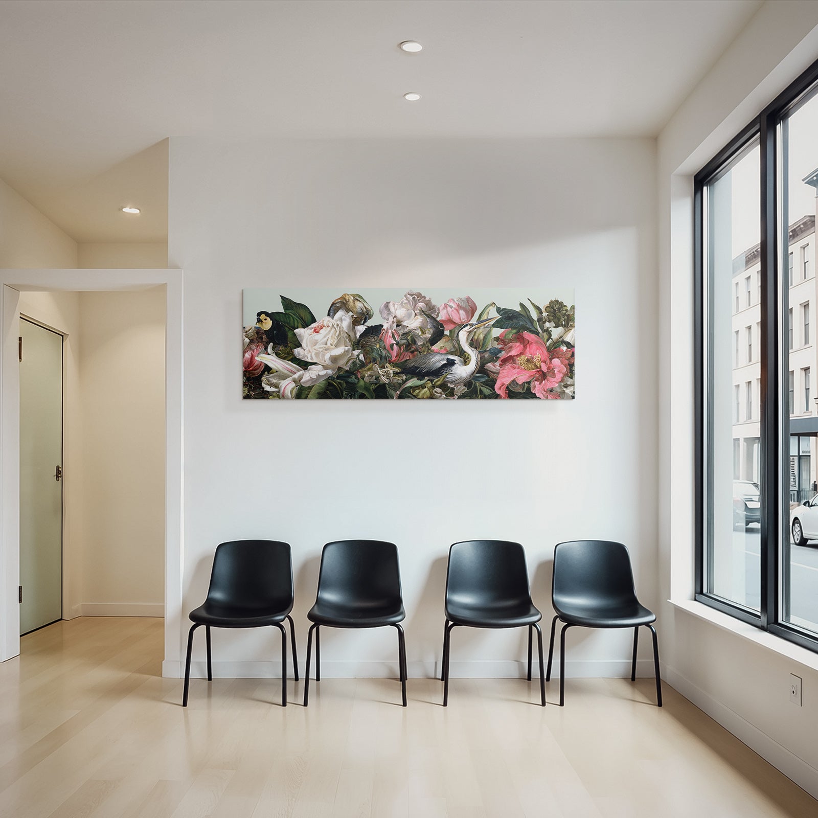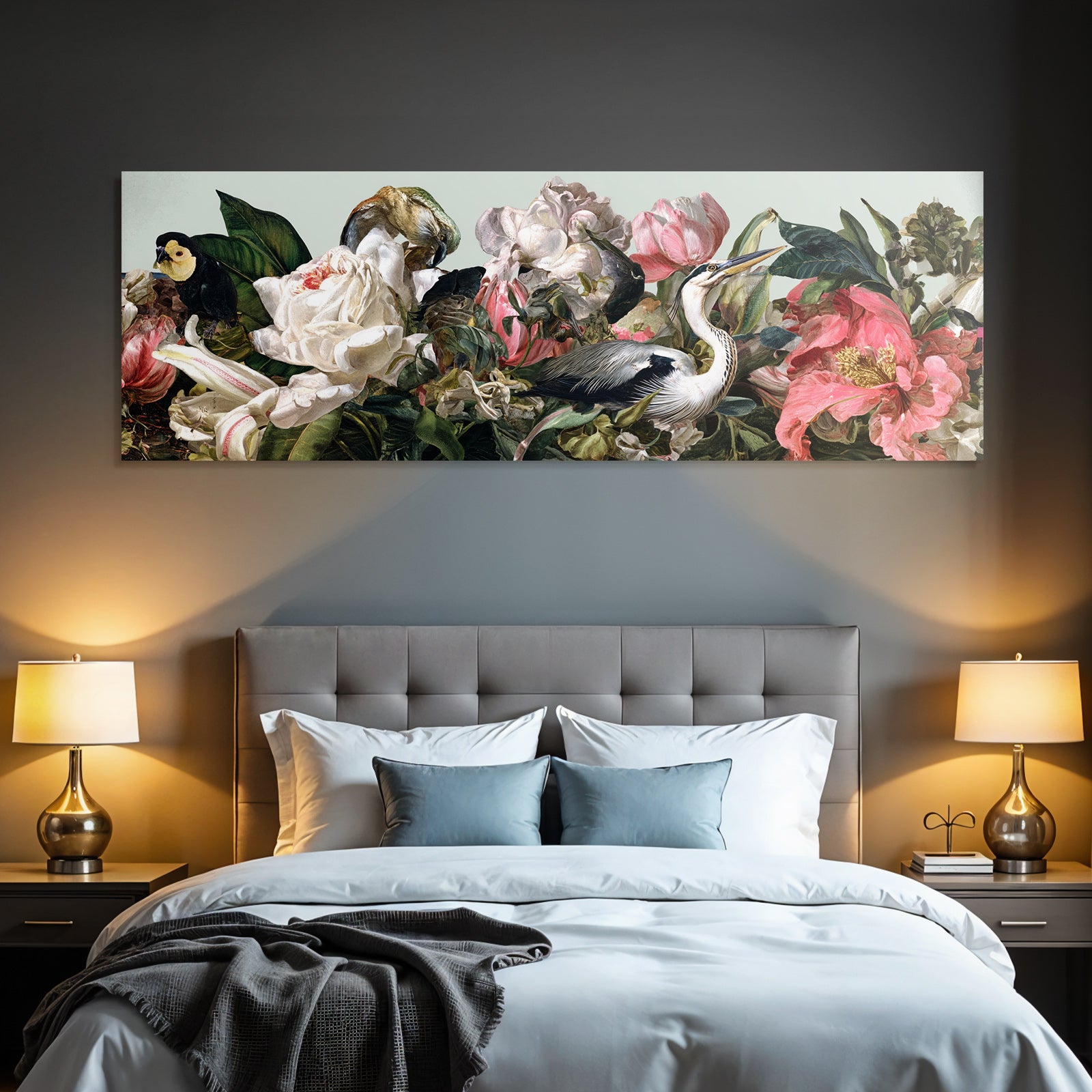Verschönere Dein Zuhause mit diesem Werk im Stil Collagen. Der Titel „„Blumenvogelkomposition Farbige Peonien Und Voegel““ kommt im hochwertigen FameFrame perfekt zur Geltung.