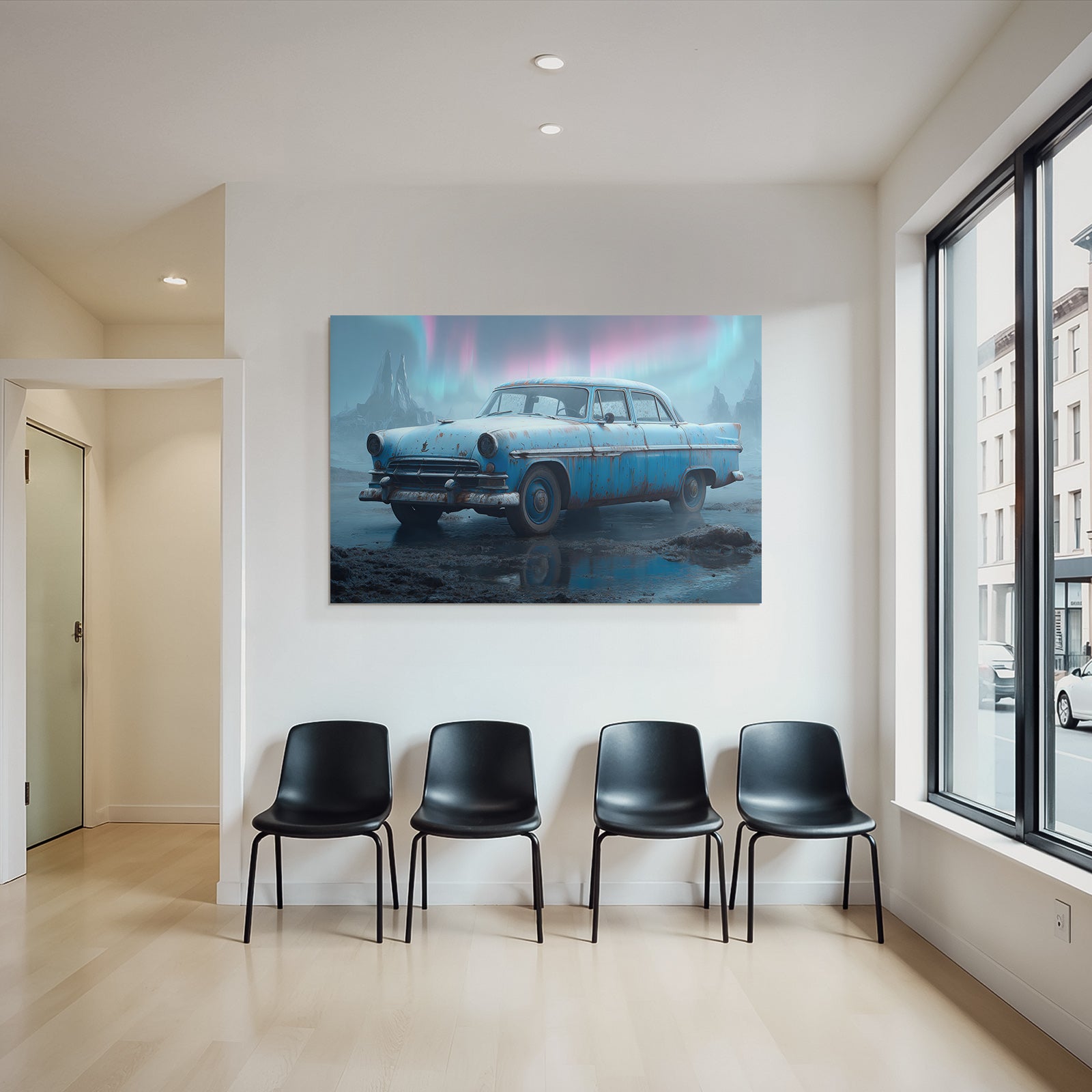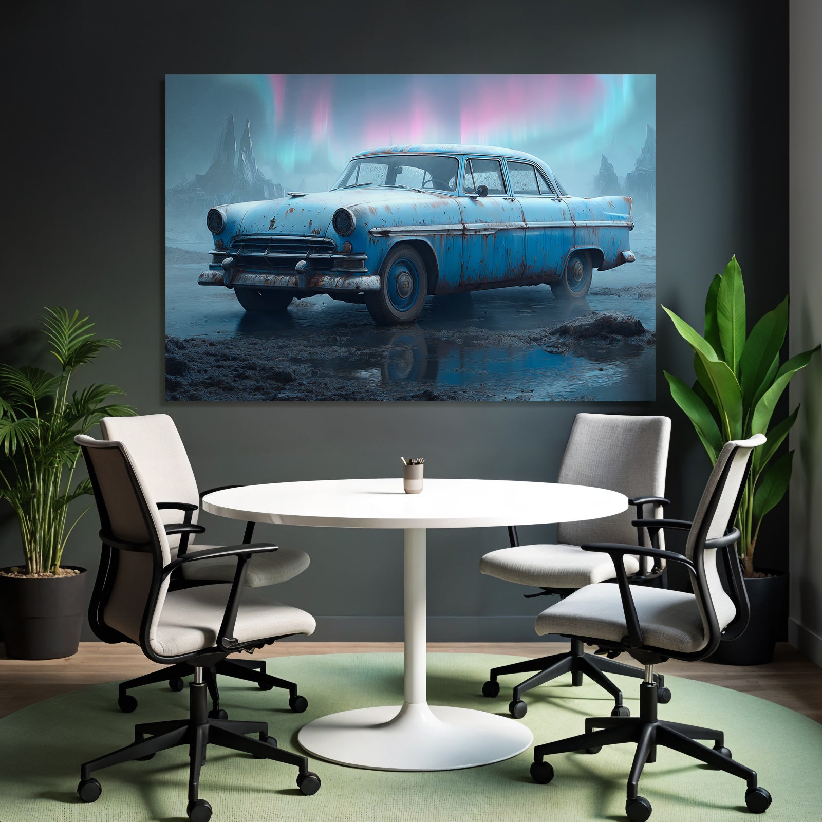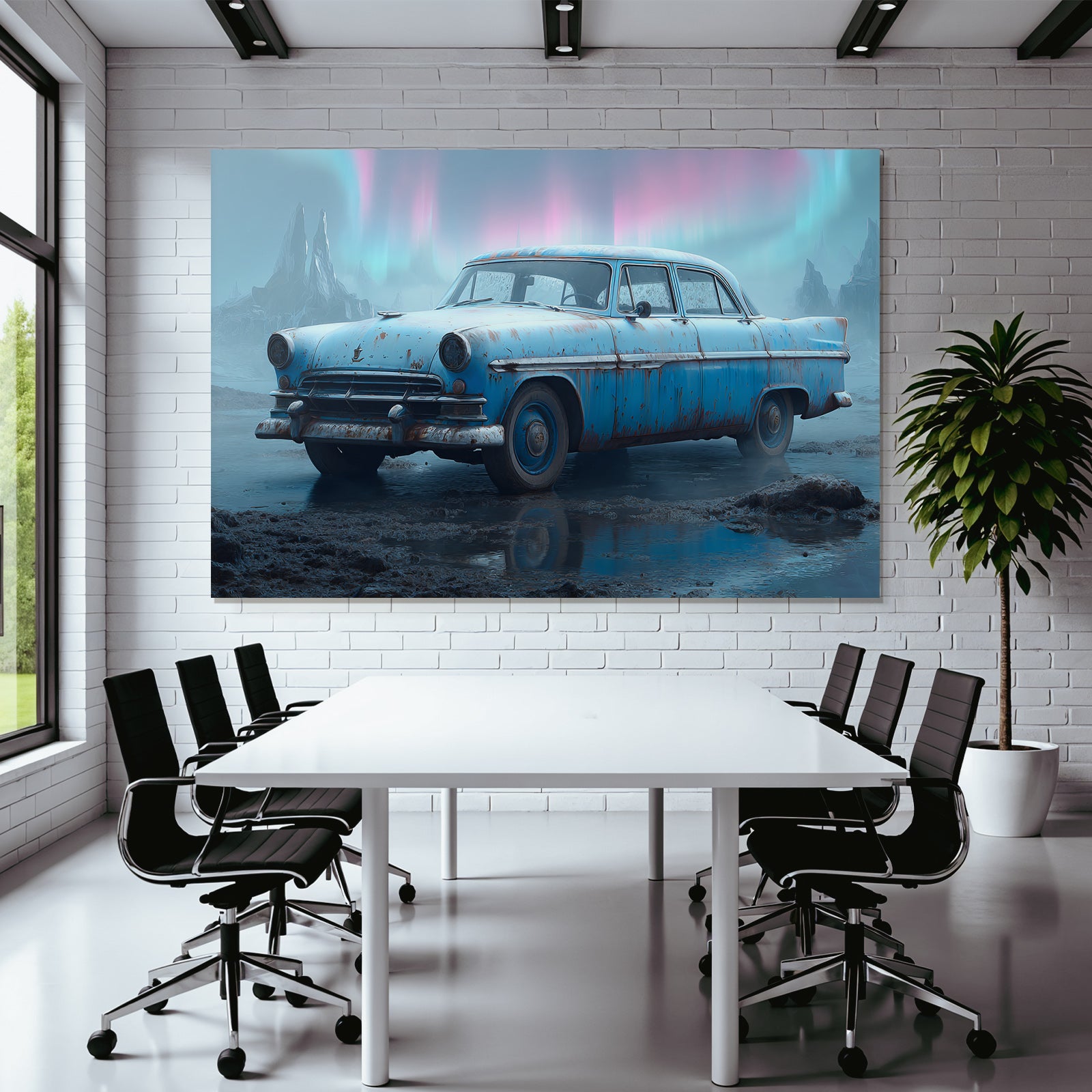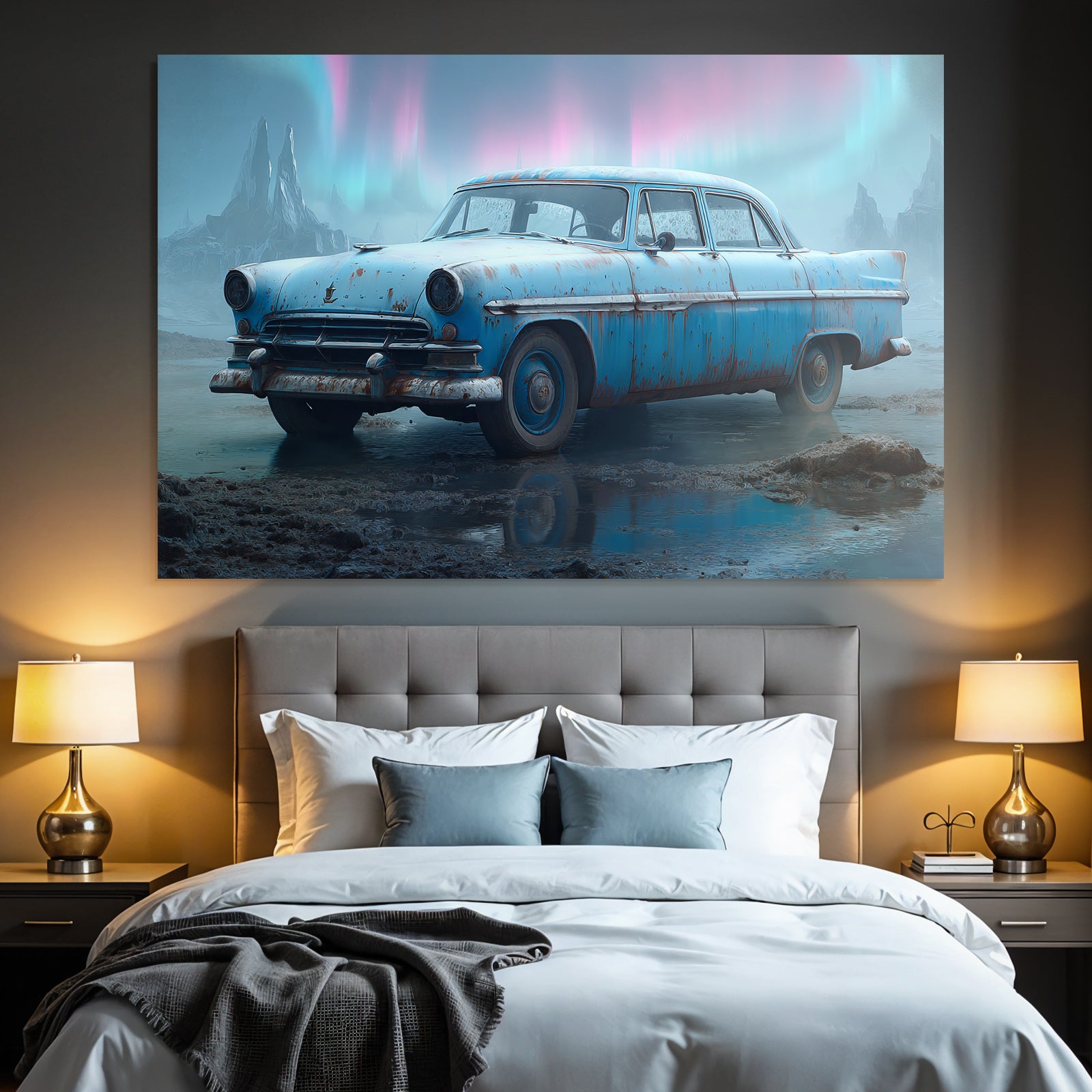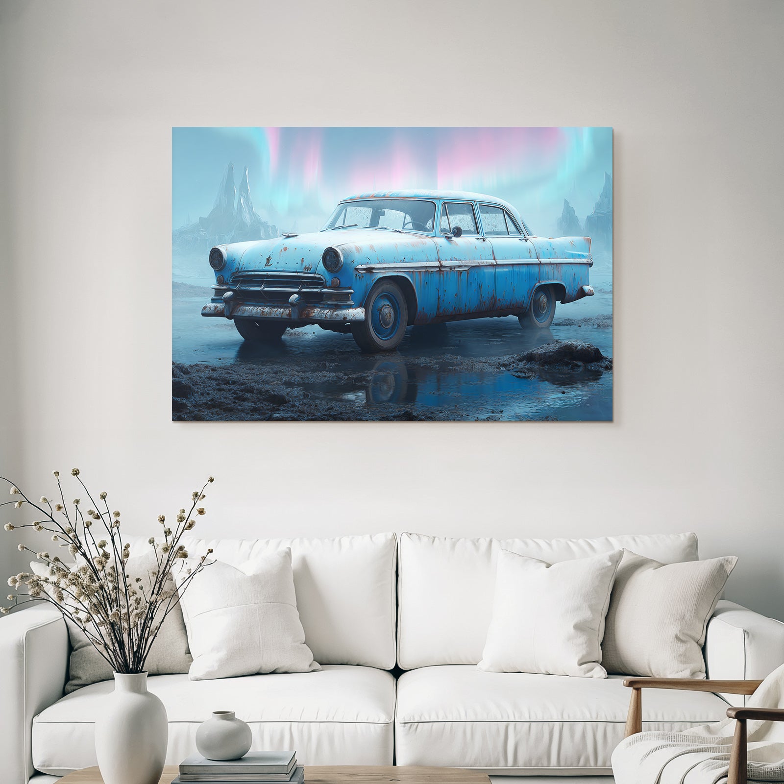 Ein Meisterwerk im Stil Fjorde und Gletscher: „Polarlicht Alter Rustiger Blaür Auto In Surrealer Landschaft Mit Aurora“ fängt die Atmosphäre und die typischen Elemente dieses Stils ein und wird im FameFrame™ zum zeitlosen Hingucker.
