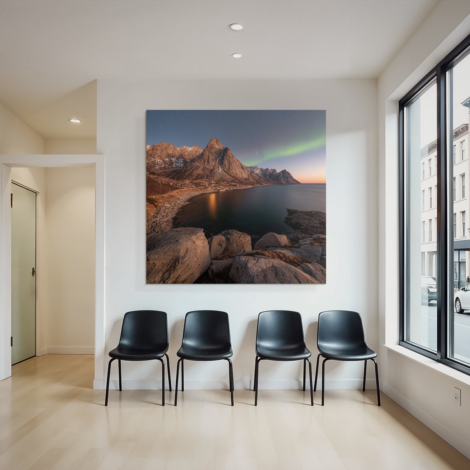 Die Kombination aus dem Motiv „Polarlicht Coastal Mountains Northern Lights Tranquil Landscape“ und dem Stil Fjorde und Gletscher schafft eine Brücke zwischen Klassik und Moderne. Der FameFrame™ vollendet dieses Zusammenspiel perfekt.