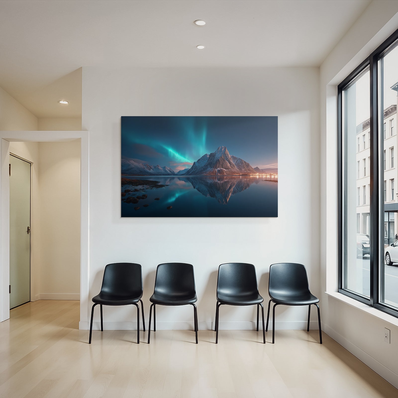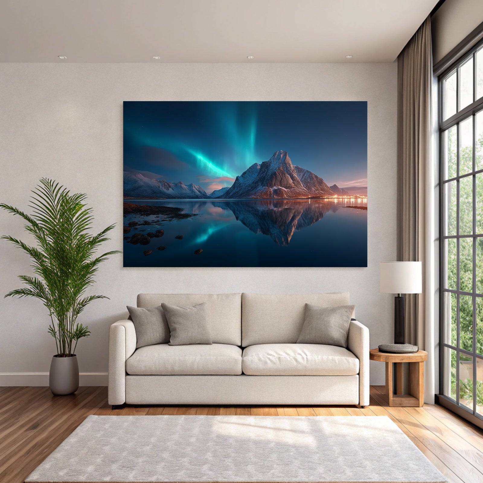 Mach mehr aus Deinem Wohnbereich oder Besprechungszimmer – „Polarlicht Dramatysches Natur Landschaft Mit Nordlichtern Reflektion In Wasser“ im Stil Fjorde und Gletscher überzeugt als eleganter Textildruck im FameFrame™.
