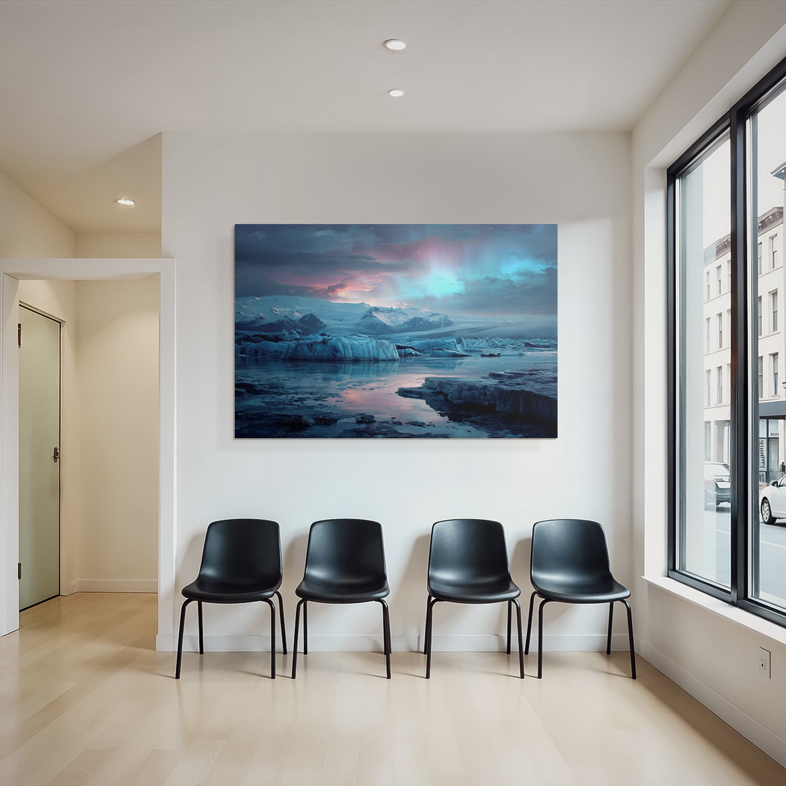 „Polarlicht Glanzendes Landschaftsbild Mit Gletschern Und Aurea Borealis“ verbindet das Beste aus Fjorde und Gletscher mit modernem Textildruck – edel präsentiert im hochwertigen FameFrame™.