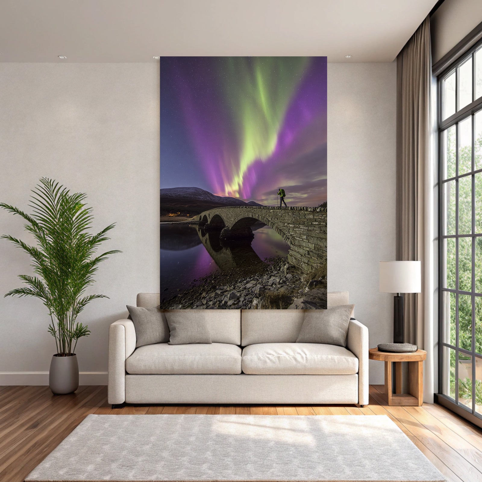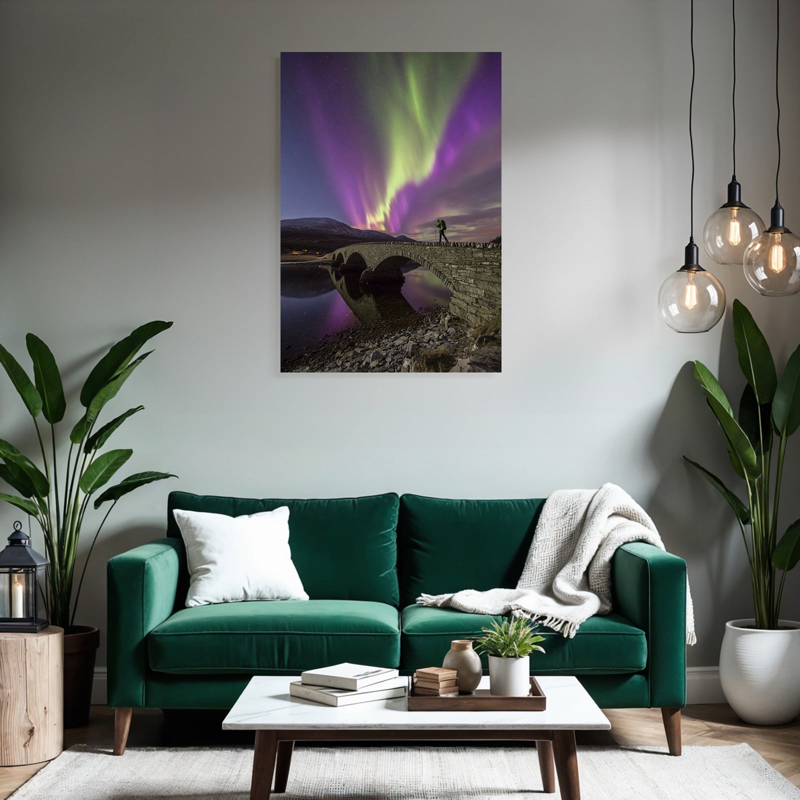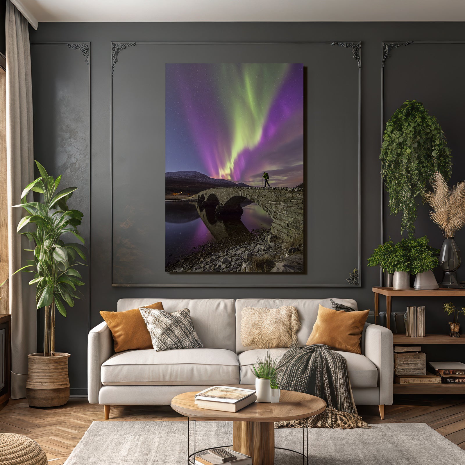 Mit Fjorde und Gletscher-Elementen und klarer Wirkung verleiht „Polarlicht Nordlichter Brücke Wasser Mountains Nacht Sternenhimmel“ Deinem Raum Persönlichkeit – eingerahmt im exklusiven FameFrame™.