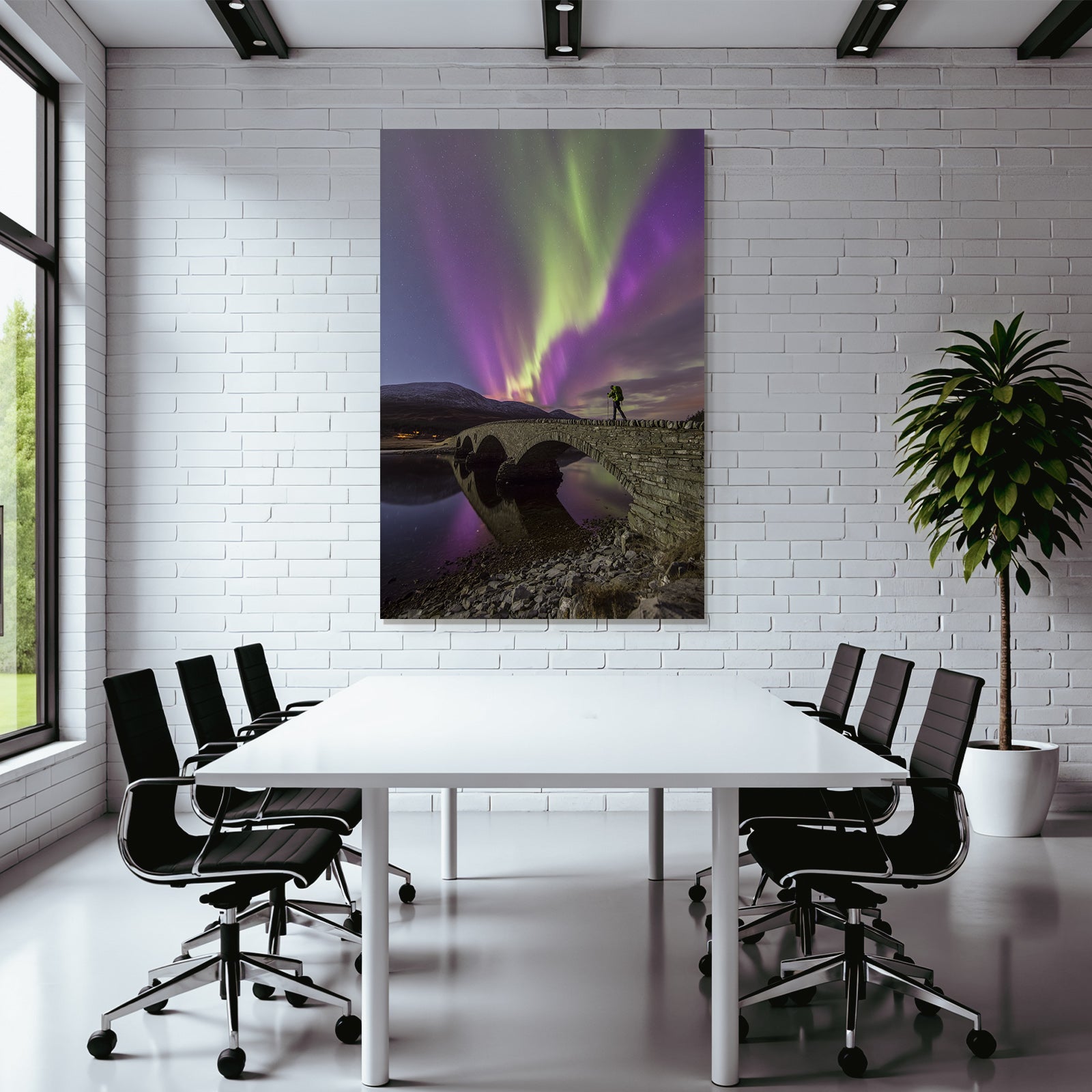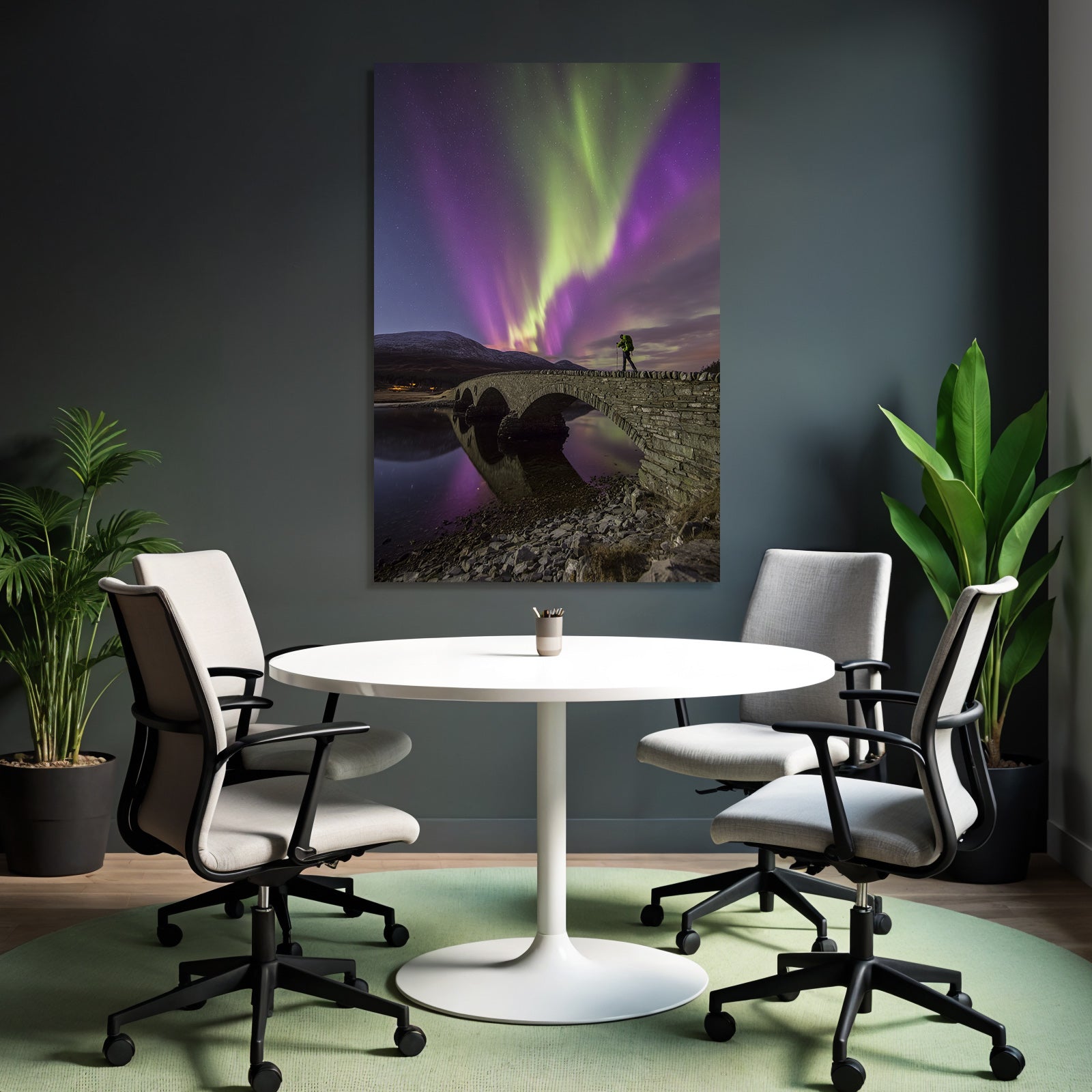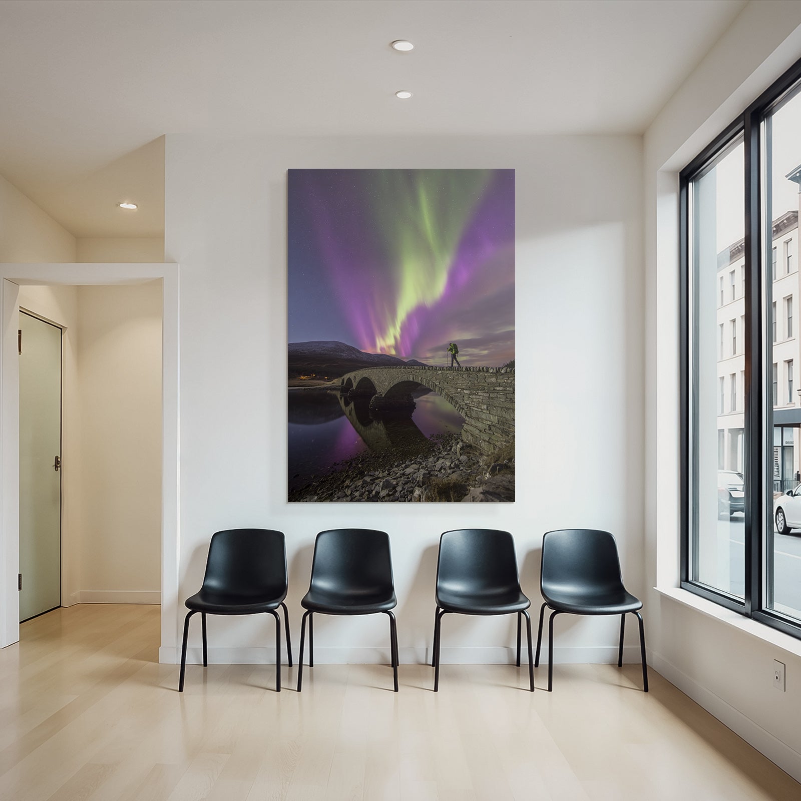 Mit Fjorde und Gletscher-Elementen und klarer Wirkung verleiht „Polarlicht Nordlichter Brücke Wasser Mountains Nacht Sternenhimmel“ Deinem Raum Persönlichkeit – eingerahmt im exklusiven FameFrame™.