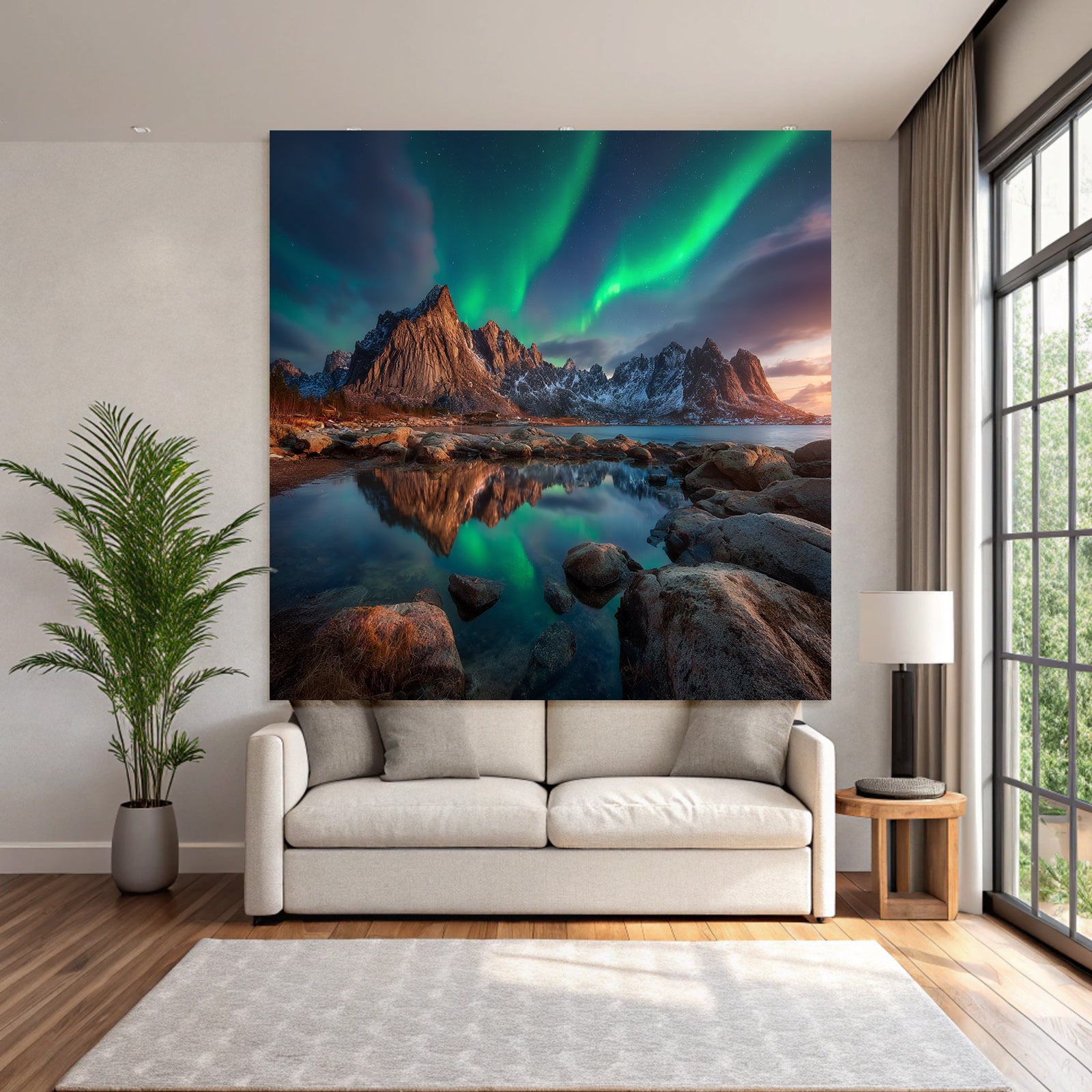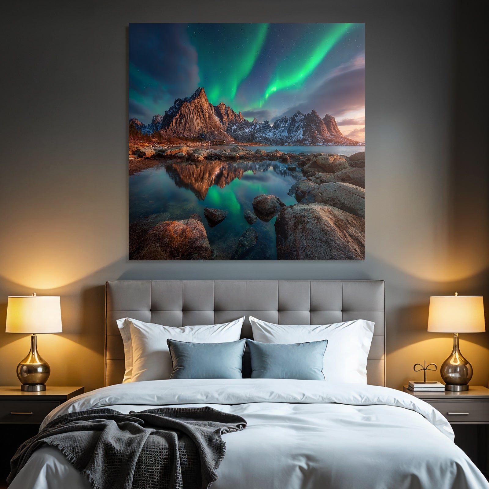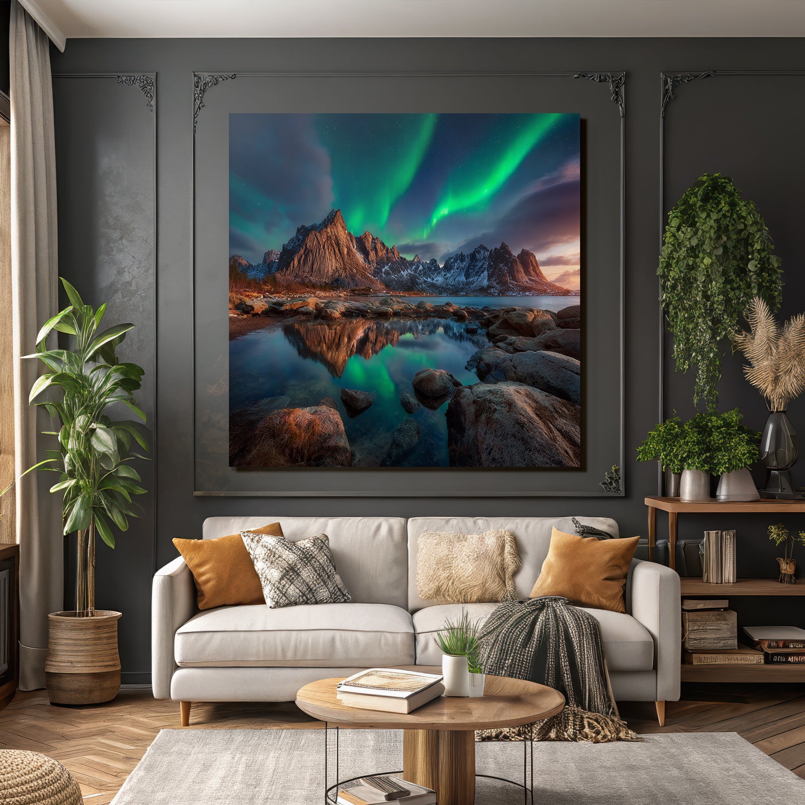 Dieses Kunstwerk zelebriert den Stil Fjorde und Gletscher. Die klaren Linien (oder organischen Formen) von „Polarlicht Nordlichter Lichten Mountain Peaks Reflection Ruhiges Wasser Natur Schönheit“ werden durch den minimalistischen FameFrame™ elegant betont.