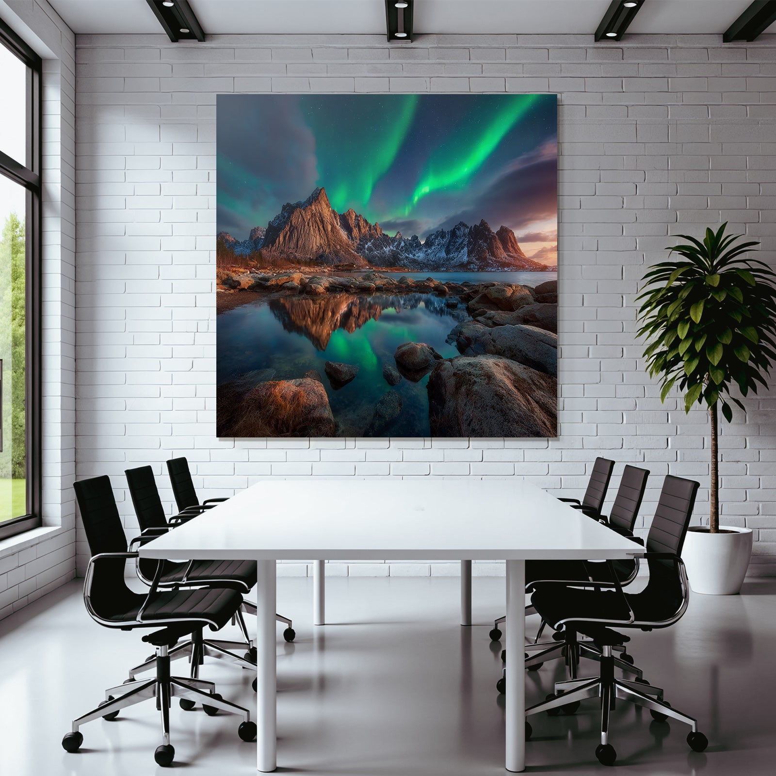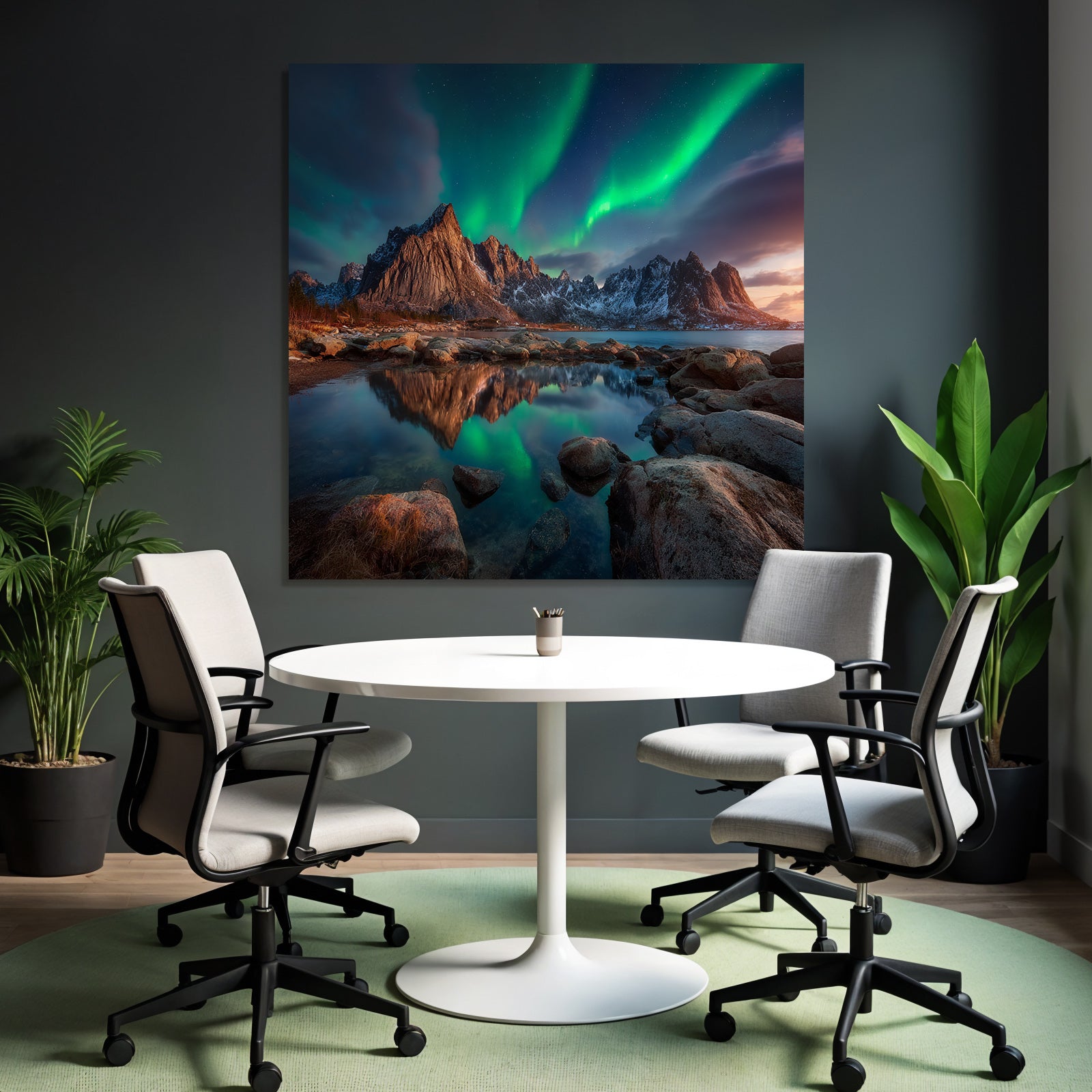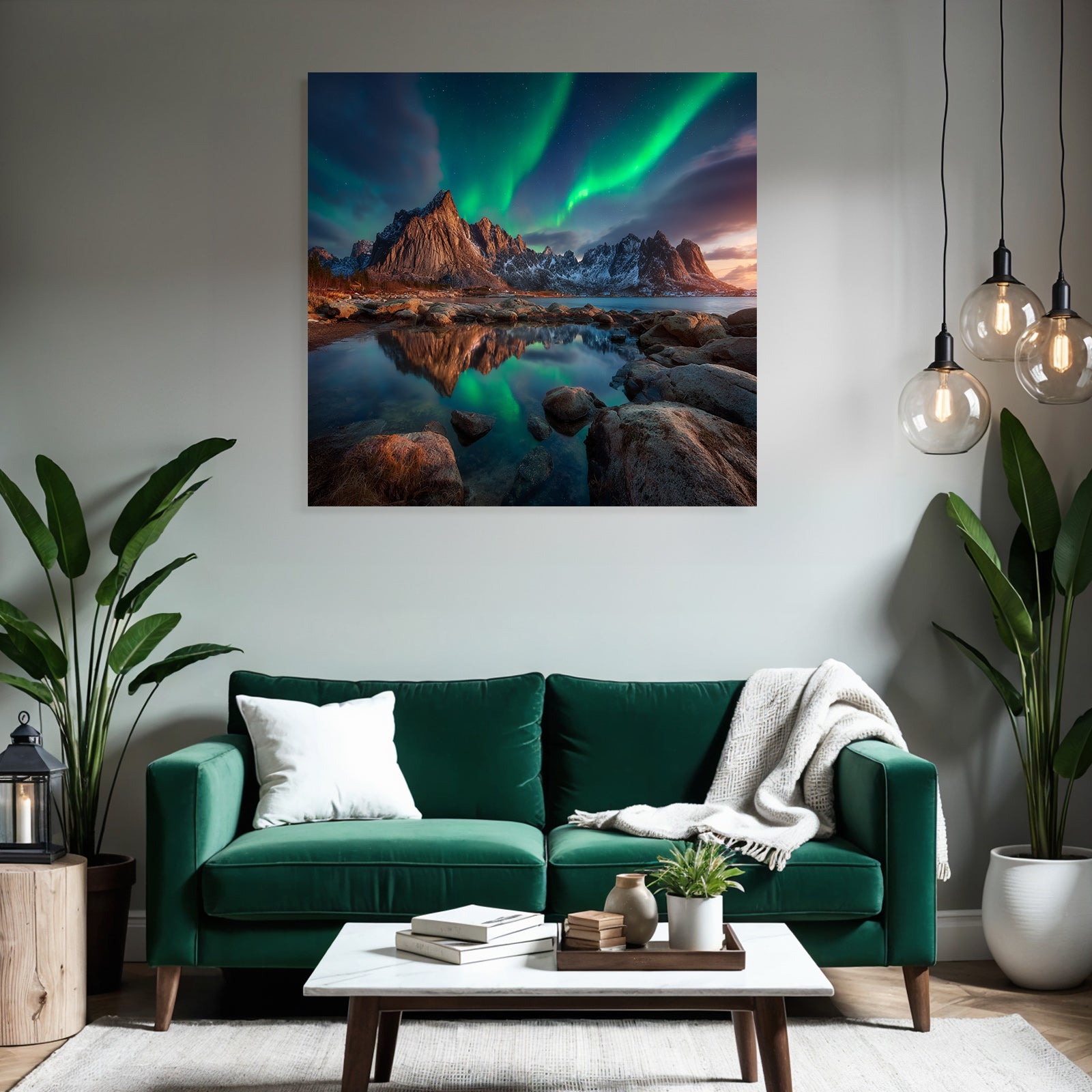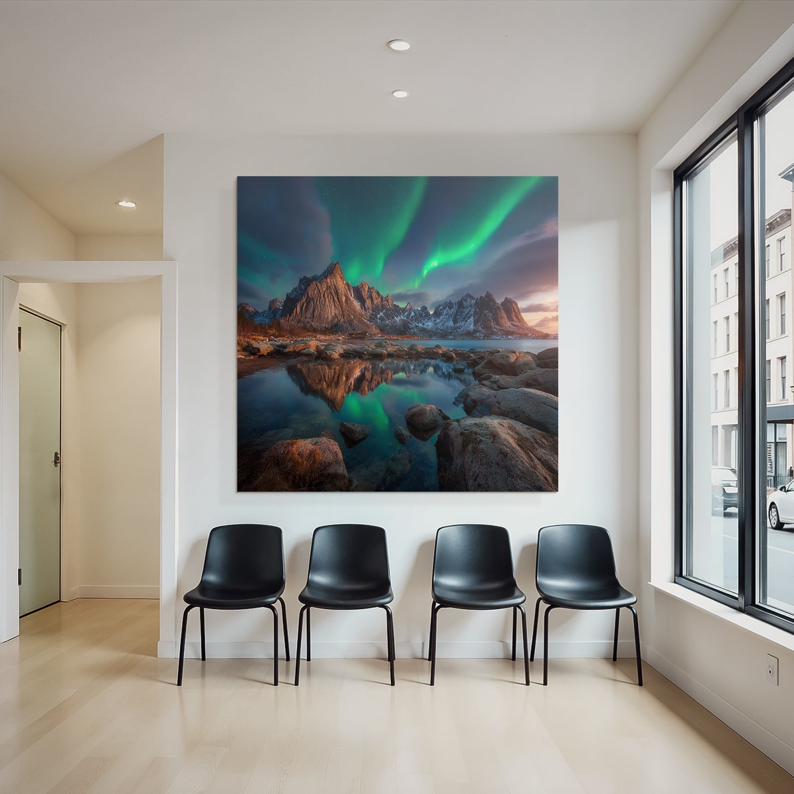 Dieses Kunstwerk zelebriert den Stil Fjorde und Gletscher. Die klaren Linien (oder organischen Formen) von „Polarlicht Nordlichter Lichten Mountain Peaks Reflection Ruhiges Wasser Natur Schönheit“ werden durch den minimalistischen FameFrame™ elegant betont.