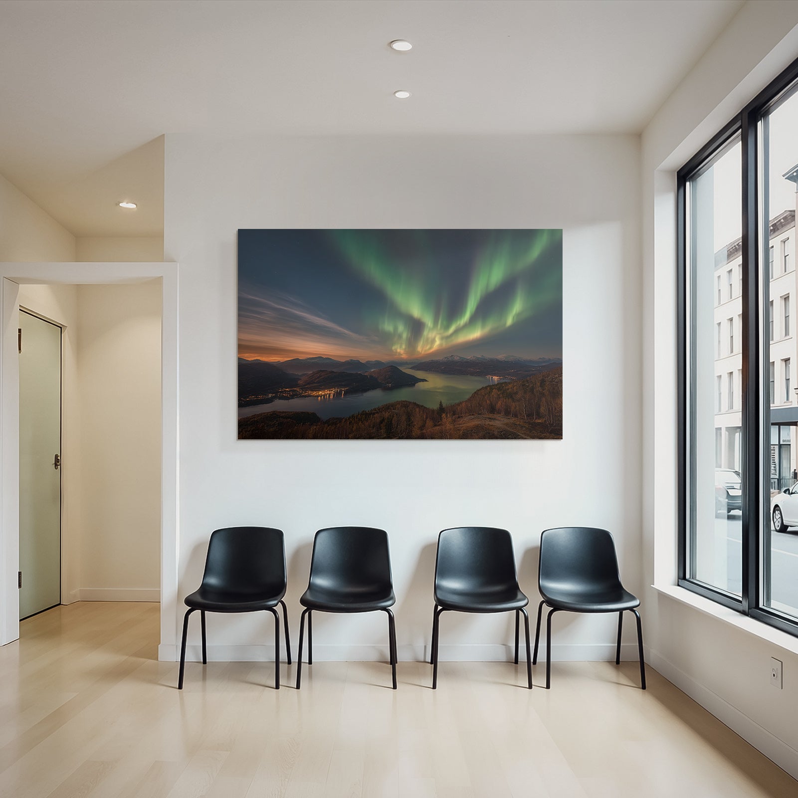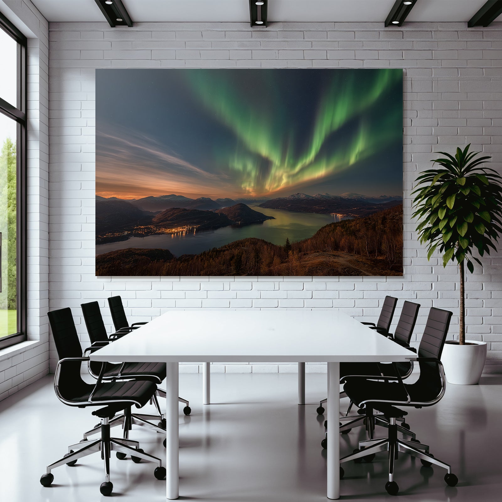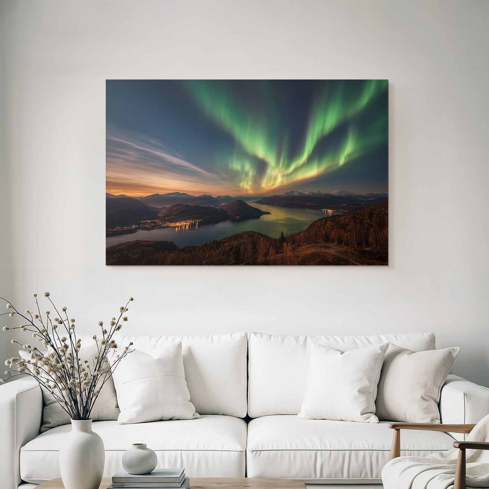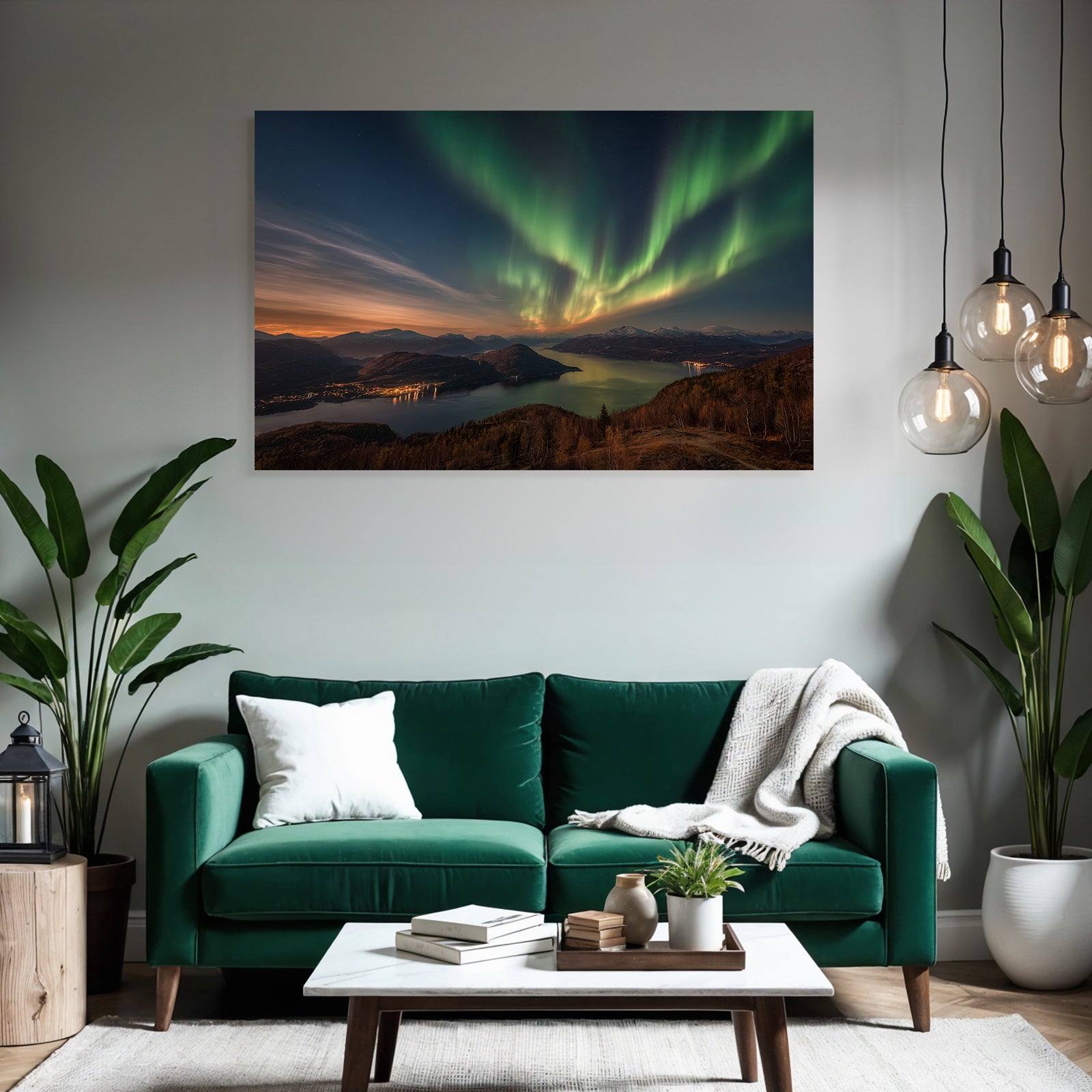 Wenn Sie den Fjorde und Gletscher-Look schätzen, werden Sie „Polarlicht Nordlichter Über Berge Und Fjord Wunderschöne Naturerscheinung“ lieben. Im exklusiven FameFrame™ wird dieses Motiv zum zentralen Element Ihrer Raumgestaltung.