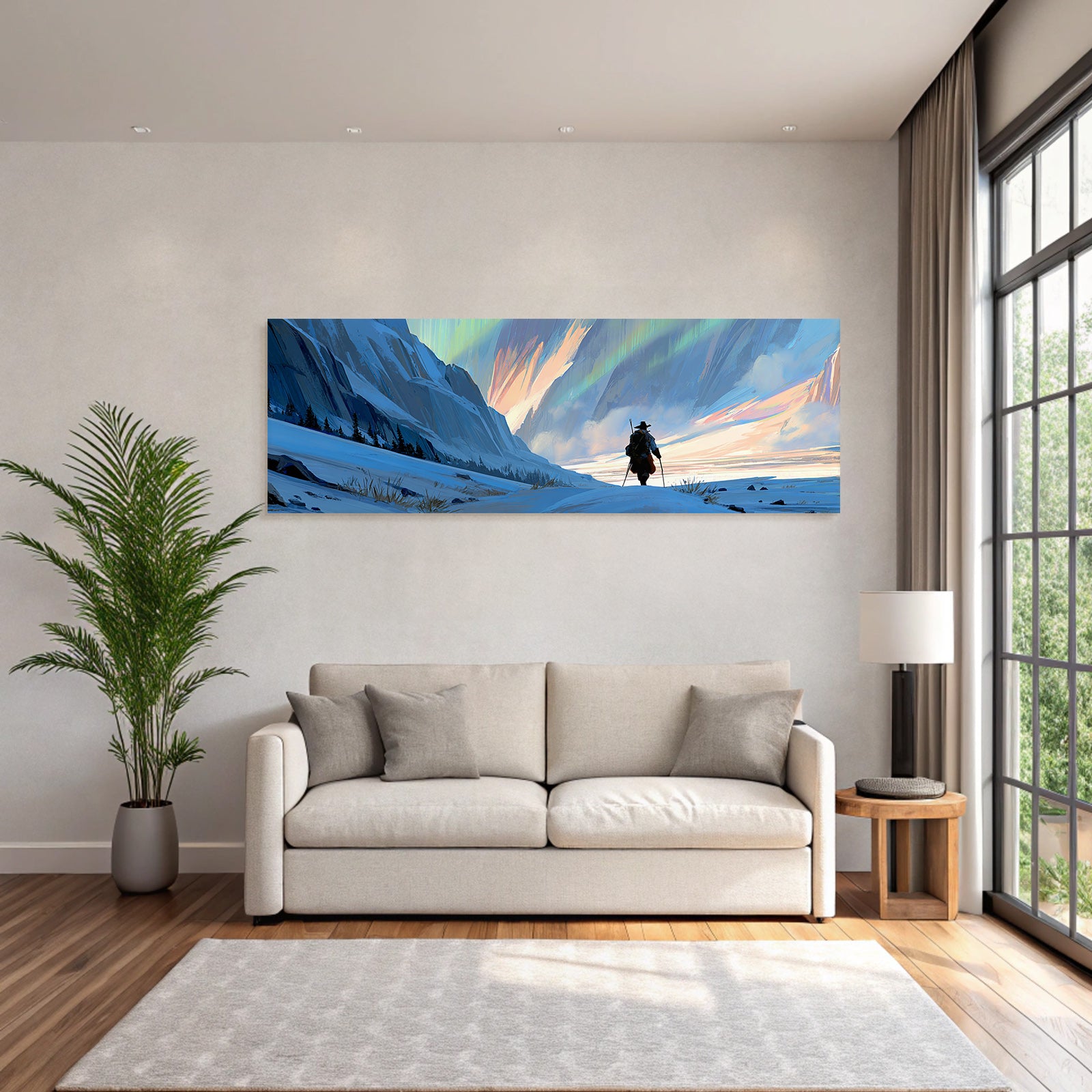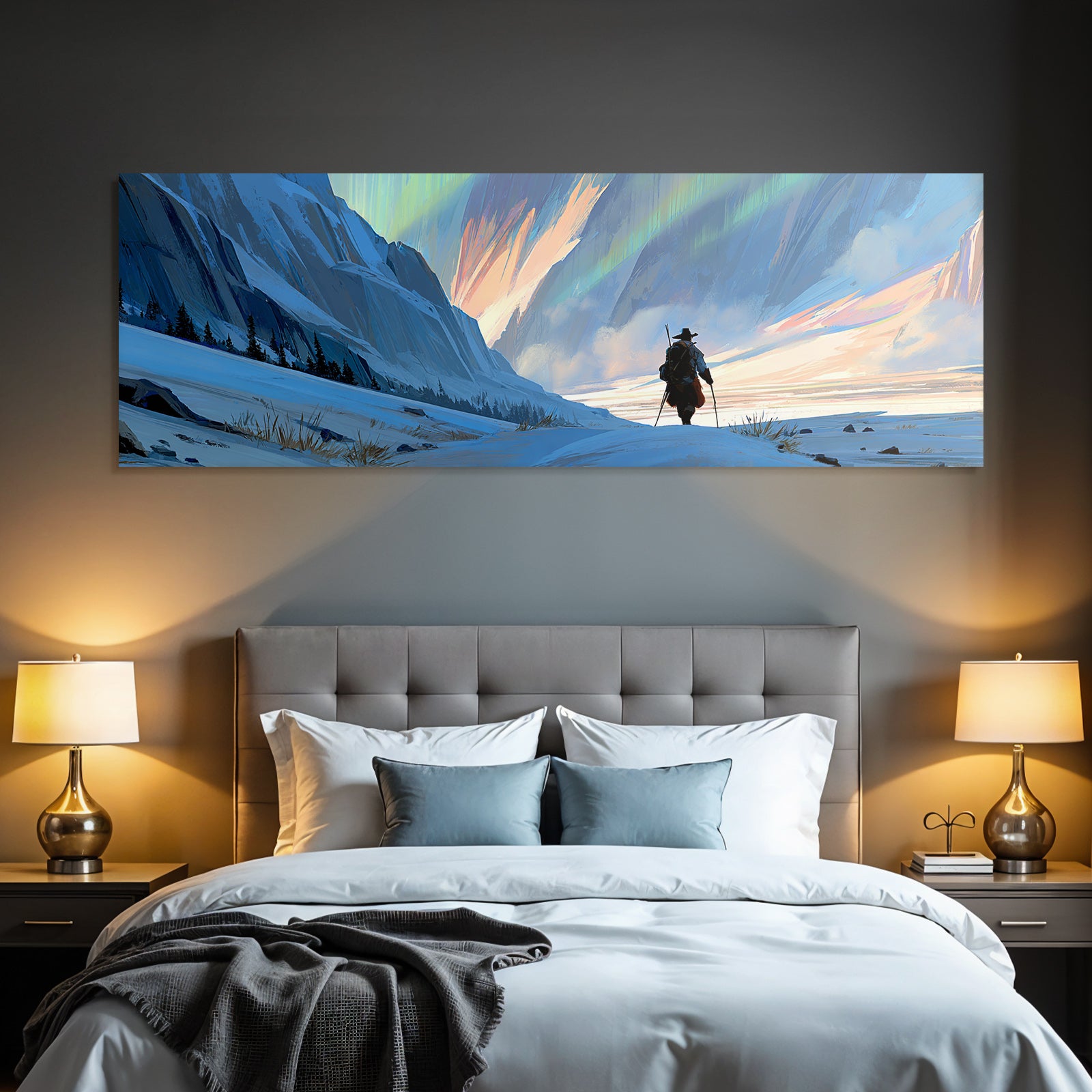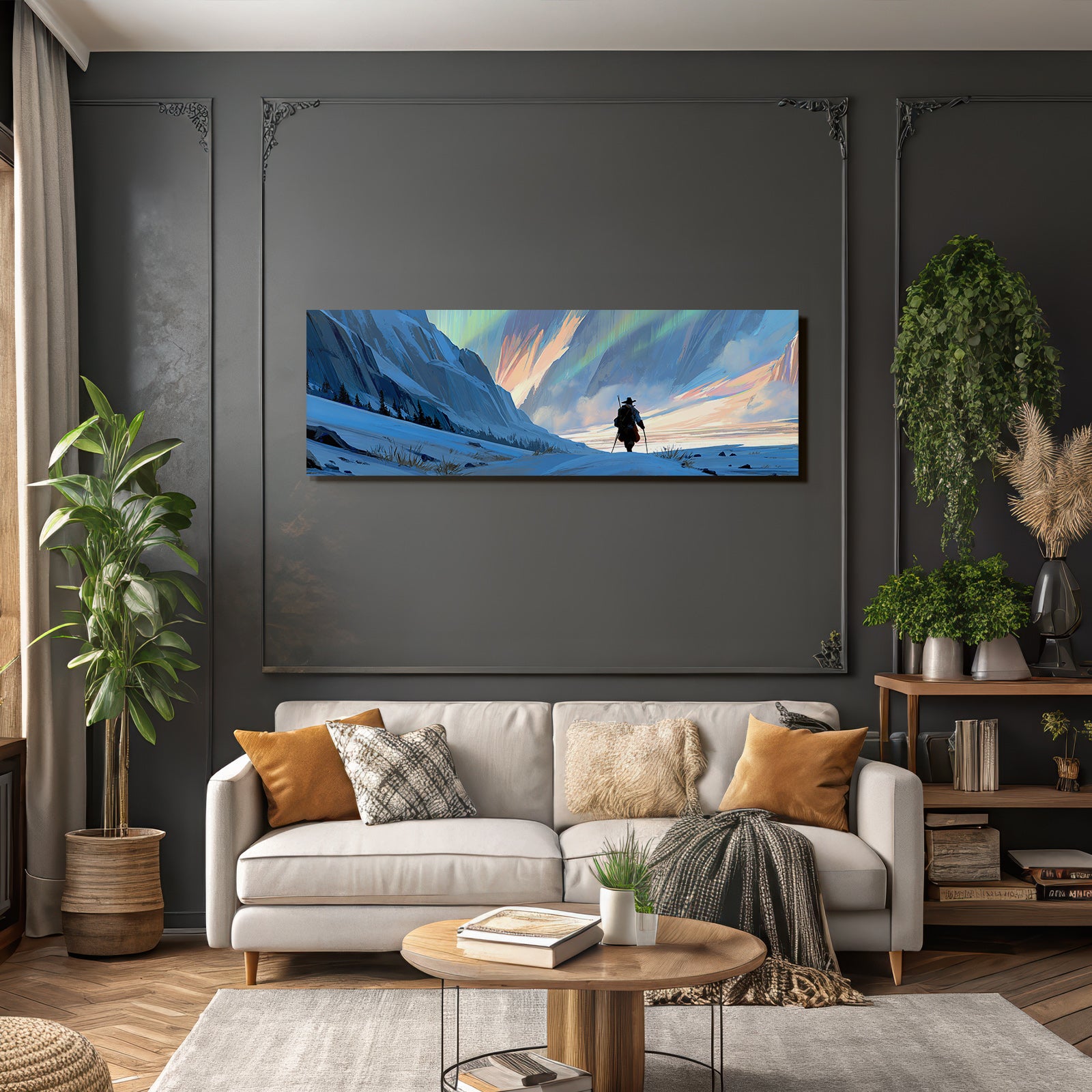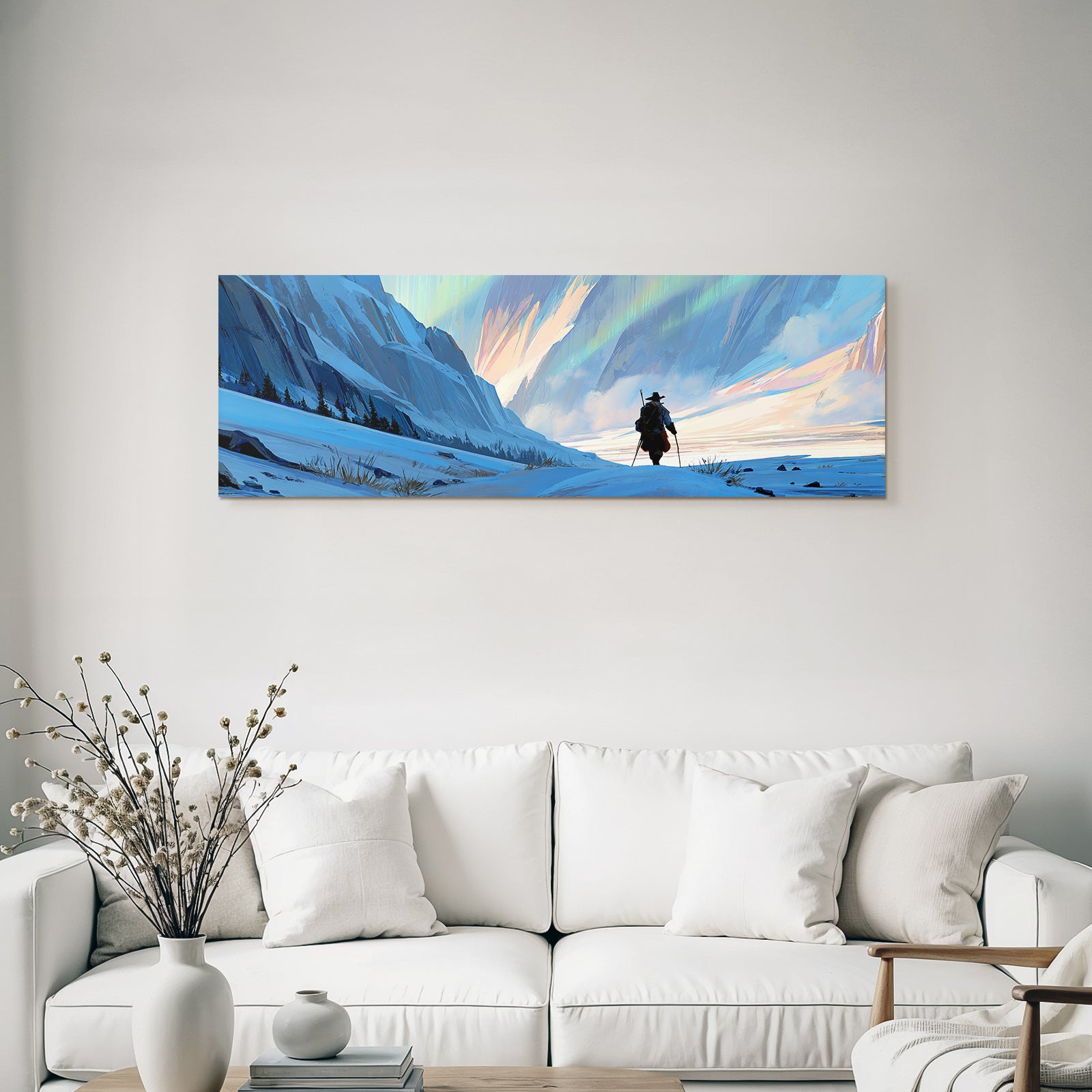 Für Liebhaber des Fjorde und Gletscher-Looks: Das Kunstwerk „Polarlicht Schneebedeckte Berglandschaft Abenteürlicher Reisender Dämmerungsvoll Aufblicken“ bringt die charakteristischen Merkmale dieses Stils brillant auf Stoff – perfektioniert durch den FameFrame™.