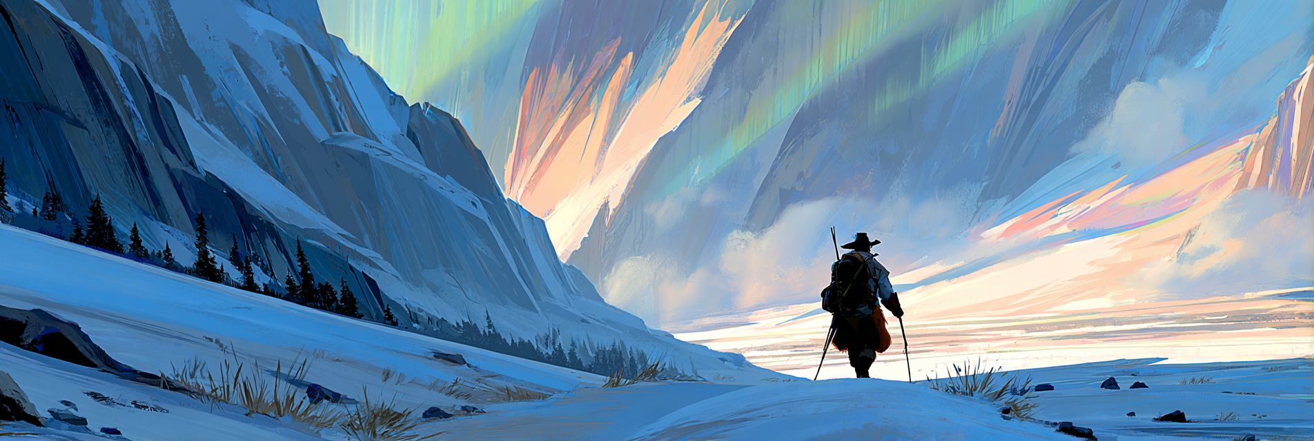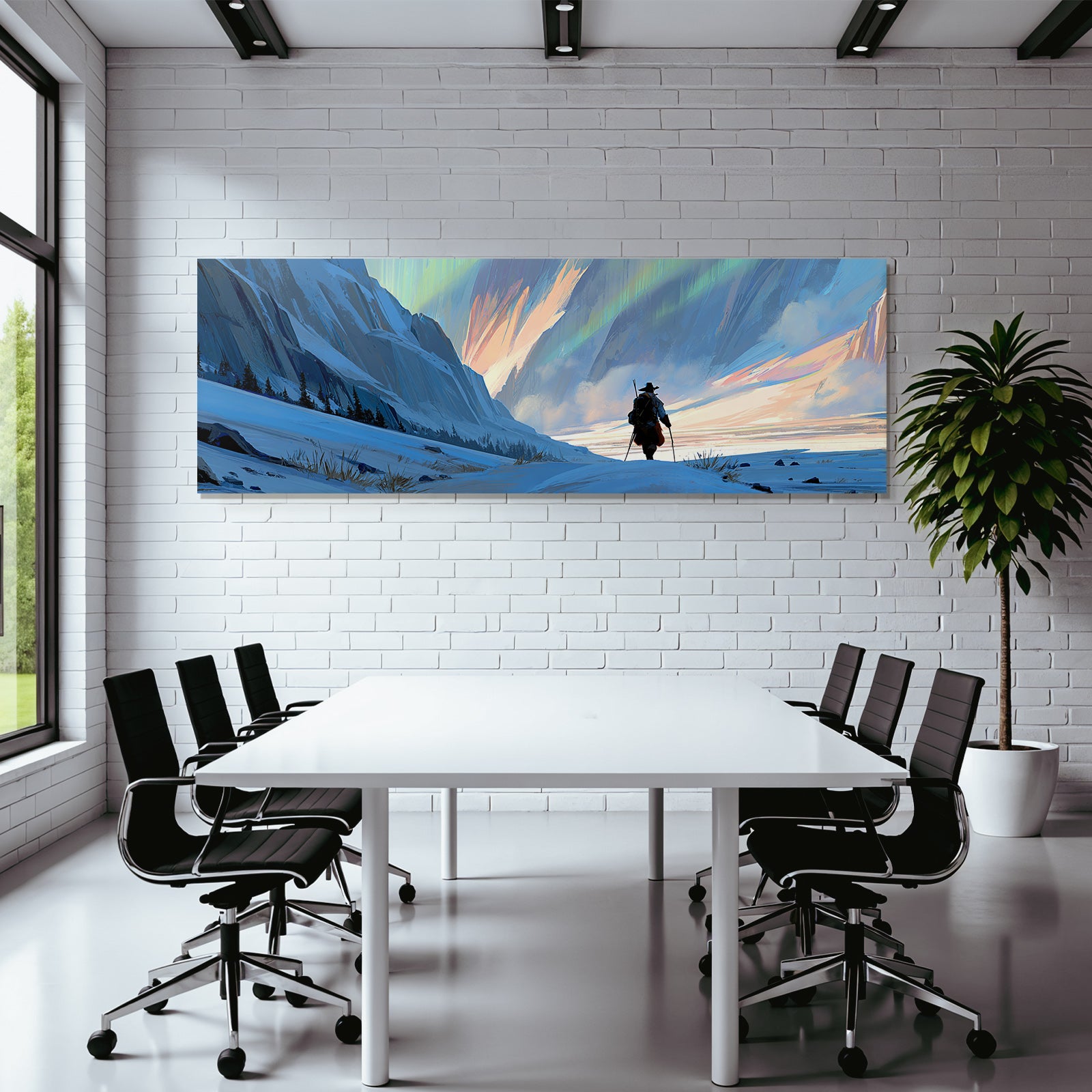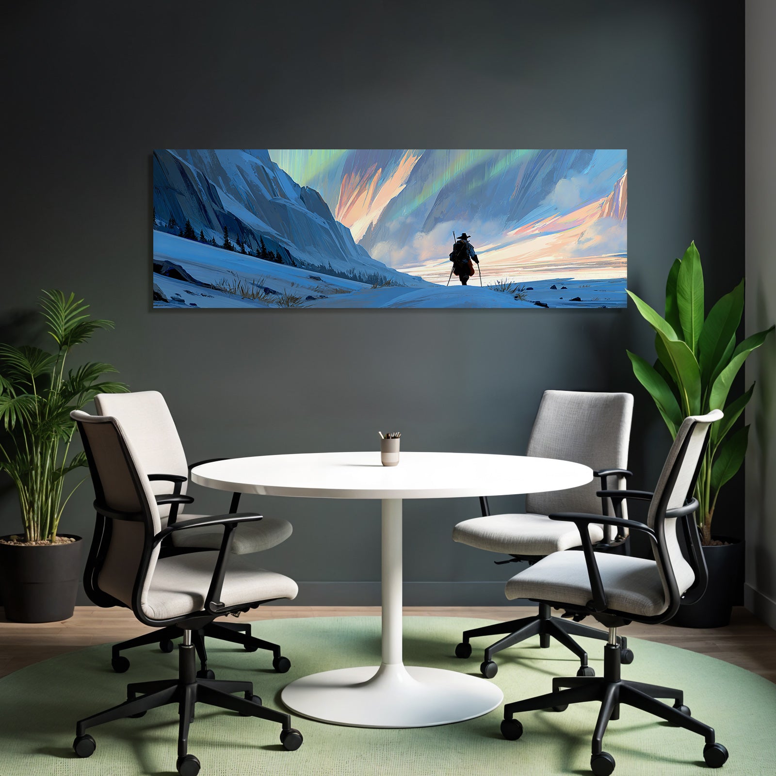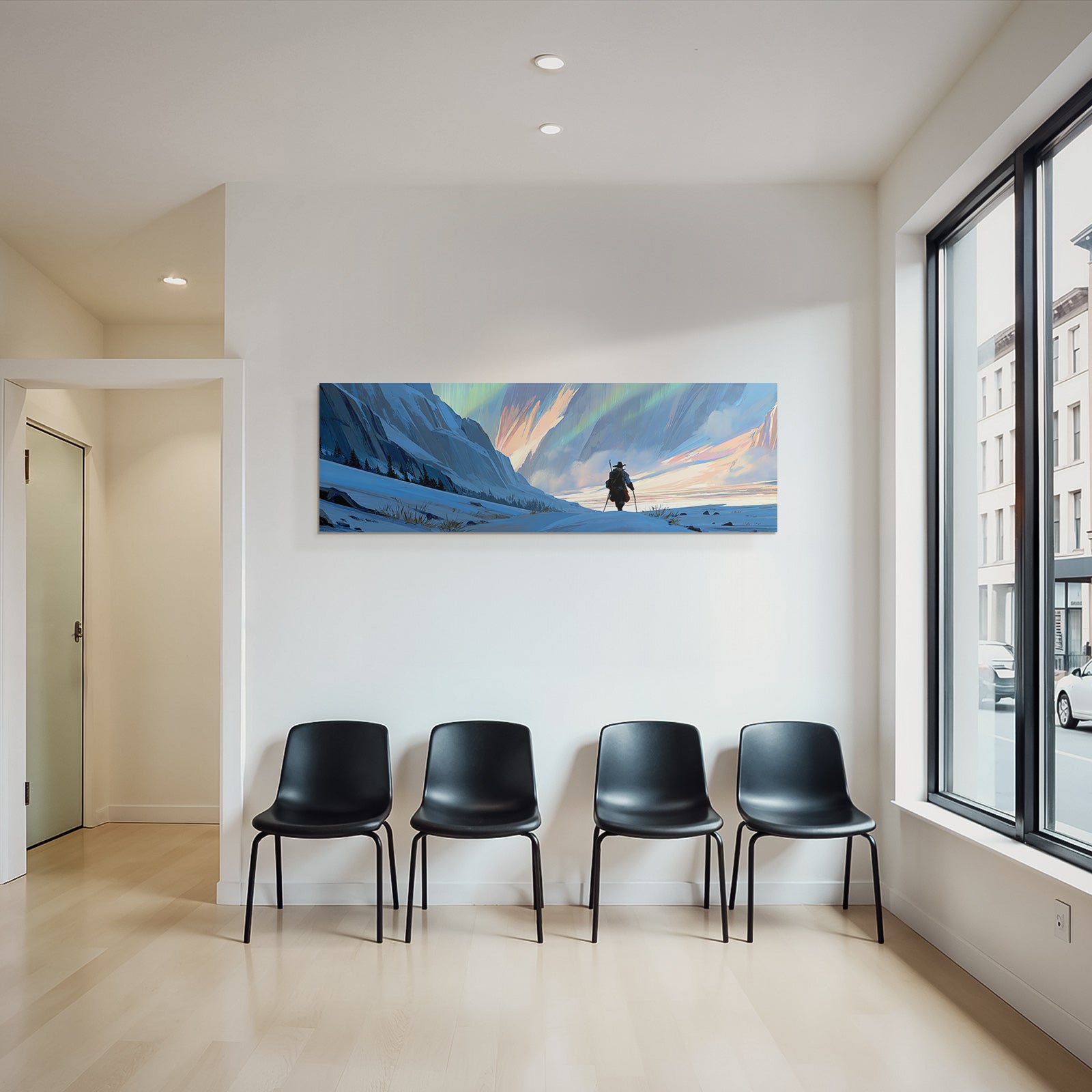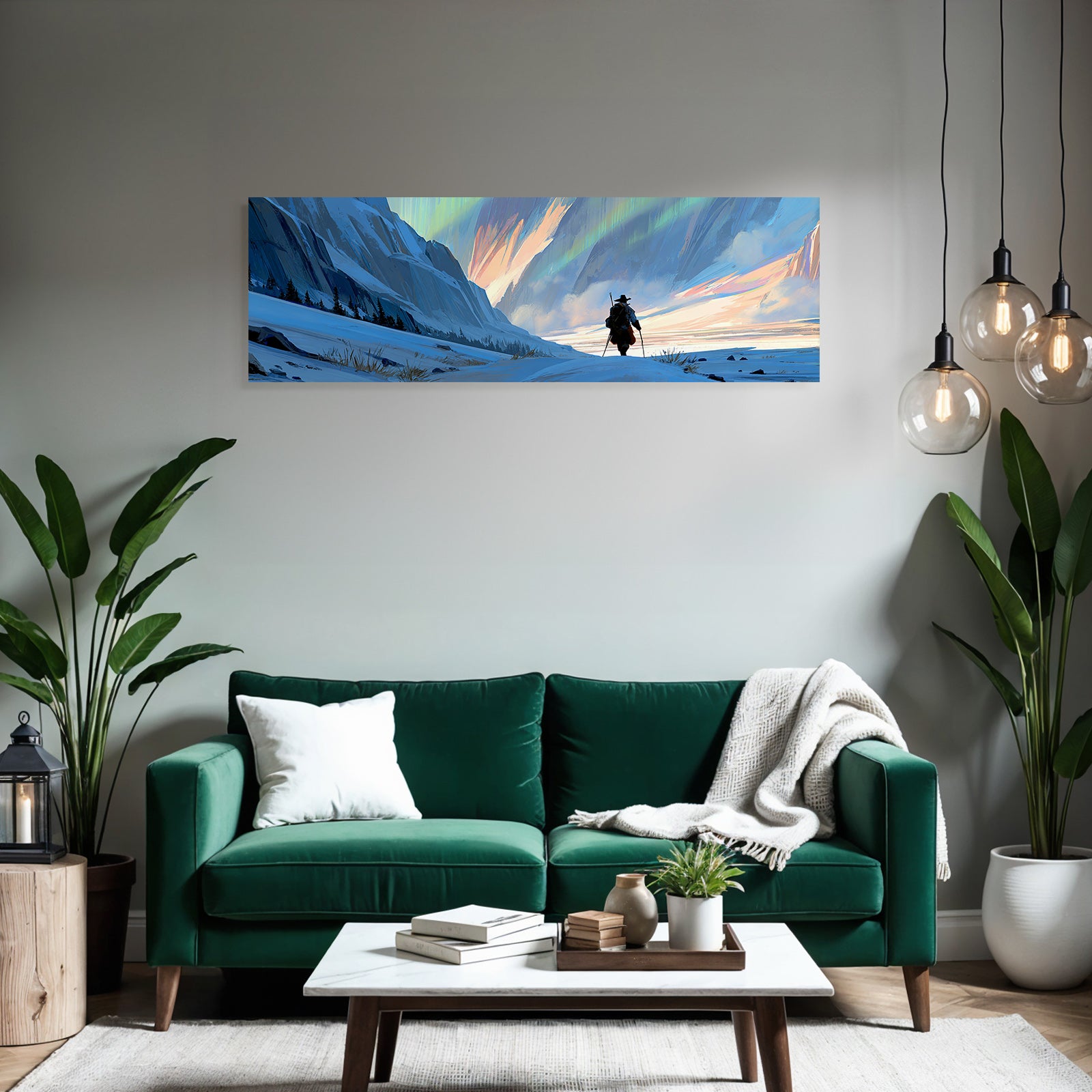 Für Liebhaber des Fjorde und Gletscher-Looks: Das Kunstwerk „Polarlicht Schneebedeckte Berglandschaft Abenteürlicher Reisender Dämmerungsvoll Aufblicken“ bringt die charakteristischen Merkmale dieses Stils brillant auf Stoff – perfektioniert durch den FameFrame™.