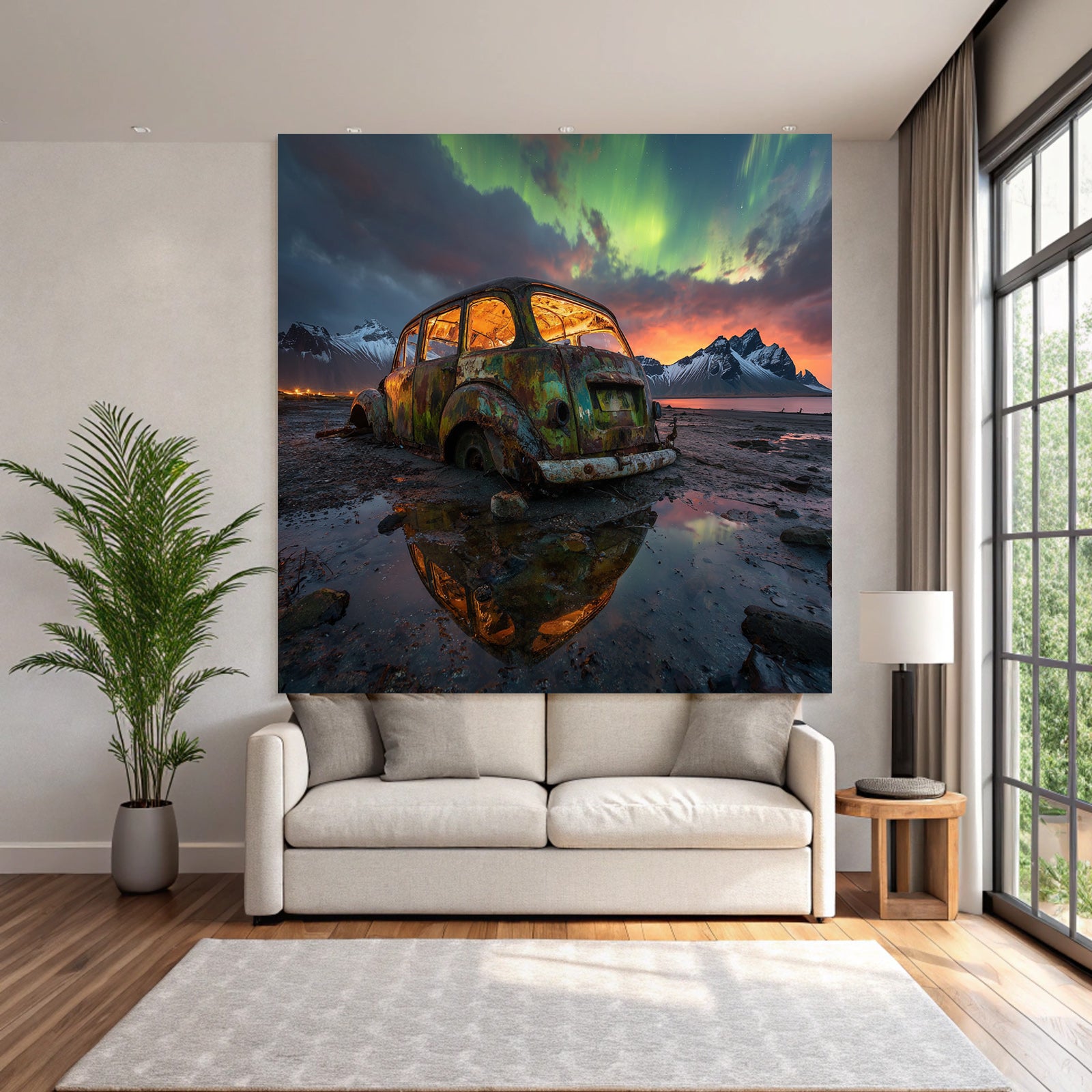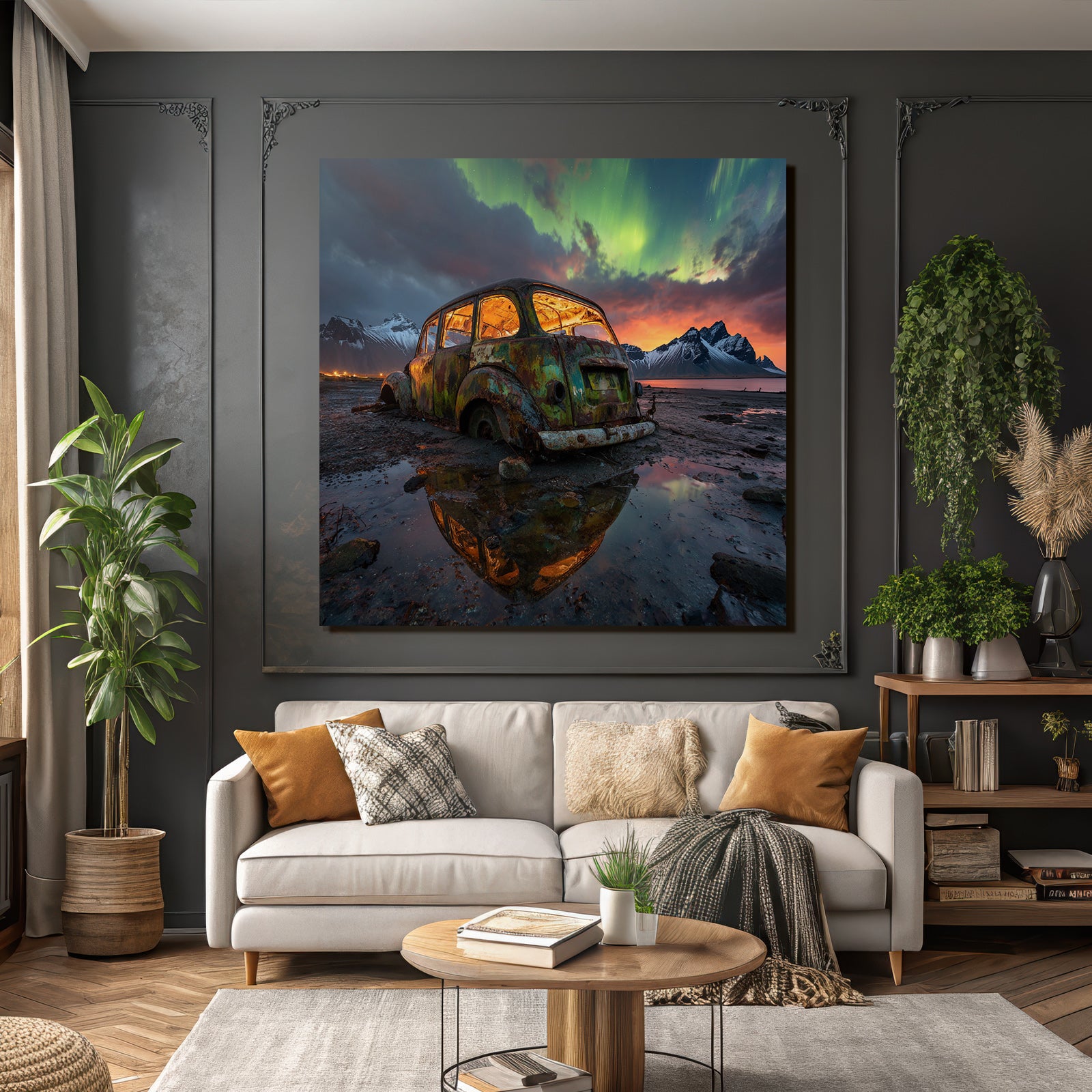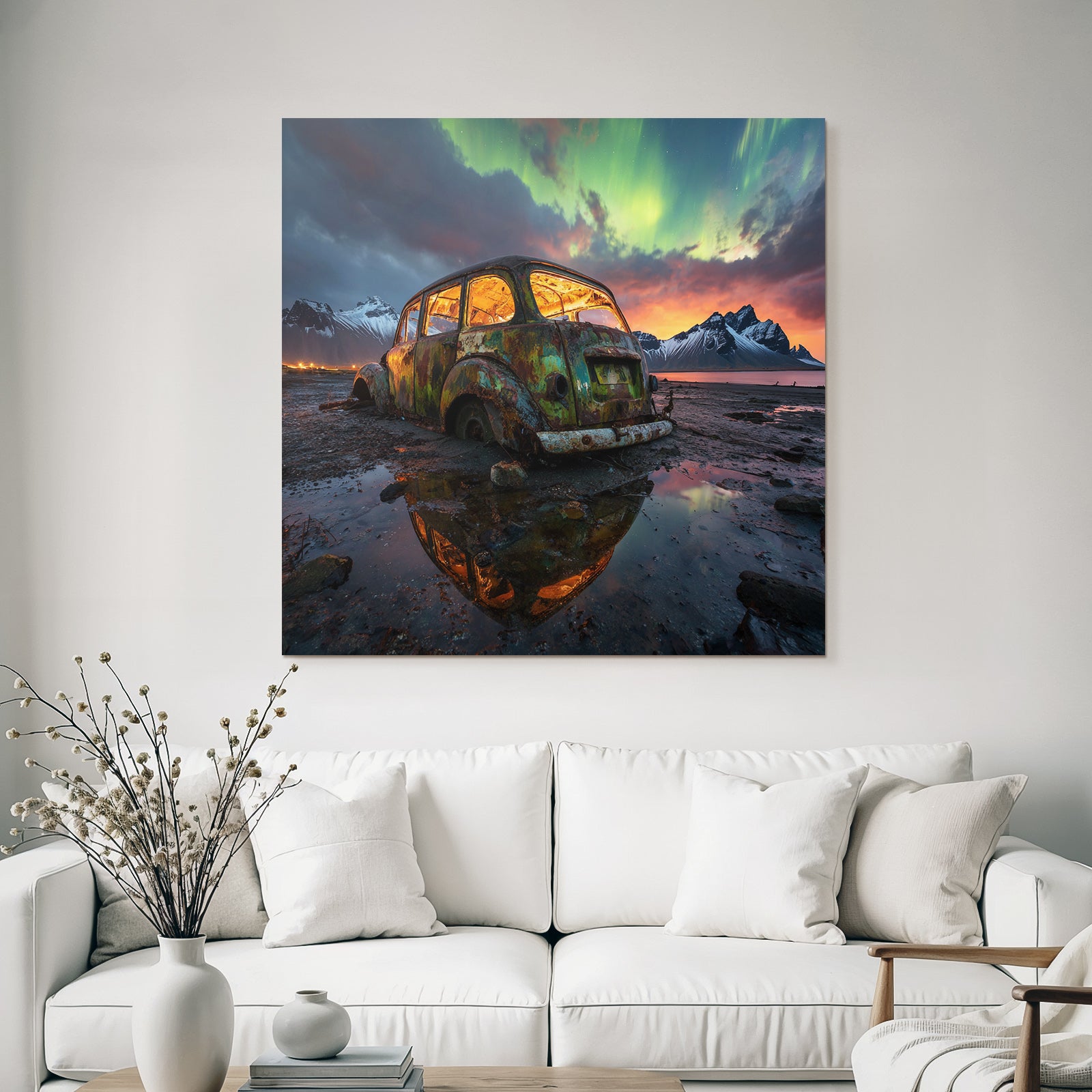 „Polarlicht Verlassener Rustiger Wagen In Natur Mit Aurora Borealis Im Himmel“ verleiht Ihrem Raum Charakter. Die Anlehnung an den Stil Fjorde und Gletscher, kombiniert mit der schlichten Eleganz des FameFrame™, schafft eine einzigartige Atmosphäre.