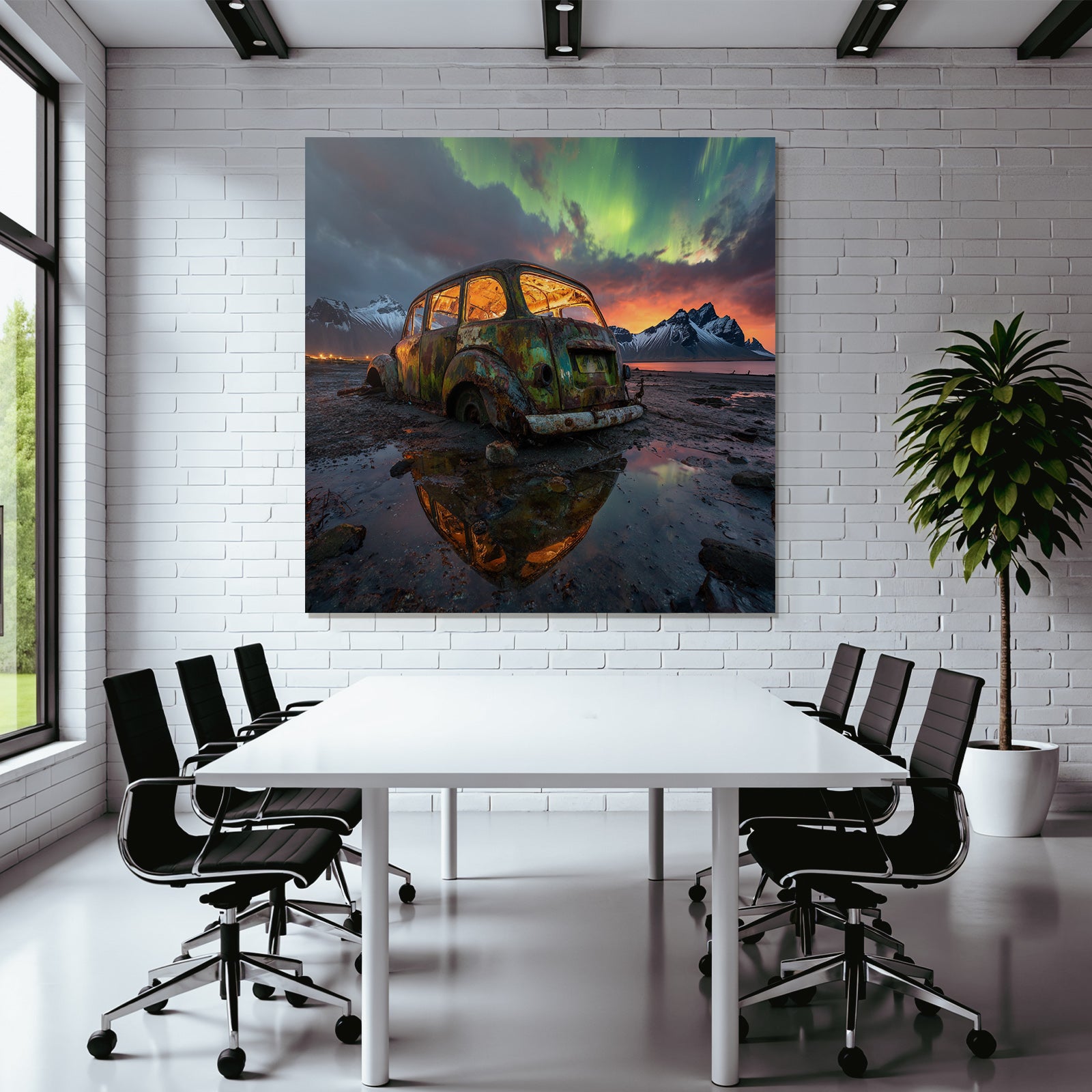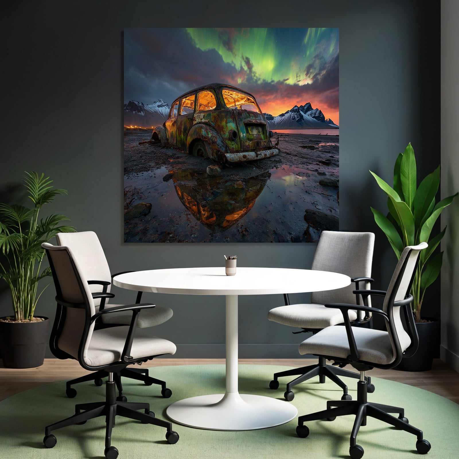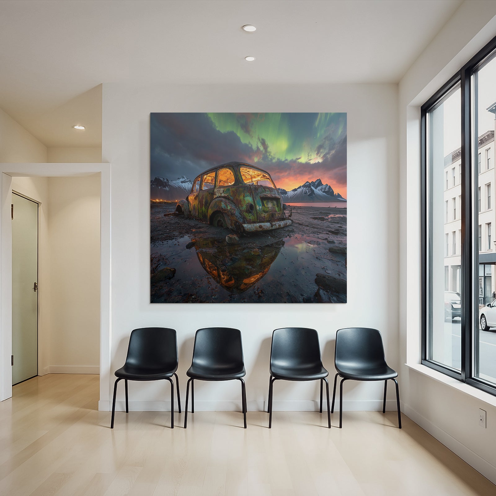 „Polarlicht Verlassener Rustiger Wagen In Natur Mit Aurora Borealis Im Himmel“ verleiht Ihrem Raum Charakter. Die Anlehnung an den Stil Fjorde und Gletscher, kombiniert mit der schlichten Eleganz des FameFrame™, schafft eine einzigartige Atmosphäre.