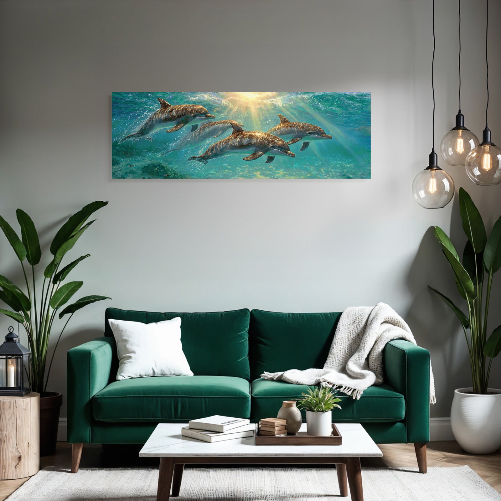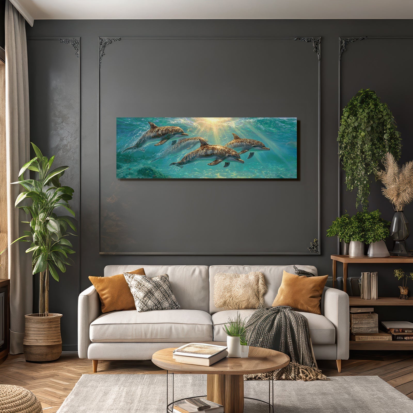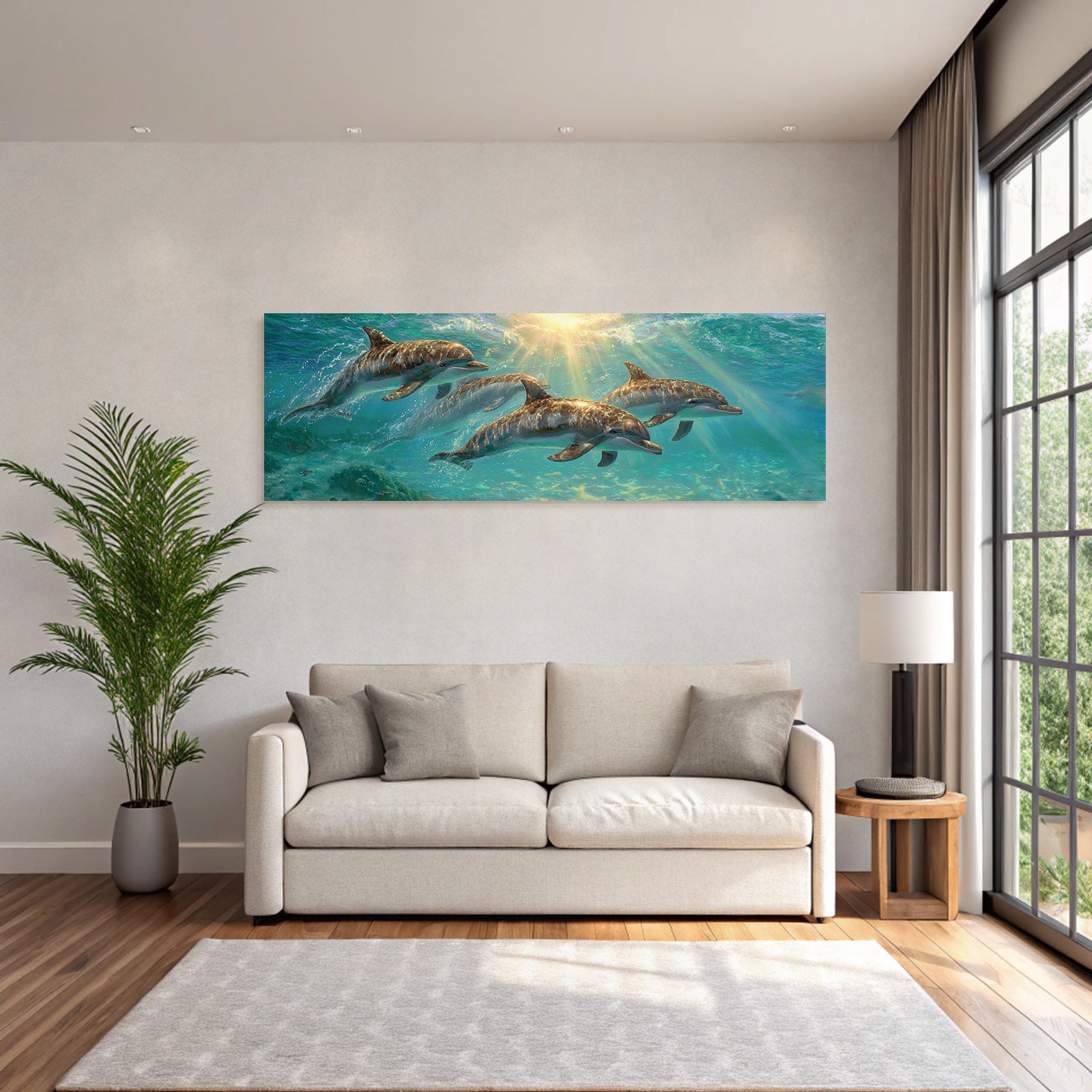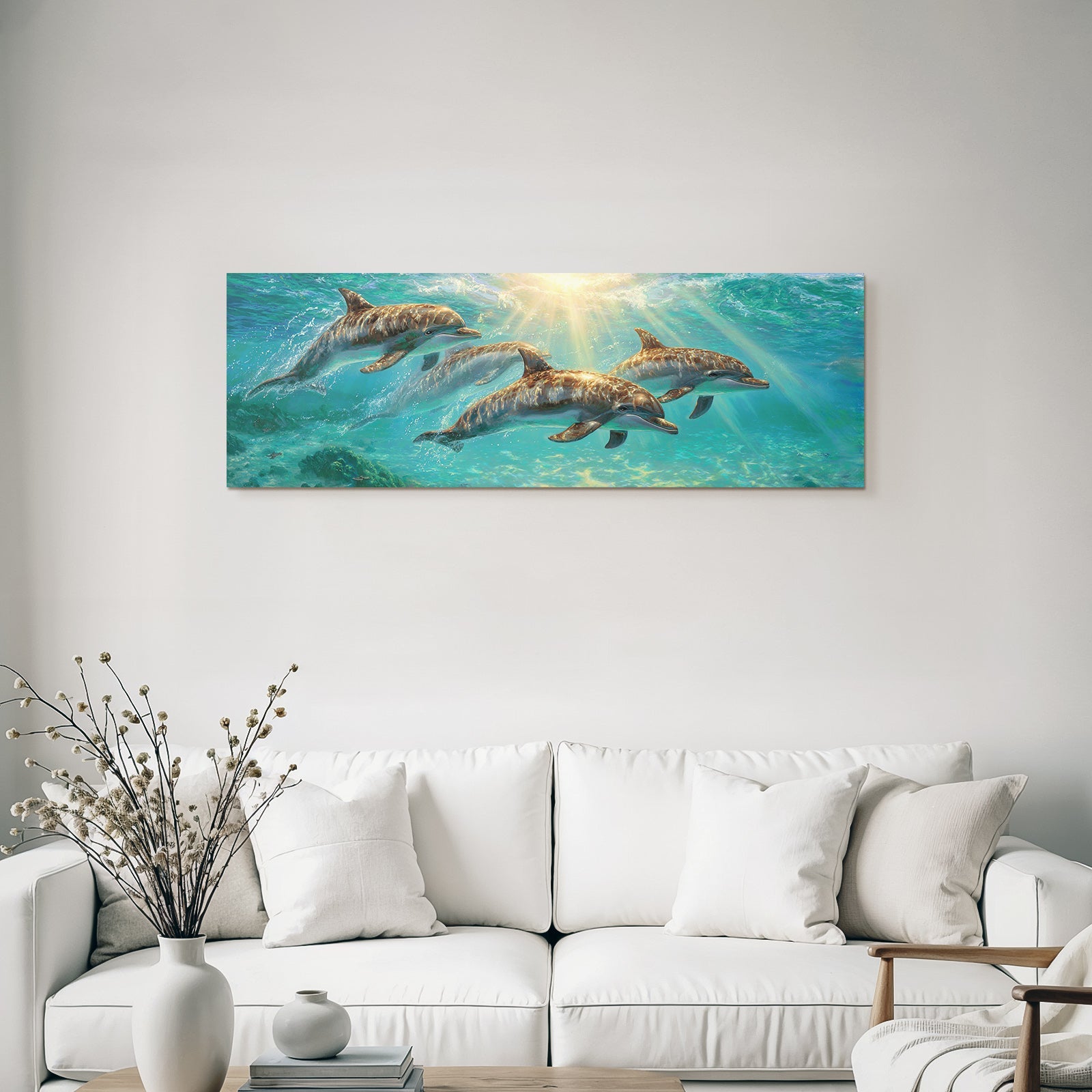 Setzen Sie im Flur oder Eingangsbereich ein erstes Willkommens-Statement. „Meeres Delfine Im Leuchtenden Unterwasserparadies“ im Stil Meerestiere zieht im FameFrame sofort alle Blicke auf sich.