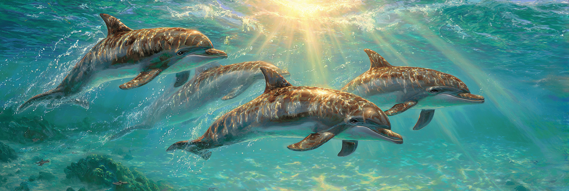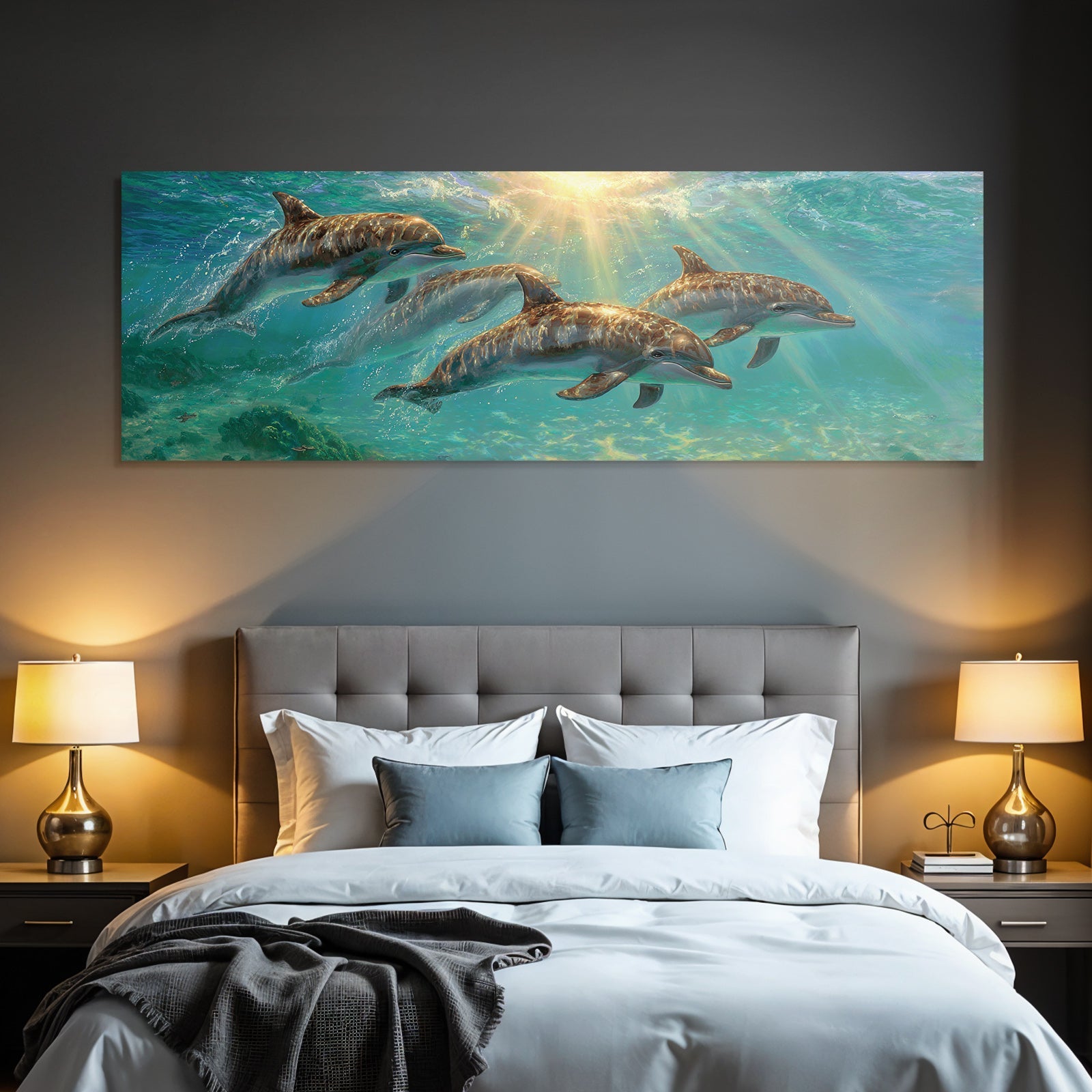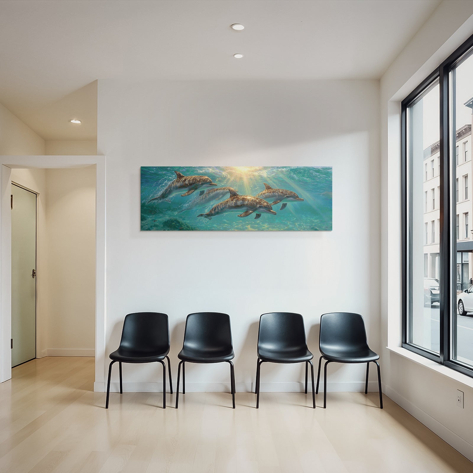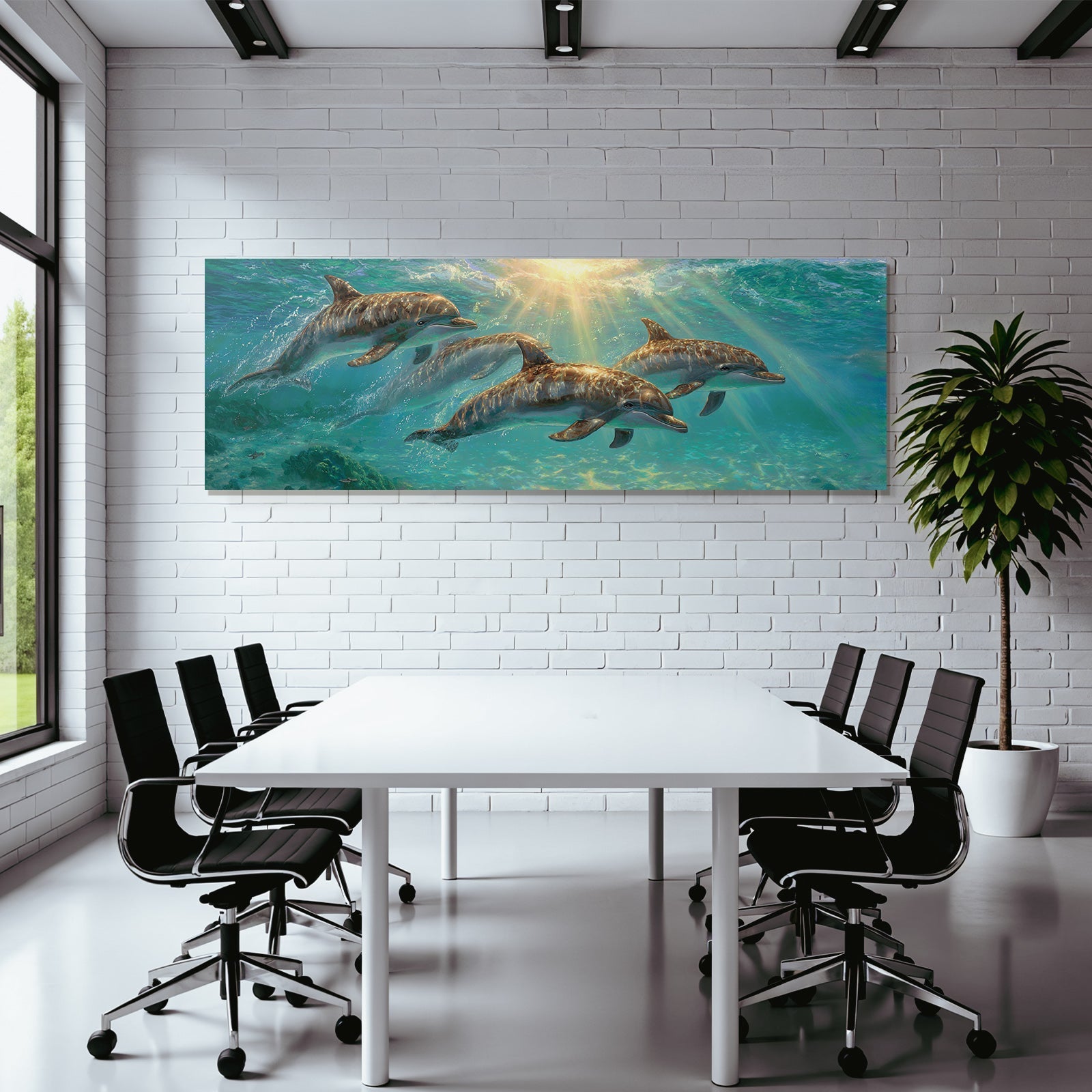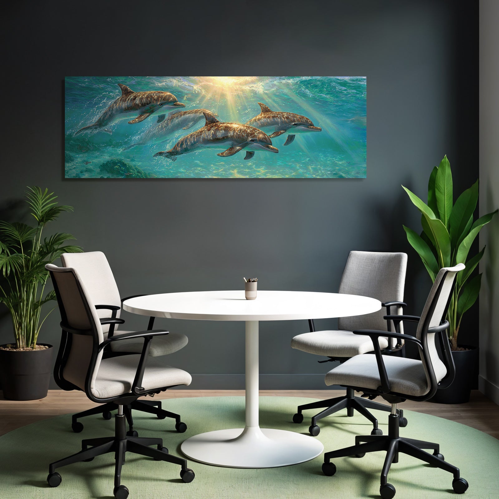 Setzen Sie im Flur oder Eingangsbereich ein erstes Willkommens-Statement. „Meeres Delfine Im Leuchtenden Unterwasserparadies“ im Stil Meerestiere zieht im FameFrame sofort alle Blicke auf sich.