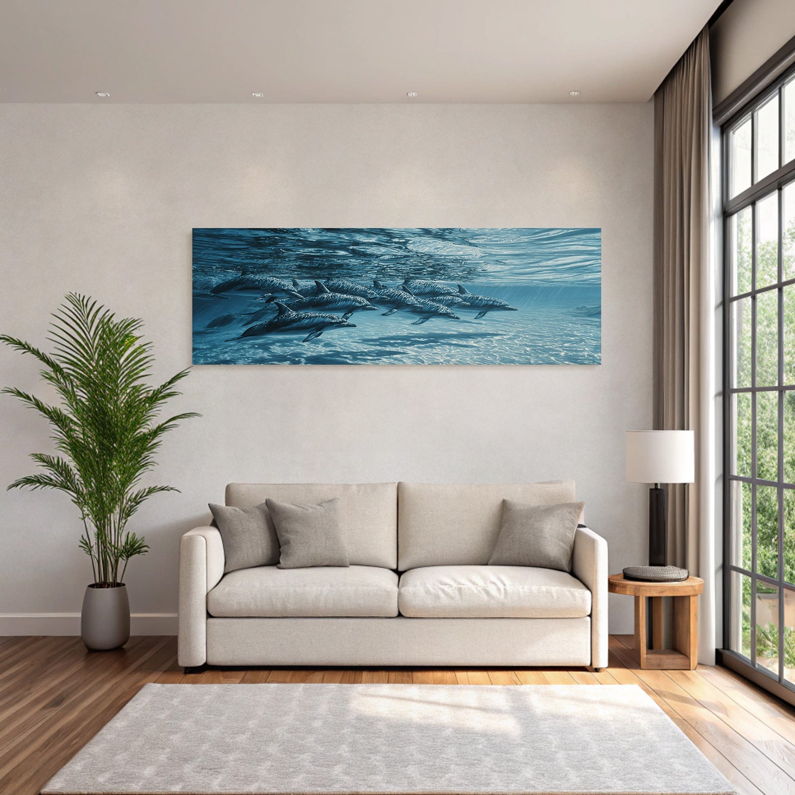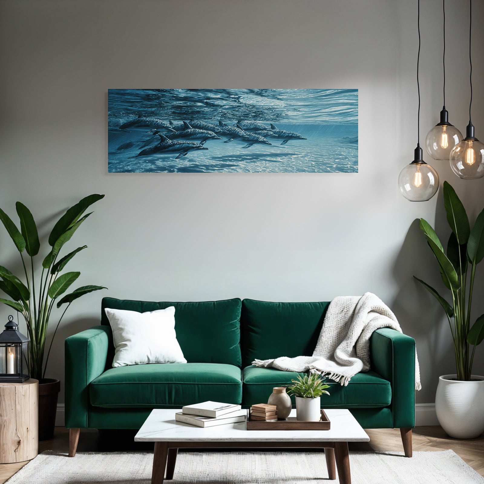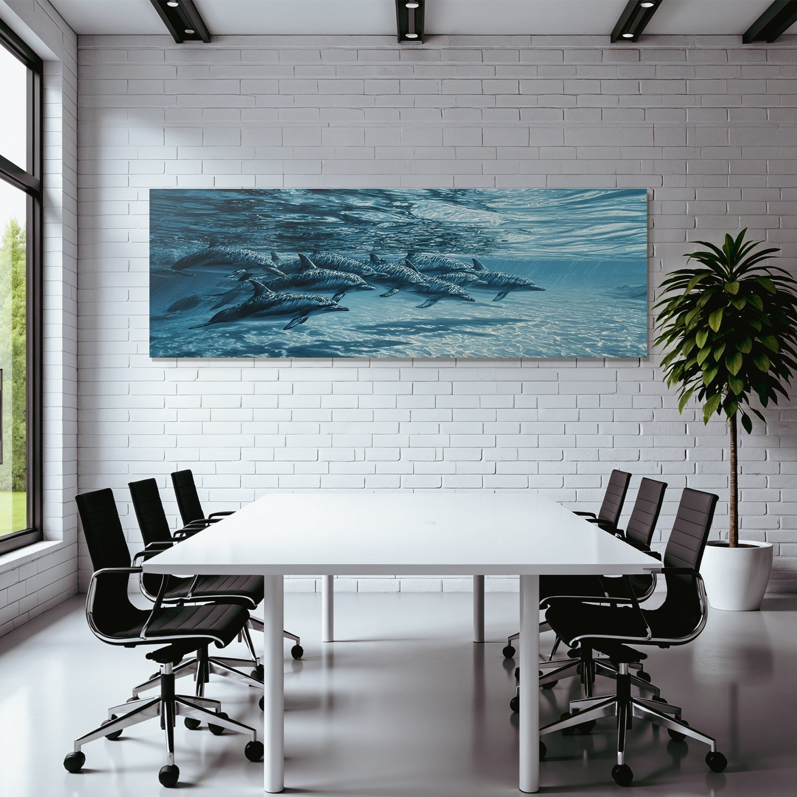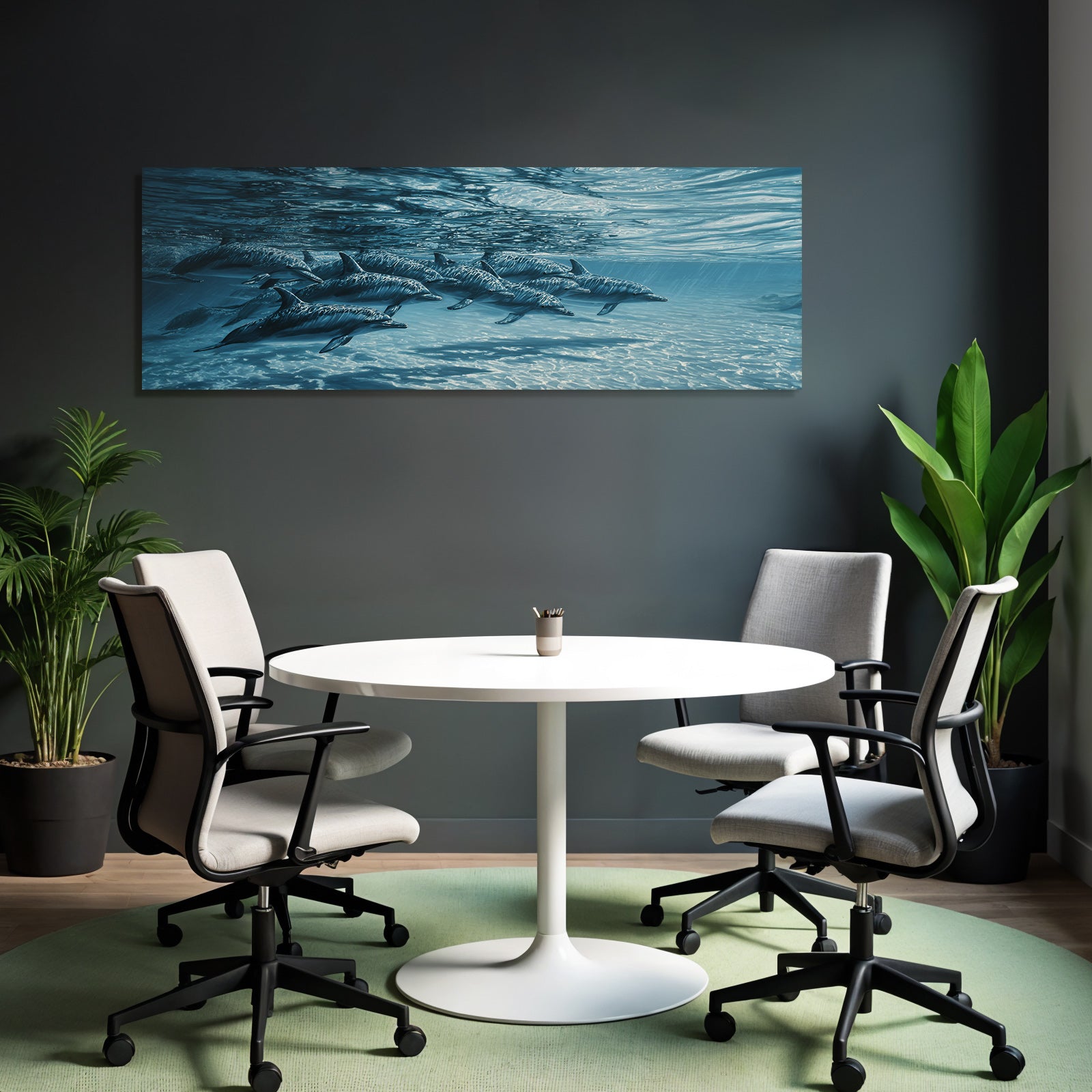 Gestalten Sie Ihr Homeoffice oder Büro inspirierend und modern. „Meeres Delfine Schwimmen Zusammen Unterwasser“ im Meerestiere-Look sorgt im FameFrame für eine kreative Arbeitsatmosphäre.