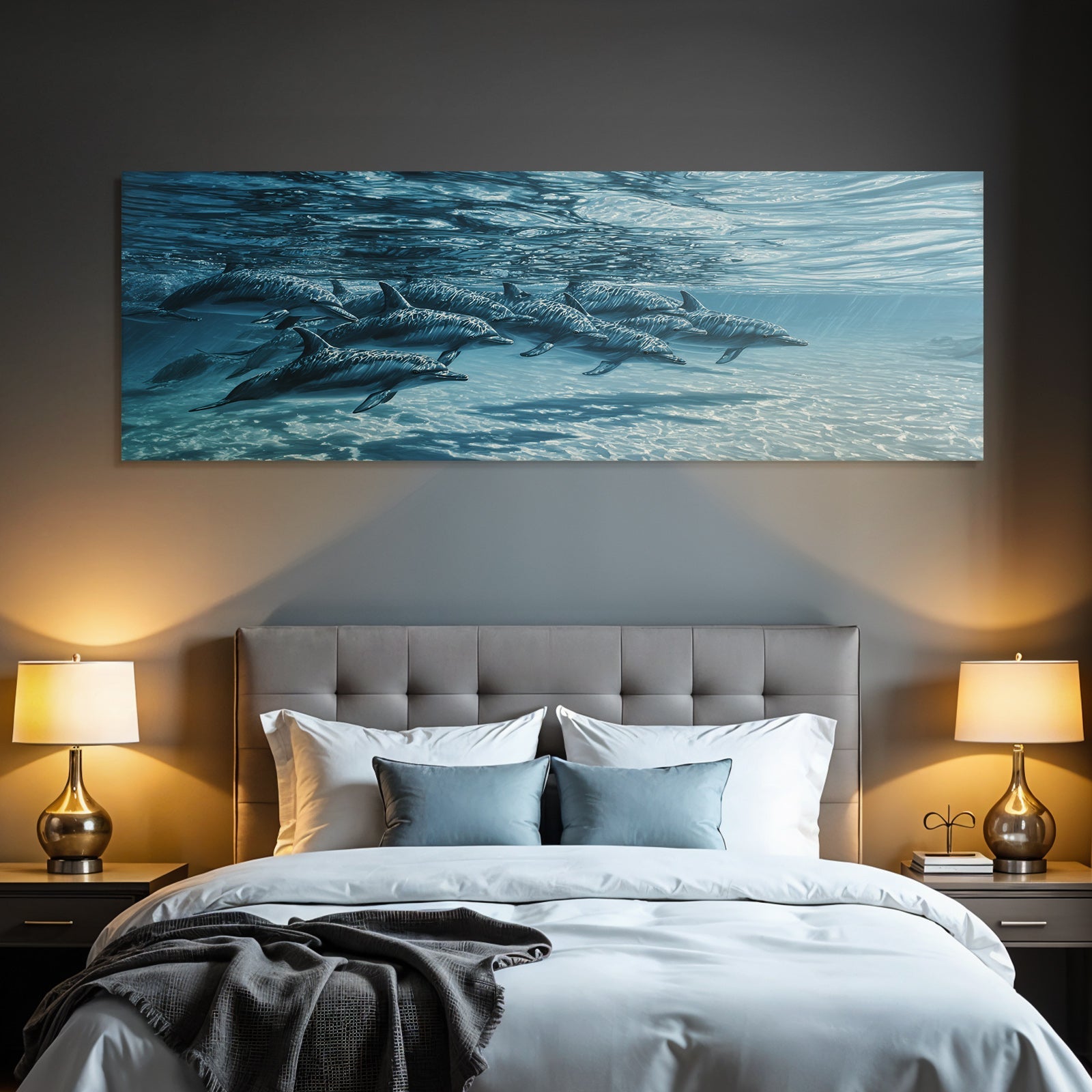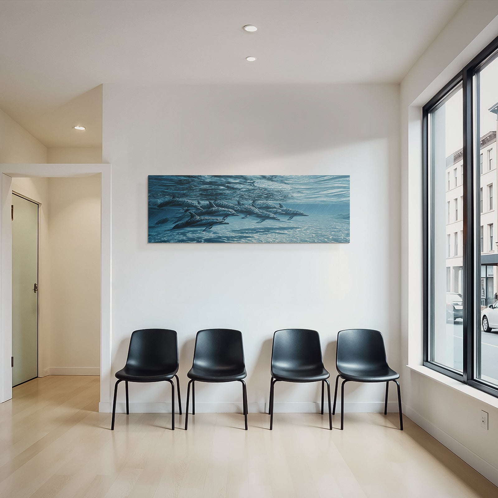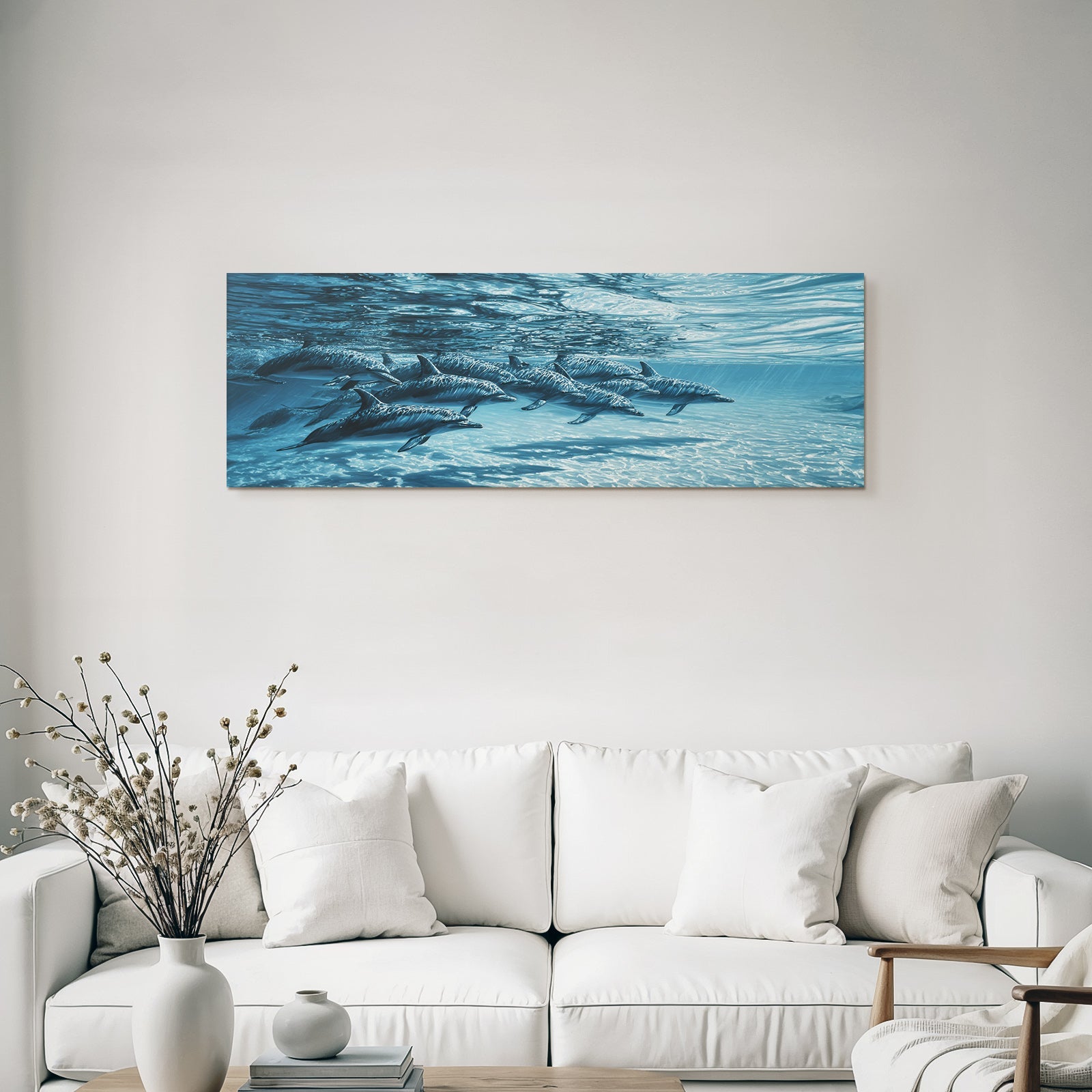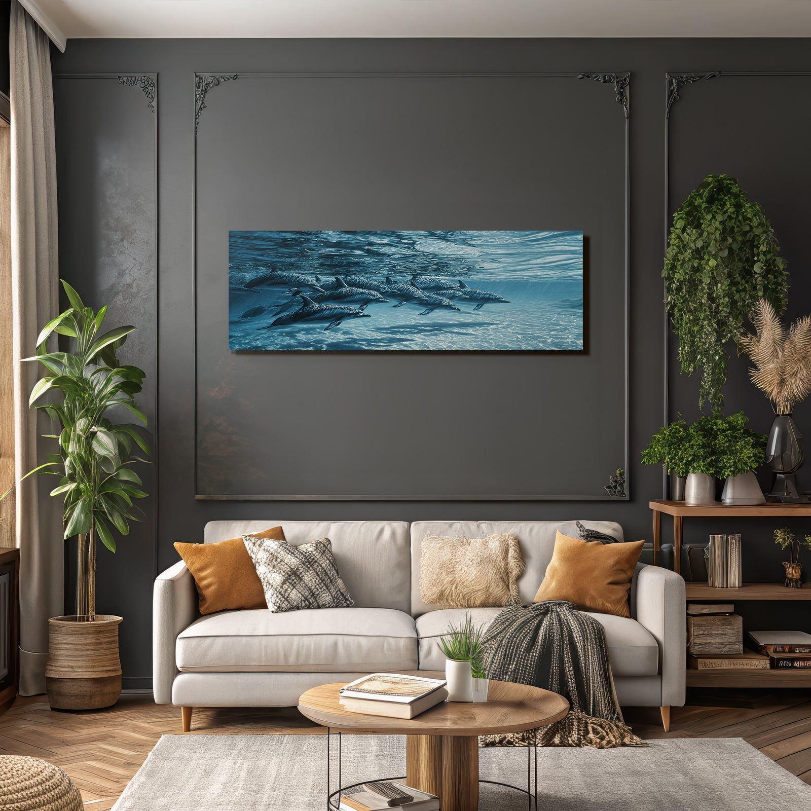 Gestalten Sie Ihr Homeoffice oder Büro inspirierend und modern. „Meeres Delfine Schwimmen Zusammen Unterwasser“ im Meerestiere-Look sorgt im FameFrame für eine kreative Arbeitsatmosphäre.