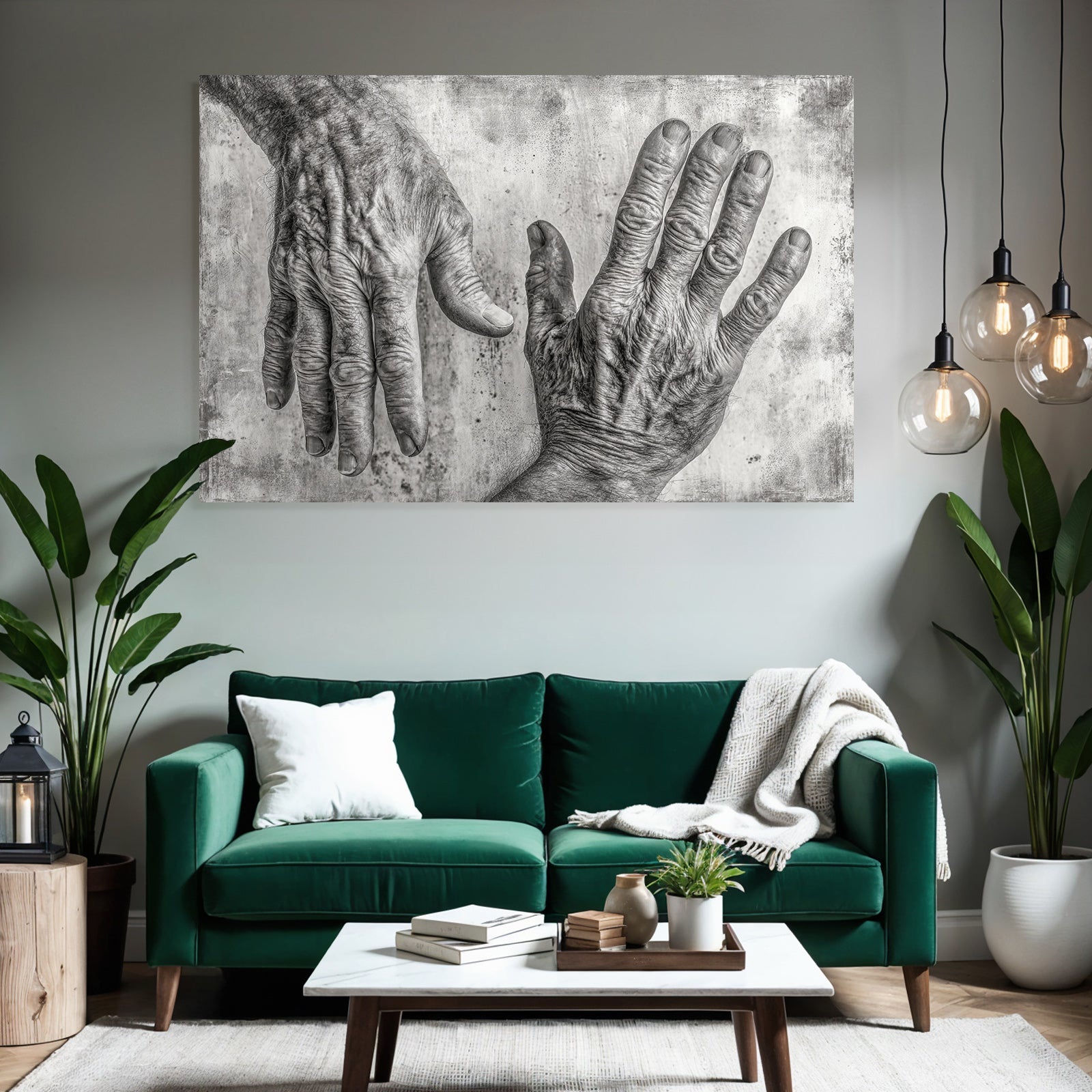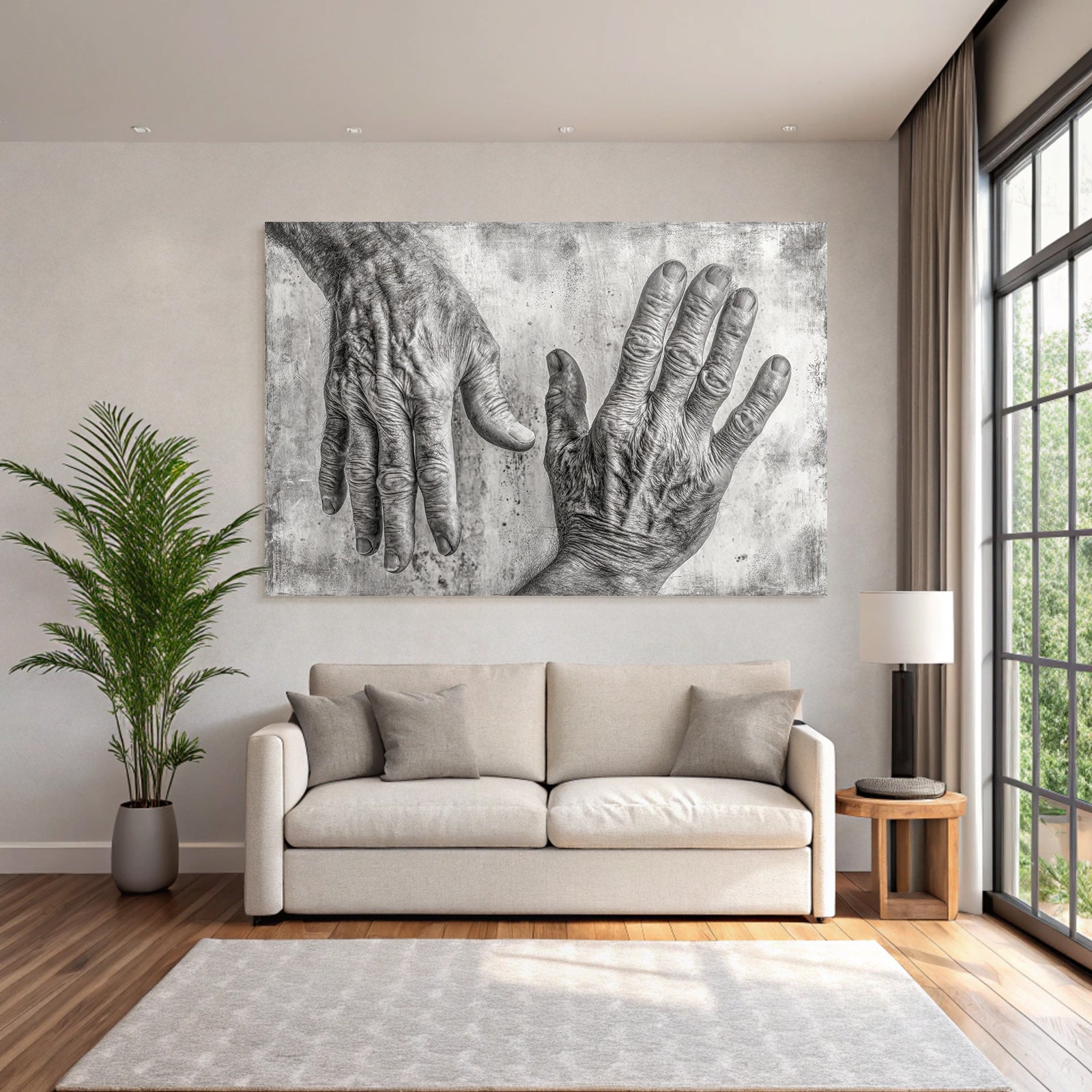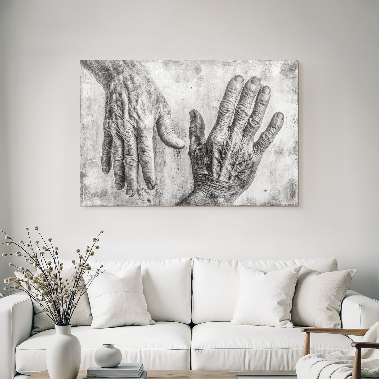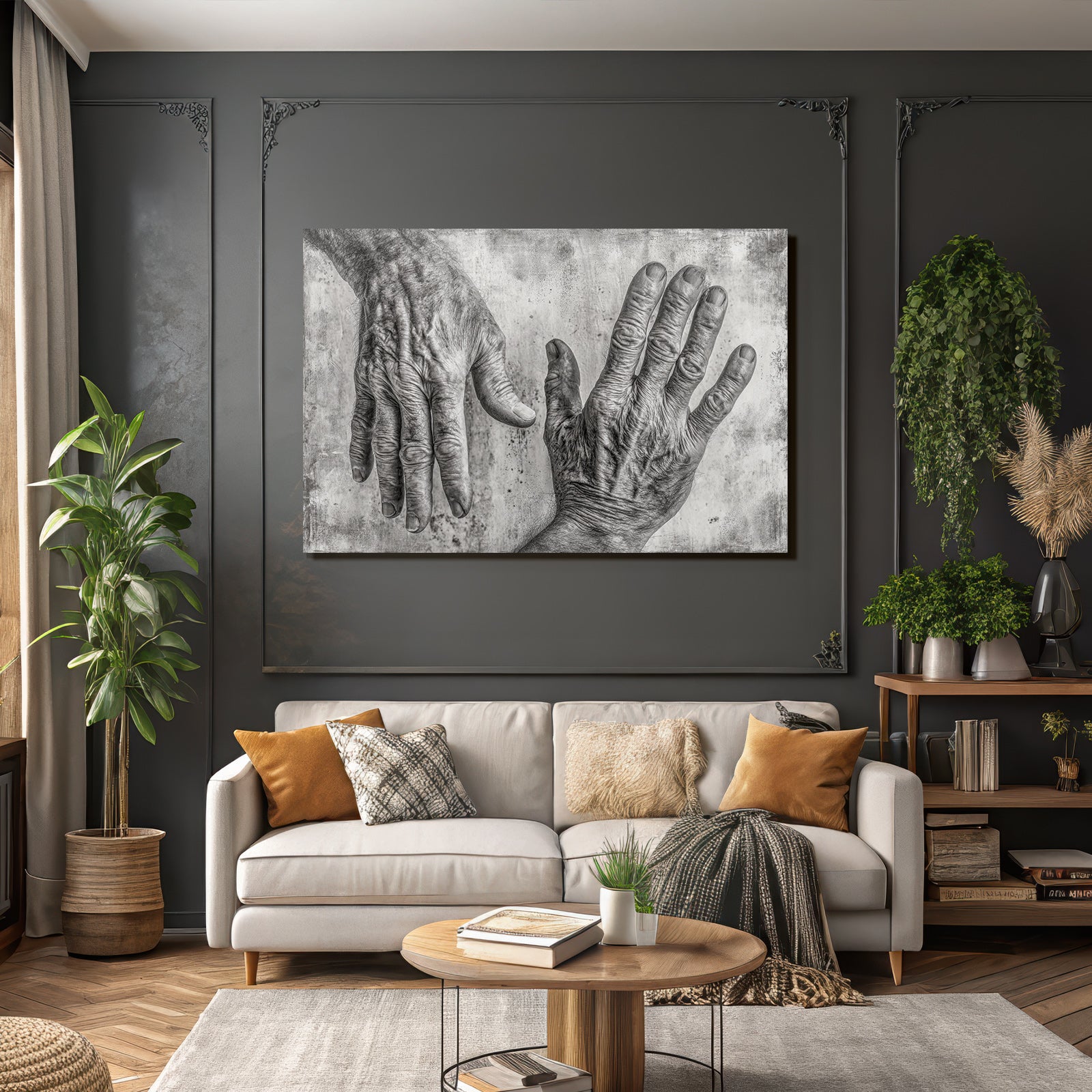 Erleben Sie die pure Essenz von Hände und Gestik. Das Werk „Alte Hände Im Schwarz Weiss“ wird durch den hochwertigen Textildruck im FameFrame™ zu einem Statement-Piece.