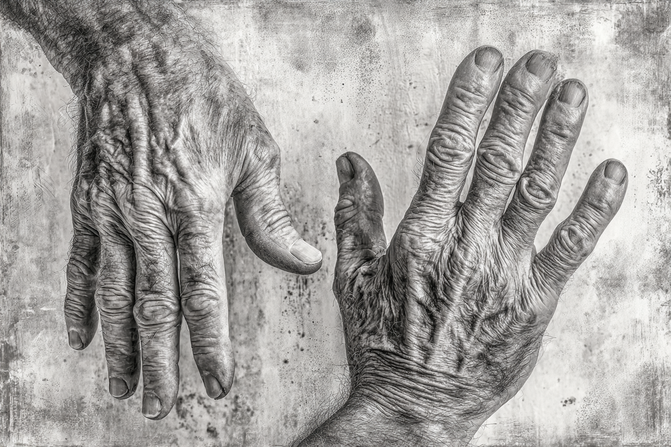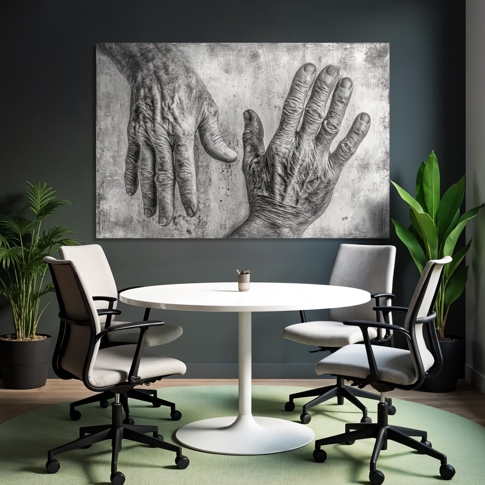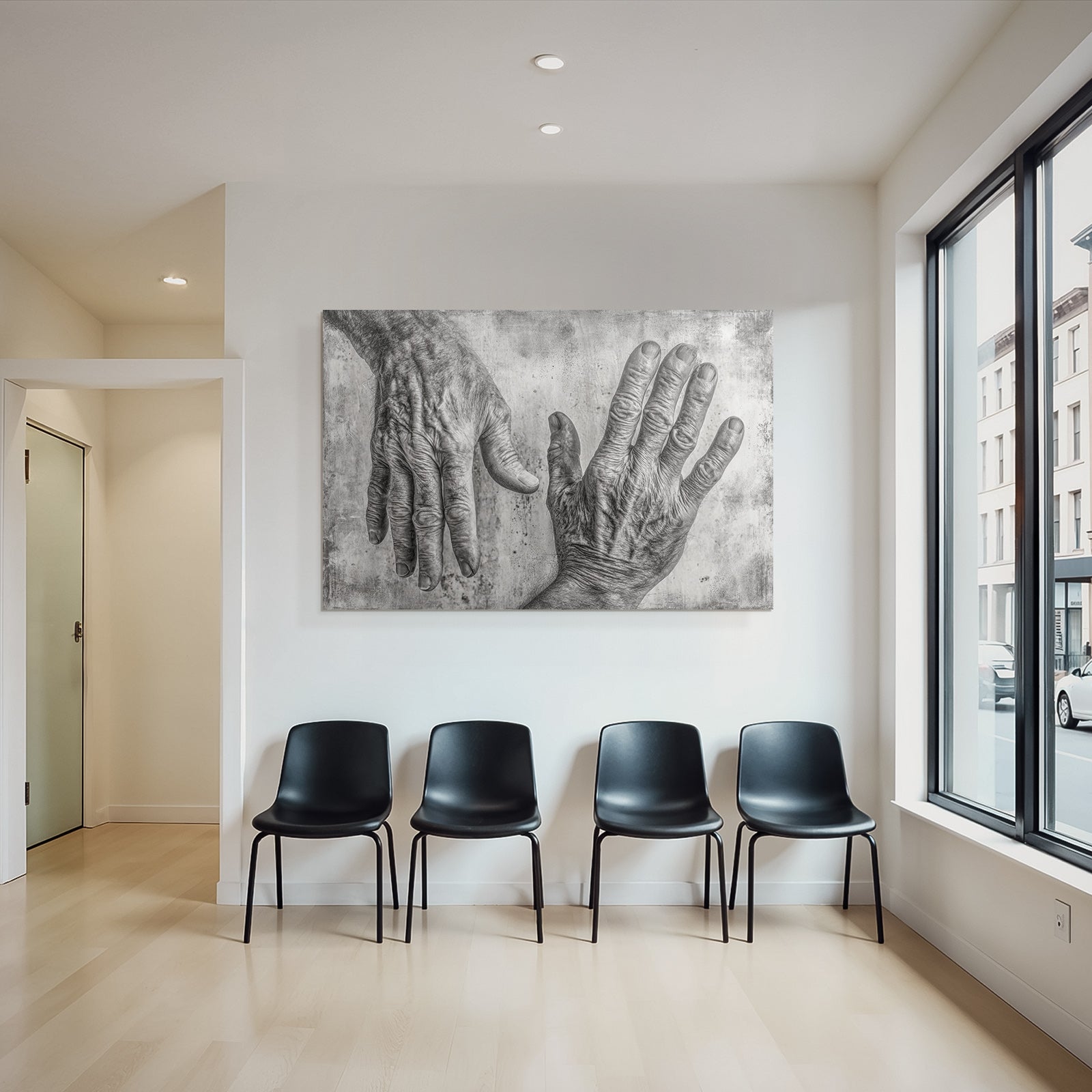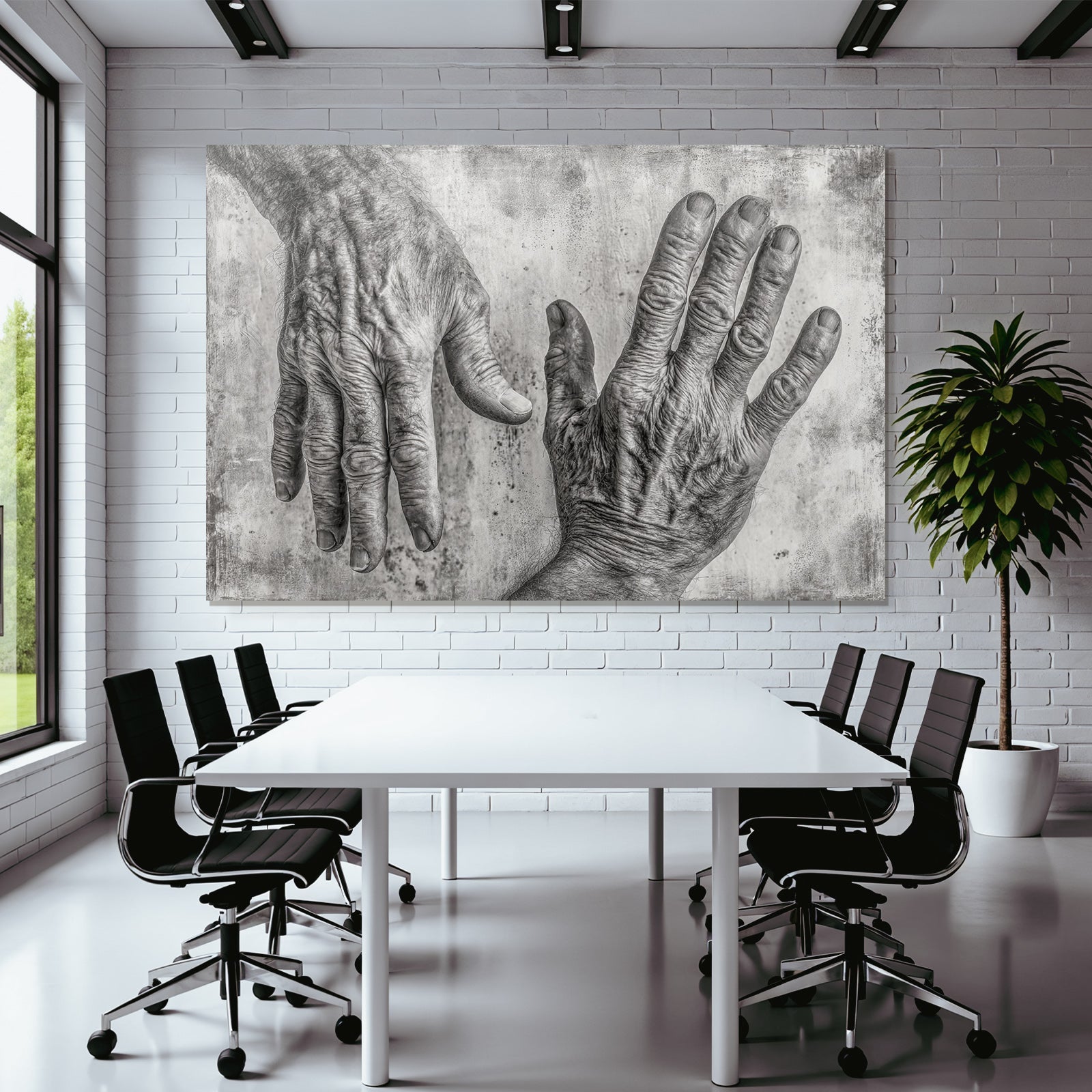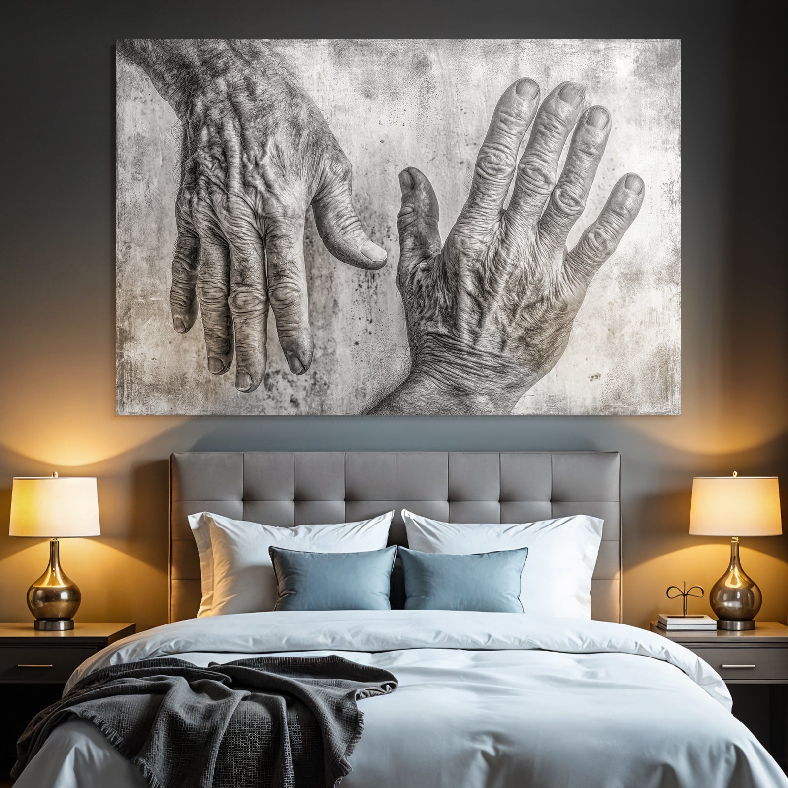 Erleben Sie die pure Essenz von Hände und Gestik. Das Werk „Alte Hände Im Schwarz Weiss“ wird durch den hochwertigen Textildruck im FameFrame™ zu einem Statement-Piece.